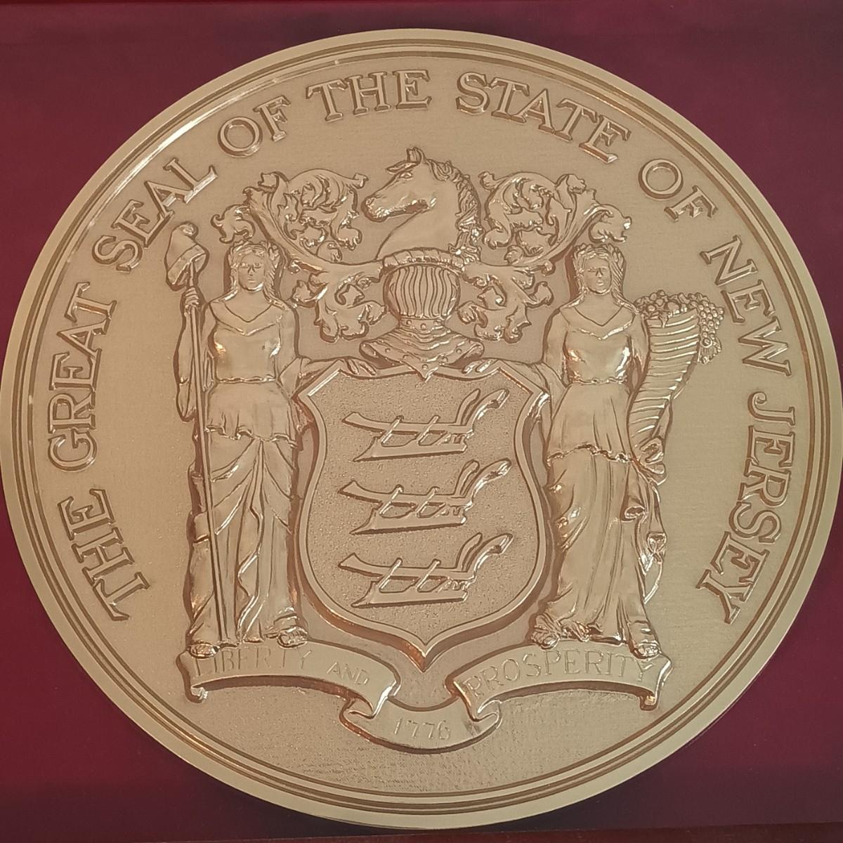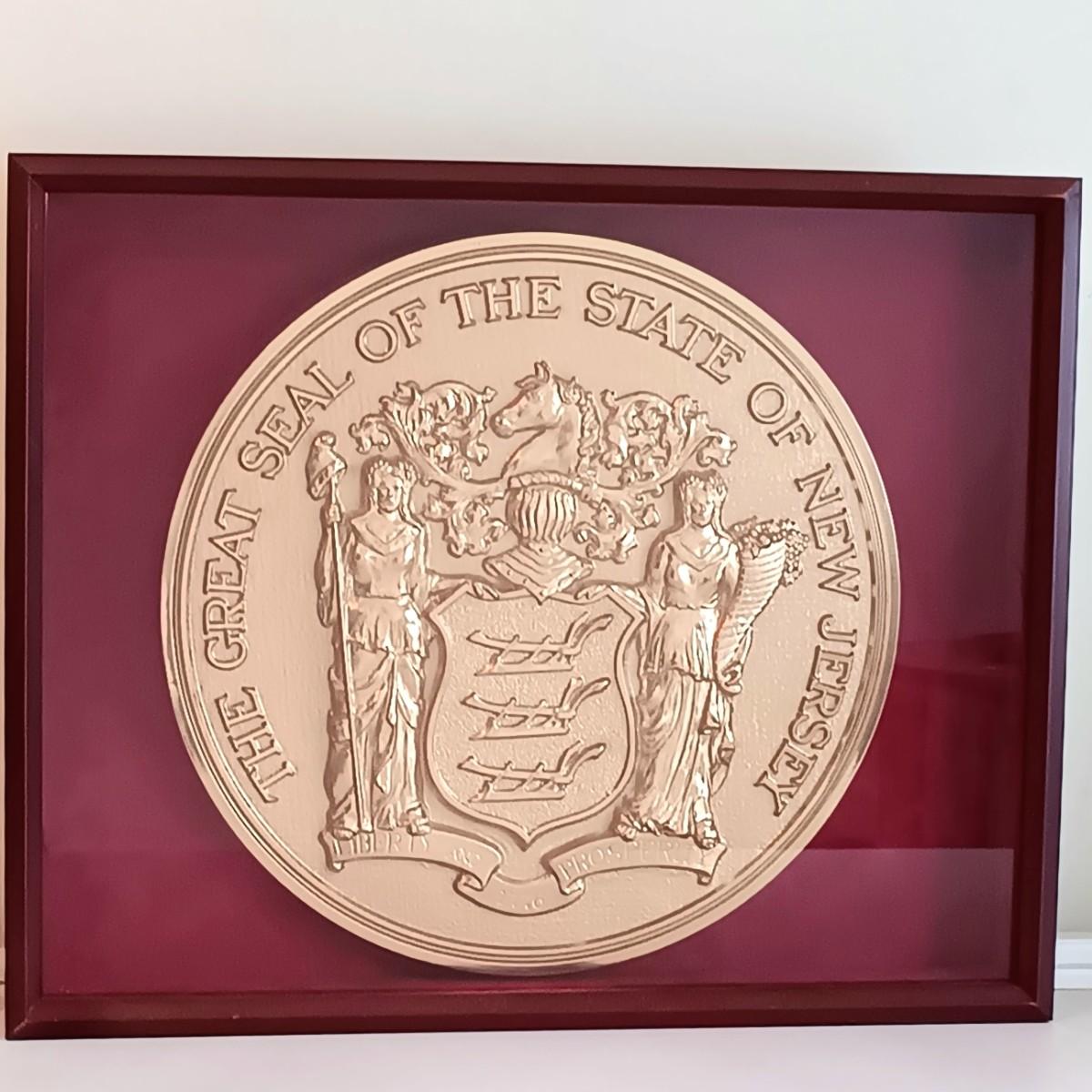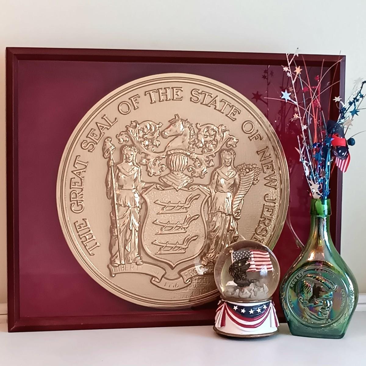 LOT 9U: Framed NJ State Seal Wall Plaque w/ Vintage Wheaton Glass Bottle & Snowglobe