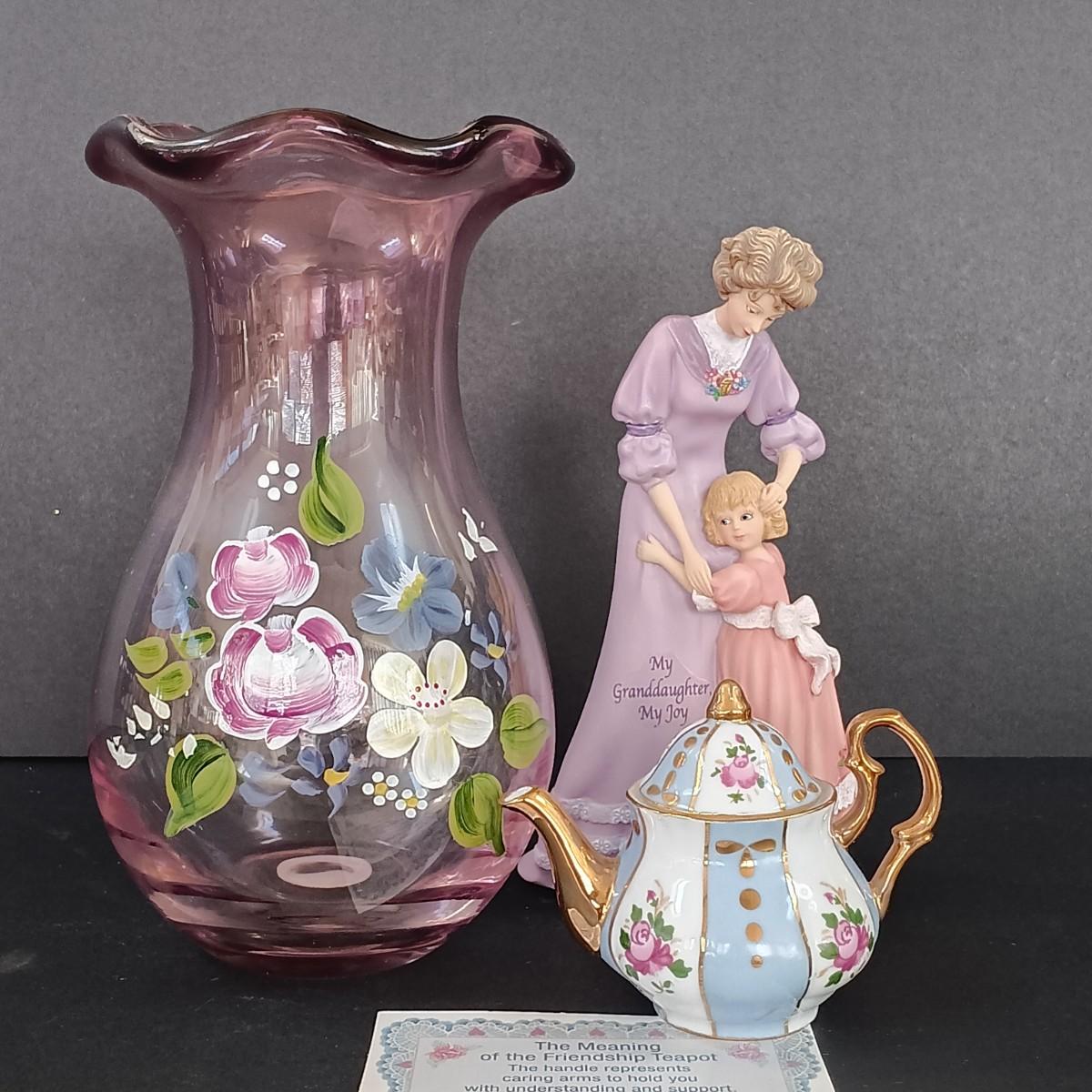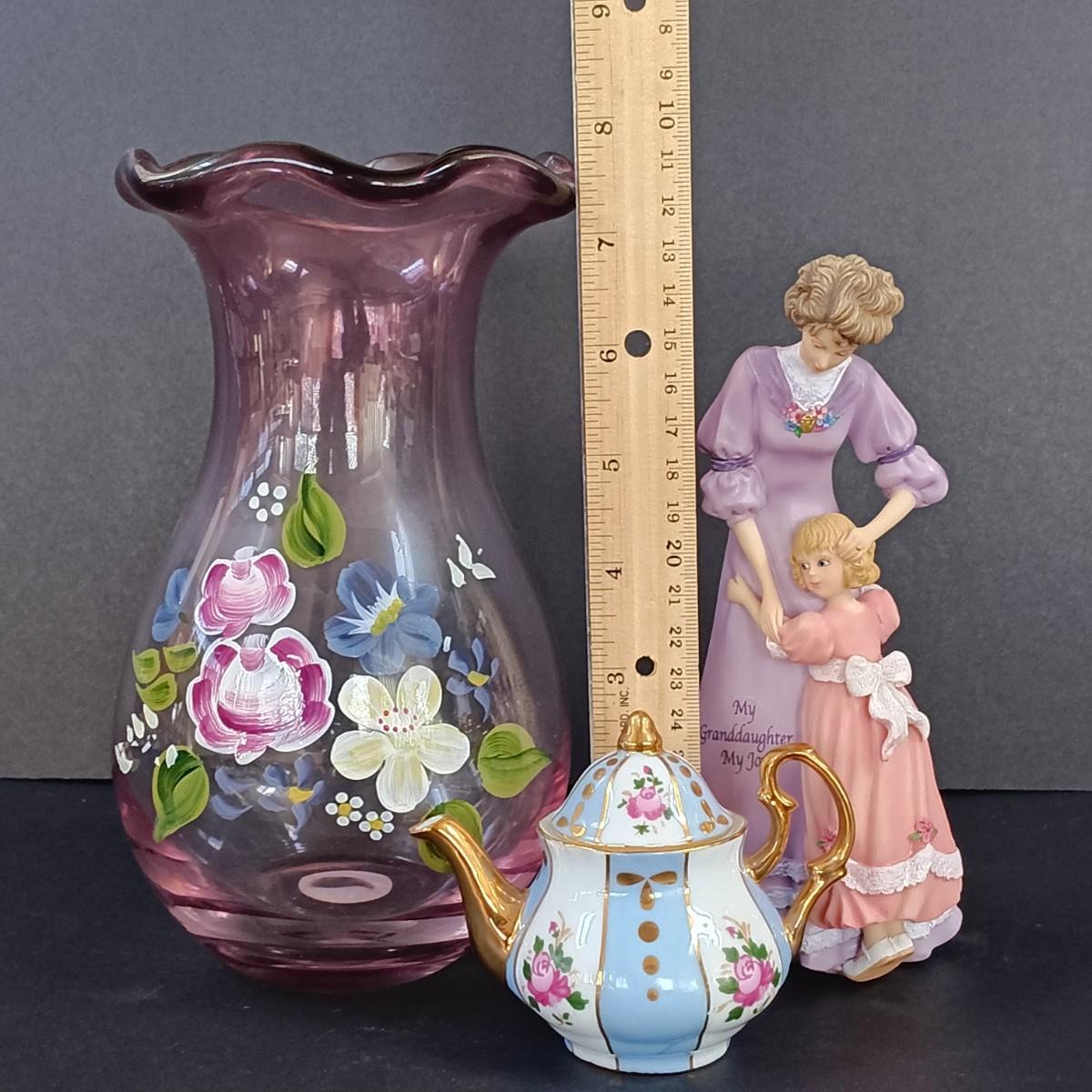 LOT 28S: Fenton Designed Telefloral Vase w/ Thomas Kinkade 'My Granddaughter, My Joy' Figurine & Mini Teapot