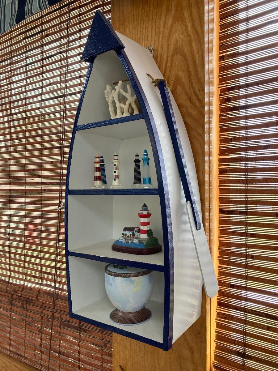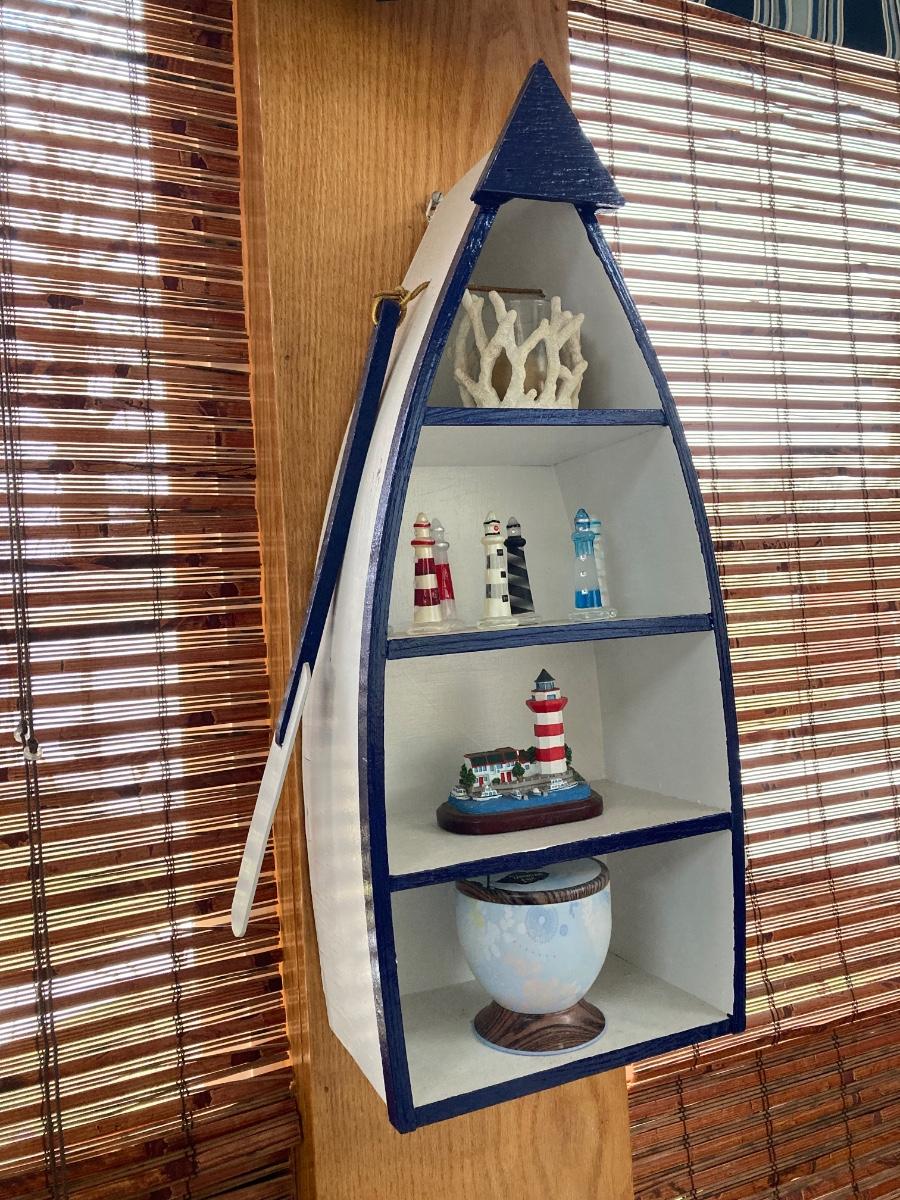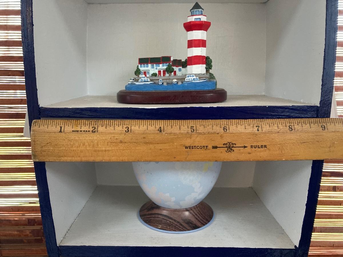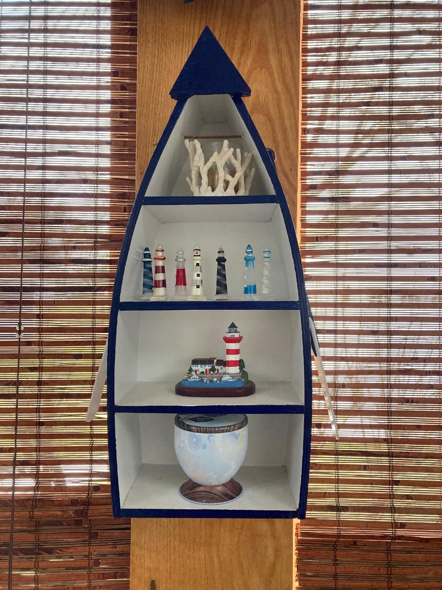 LOT 68S: Blue and White Wooden Boat Shelf with Collection of Glass Lighthouses, Candles and More