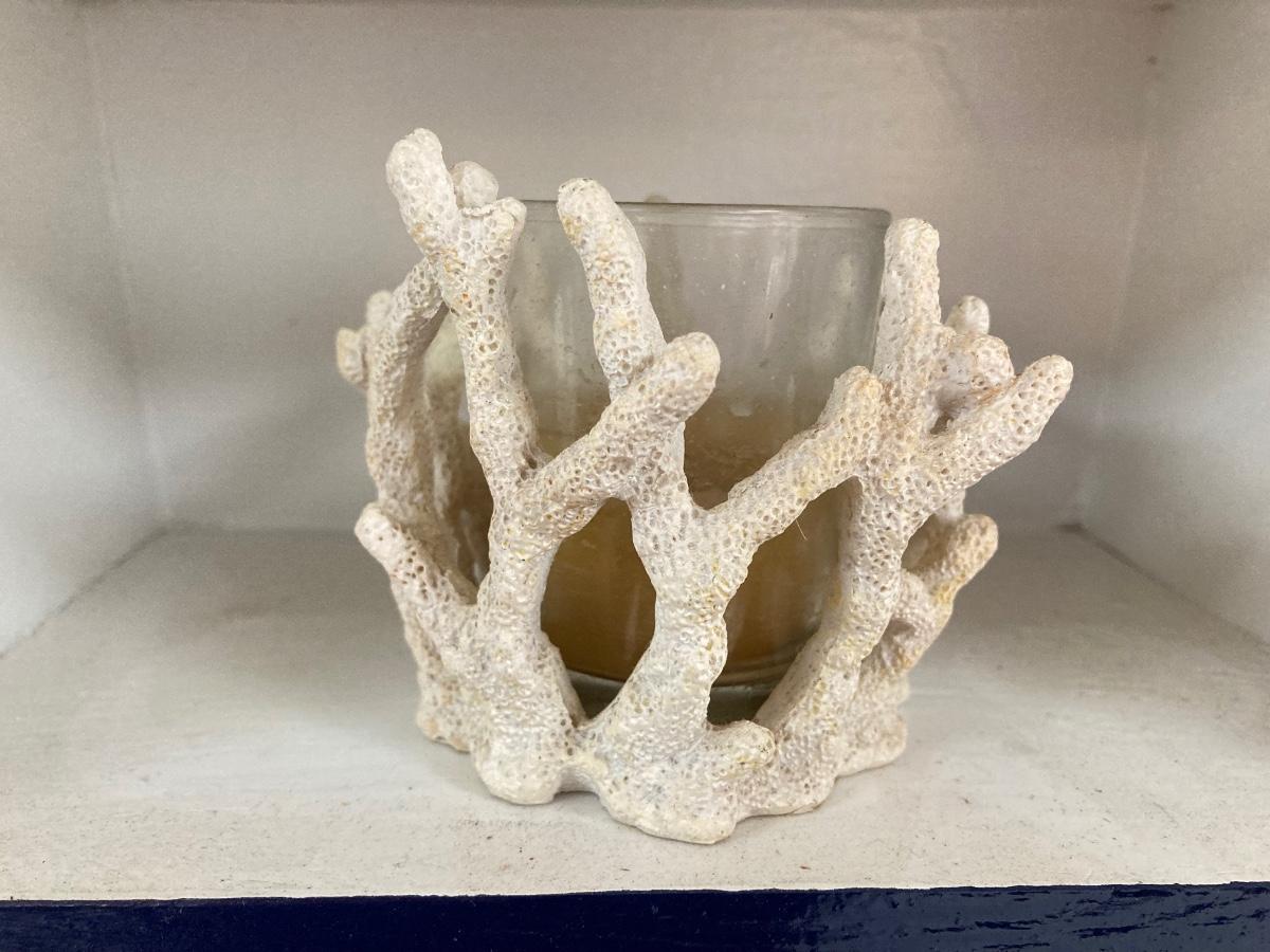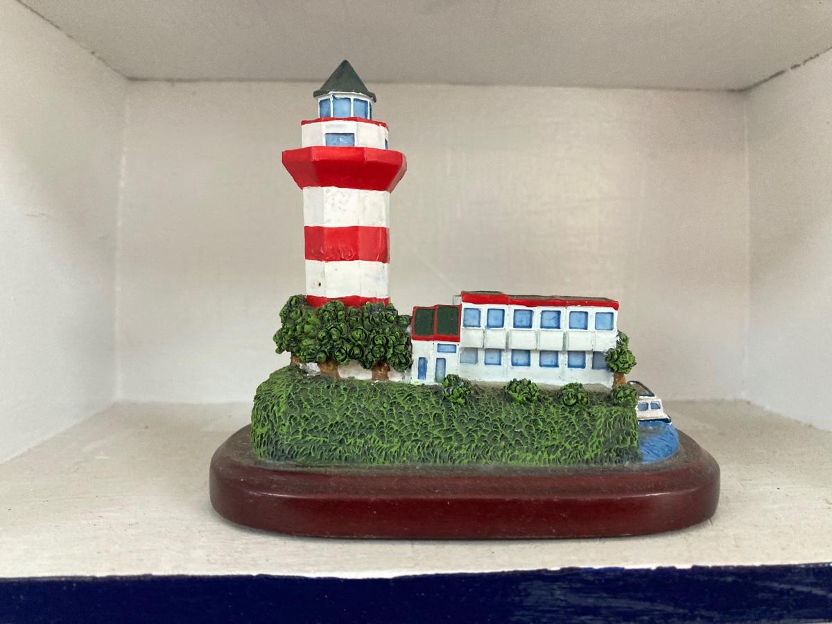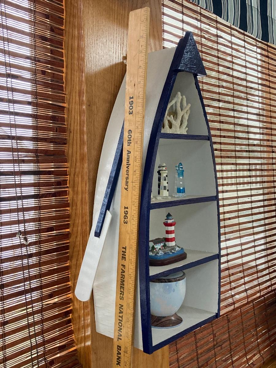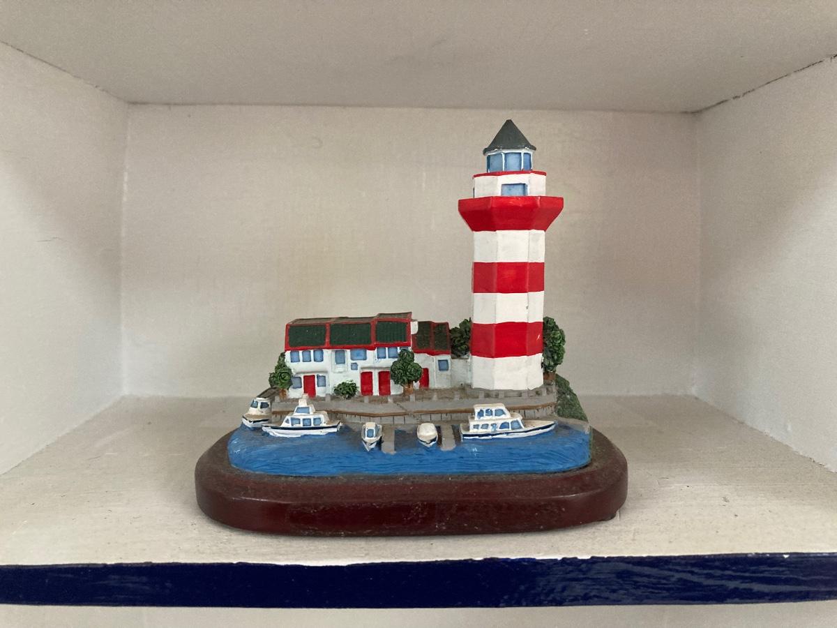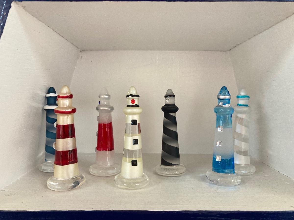 LOT 68S: Blue and White Wooden Boat Shelf with Collection of Glass Lighthouses, Candles and More