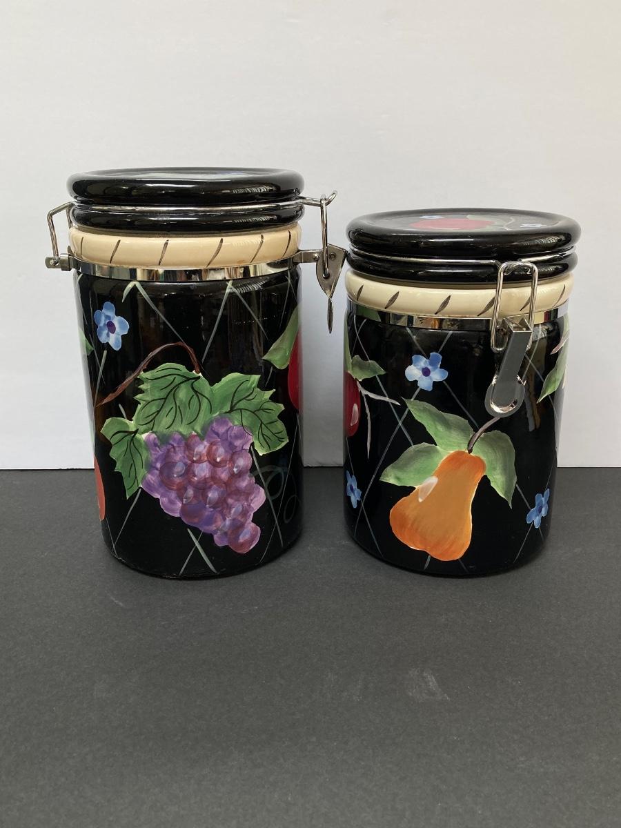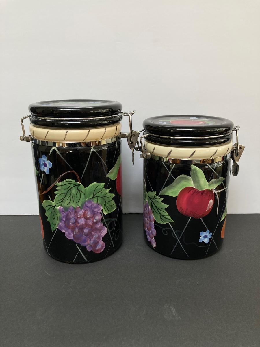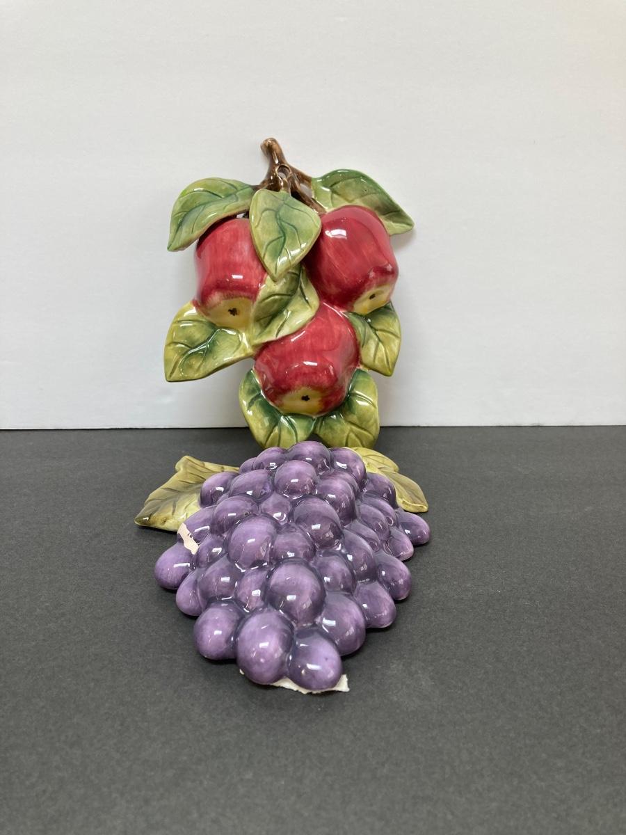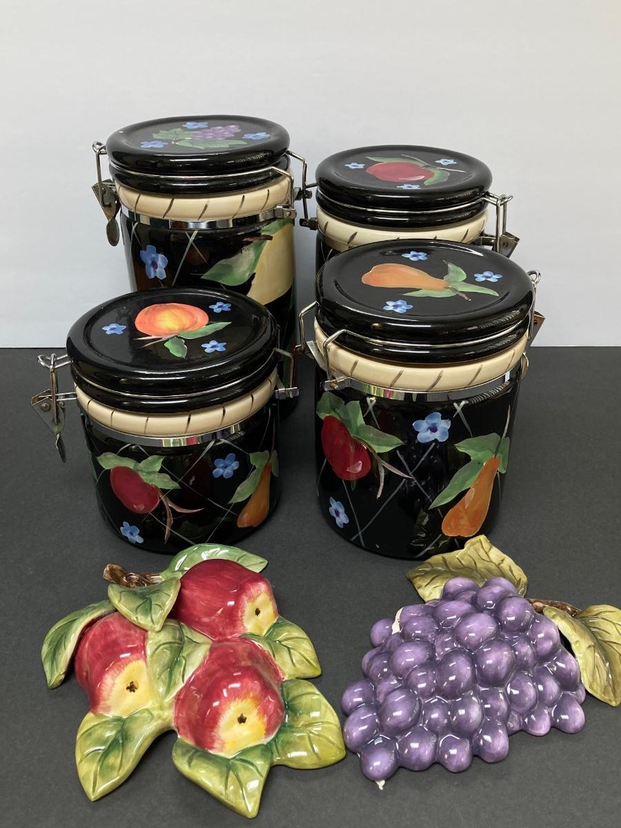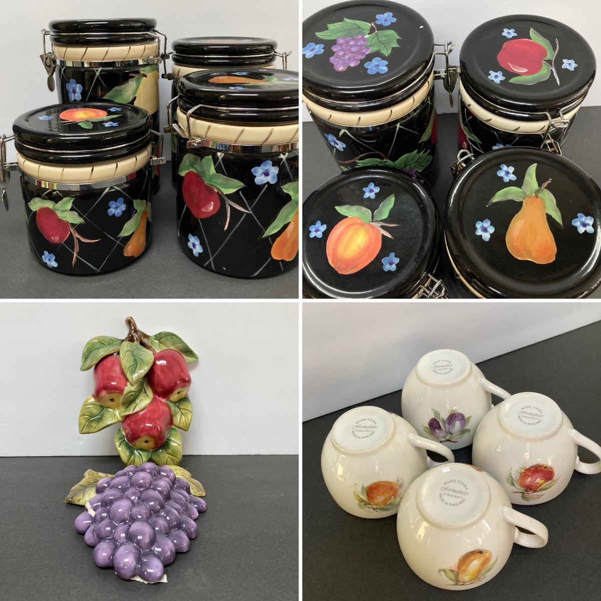 LOT 74S: Hand Painted Fruit - Patricia Brubaker Certified International Canister Set, Baum Bros "Formalities" Cups and Home Interiors Wall Plaques