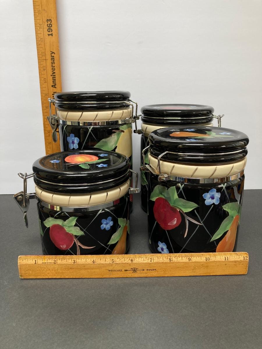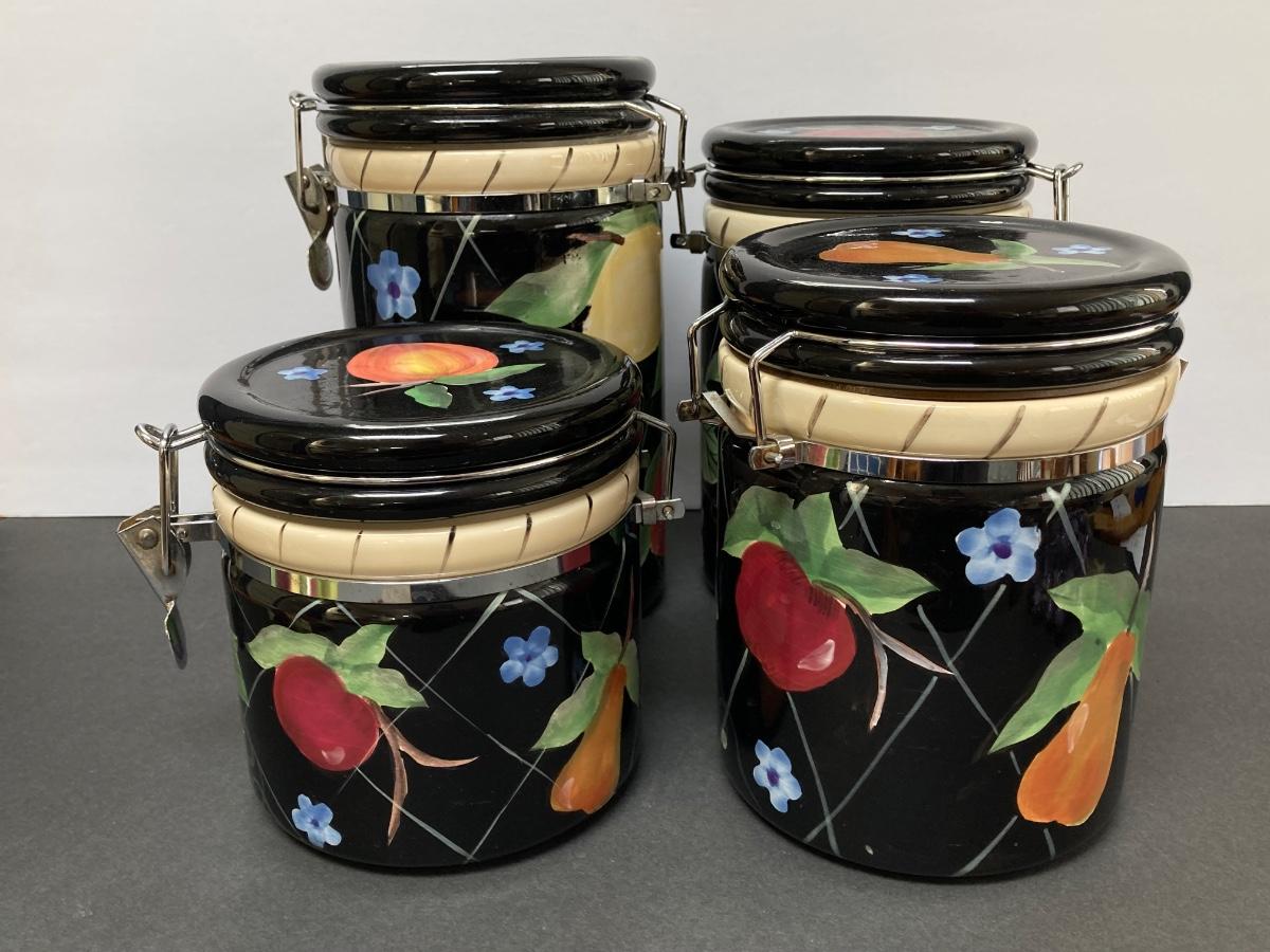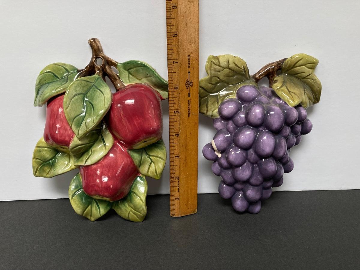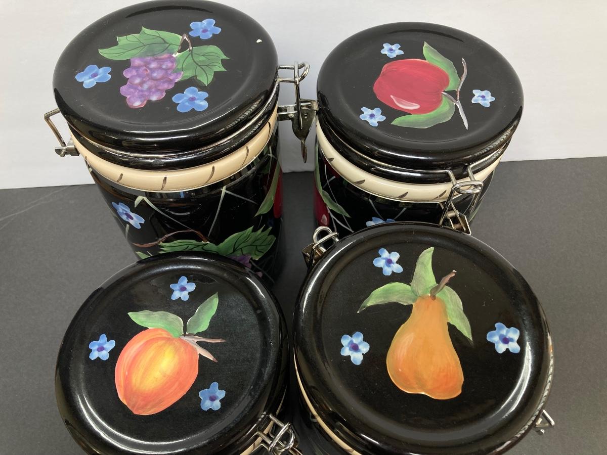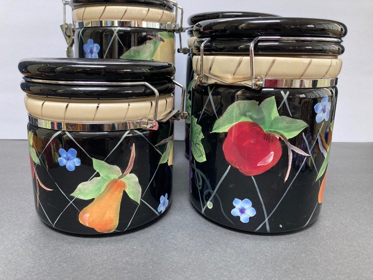 LOT 74S: Hand Painted Fruit - Patricia Brubaker Certified International Canister Set, Baum Bros "Formalities" Cups and Home Interiors Wall Plaques