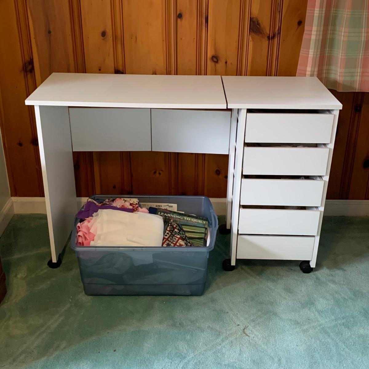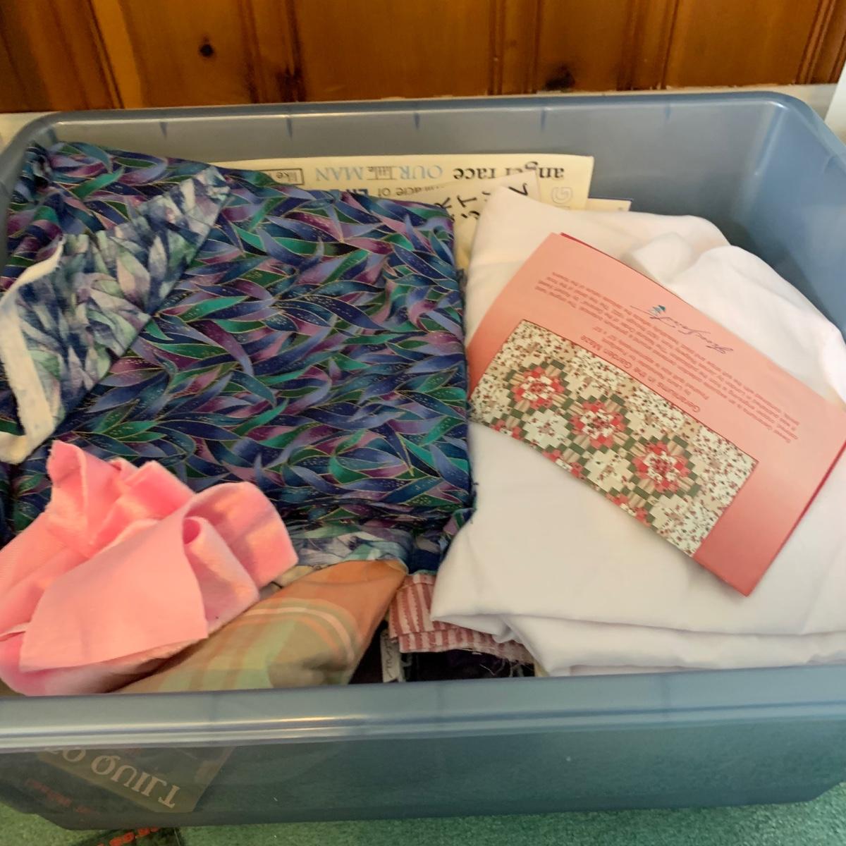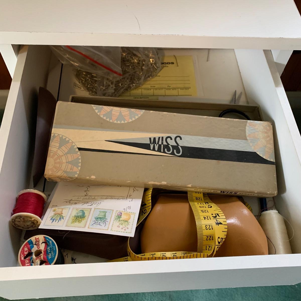 LOT 170: Sewing Machine/Craft Table, Weiss Scissors, Fabric Remnants, Notions & More