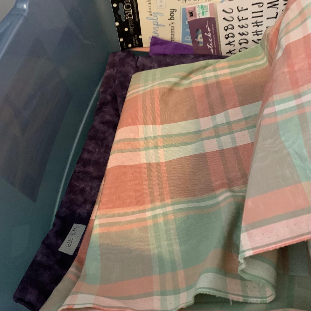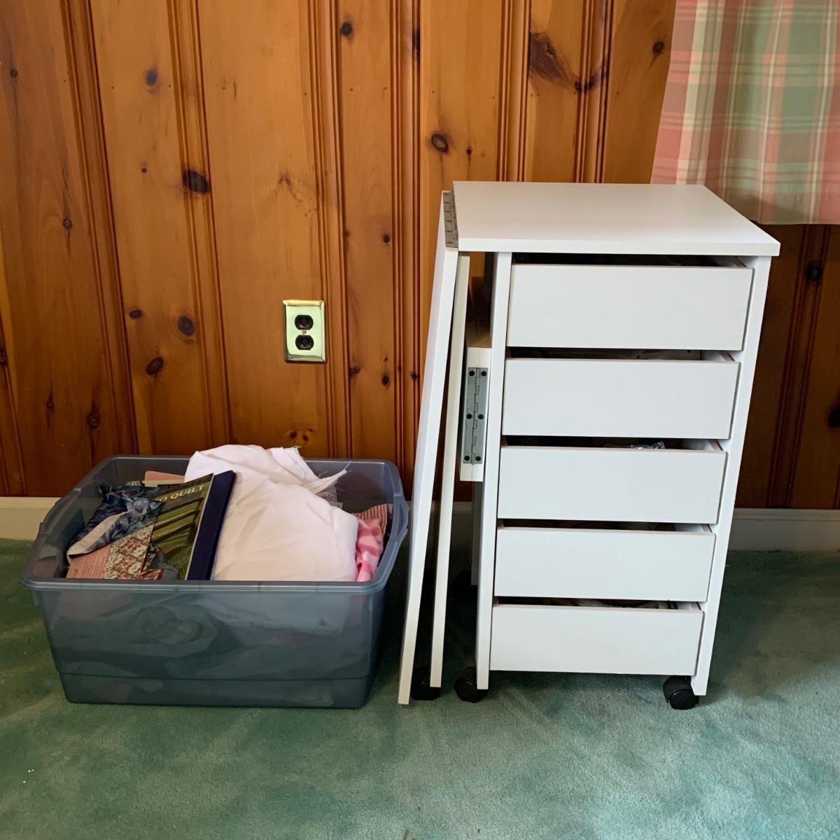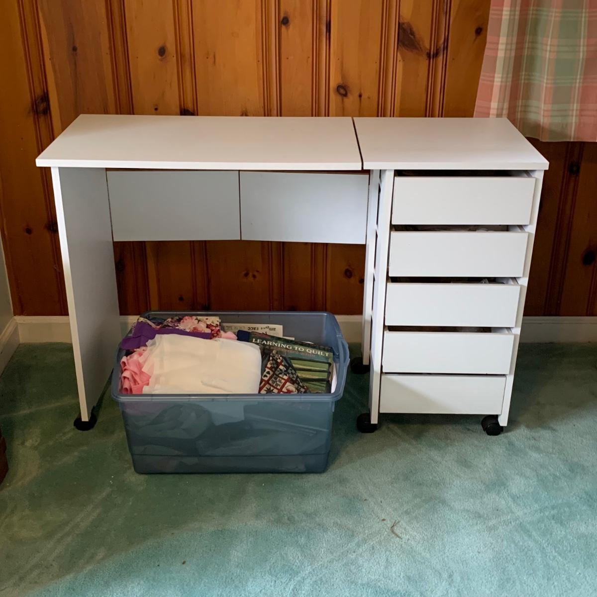 LOT 170: Sewing Machine/Craft Table, Weiss Scissors, Fabric Remnants, Notions & More