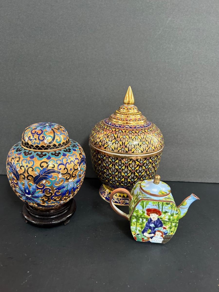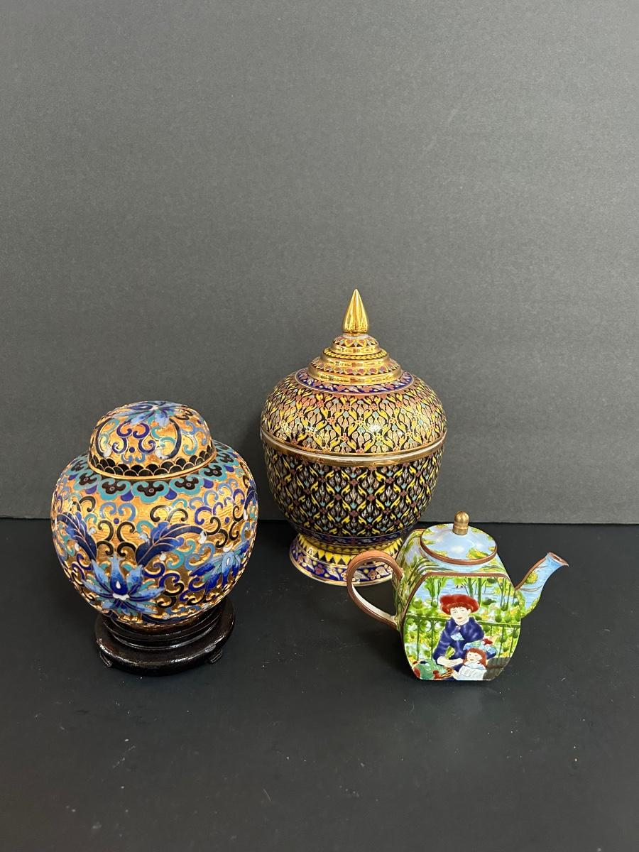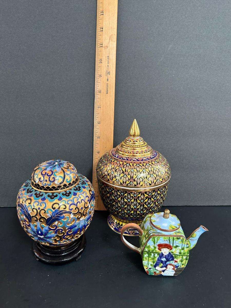 LOT 192S Hand-Painted Enamel Mini Teapot by Trade Plus Aid, Benjarong Thai Bowl w/Lid Gold Gilded Jar, Cloisonne Style Ginger Jar
