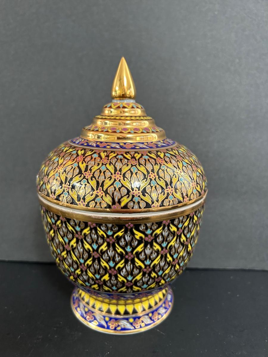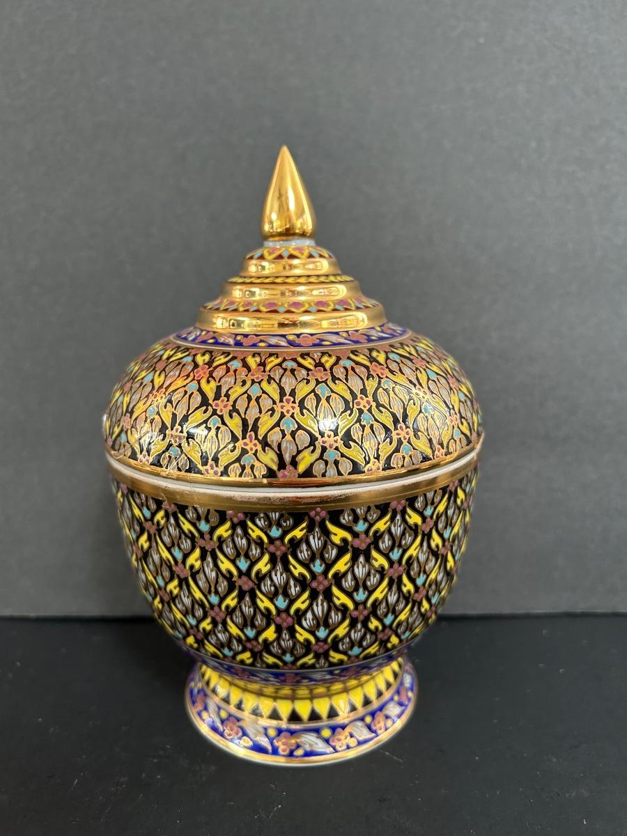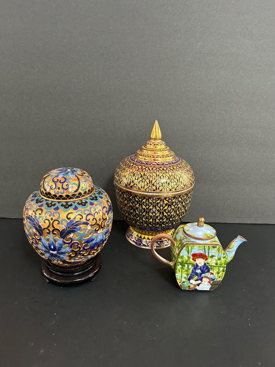 LOT 192S Hand-Painted Enamel Mini Teapot by Trade Plus Aid, Benjarong Thai Bowl w/Lid Gold Gilded Jar, Cloisonne Style Ginger Jar