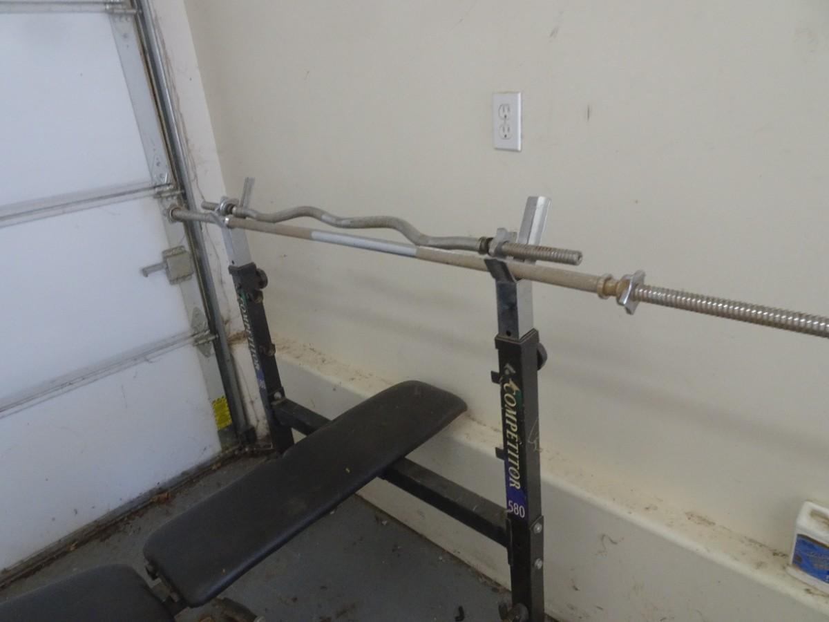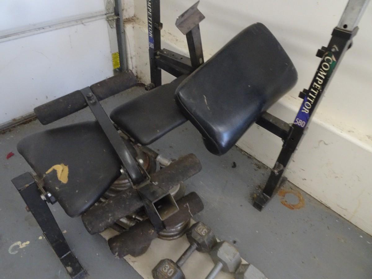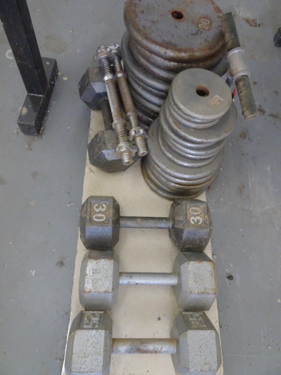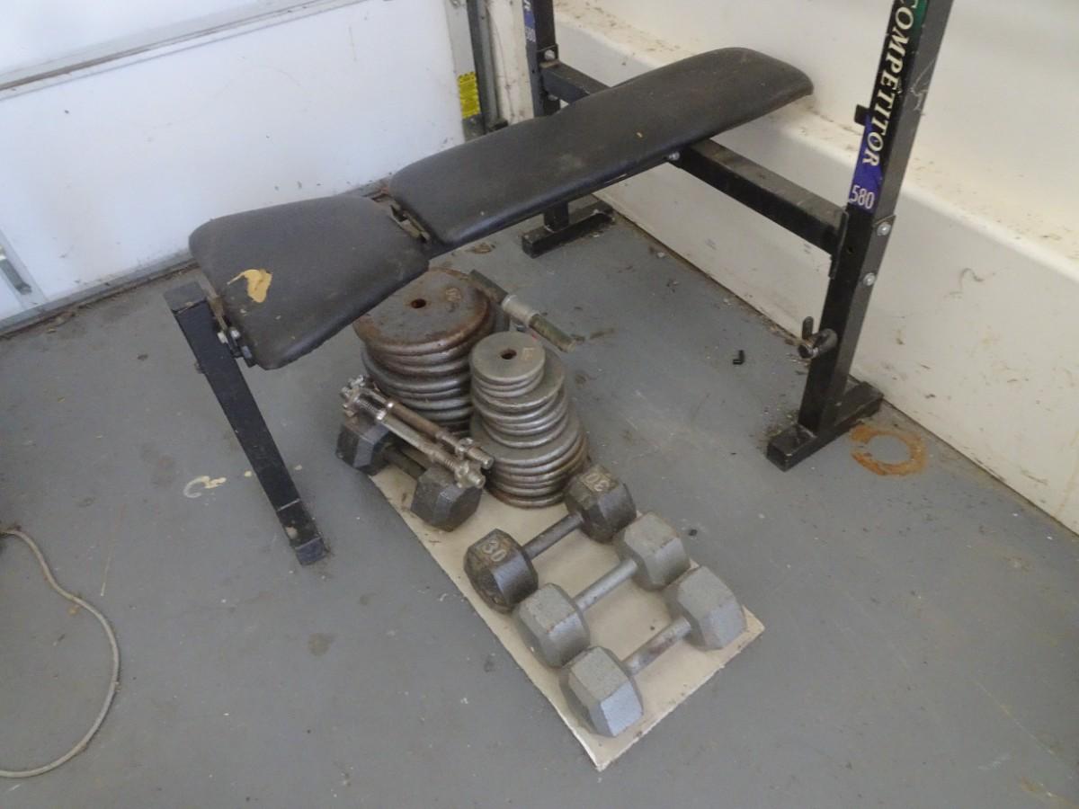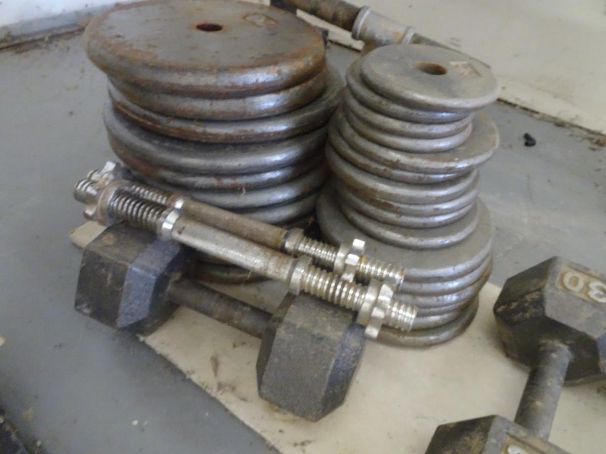 BENCH, CURL BAR, STRAIGHT BAR AND METAL WEIGHTS AND DUMB BELLS