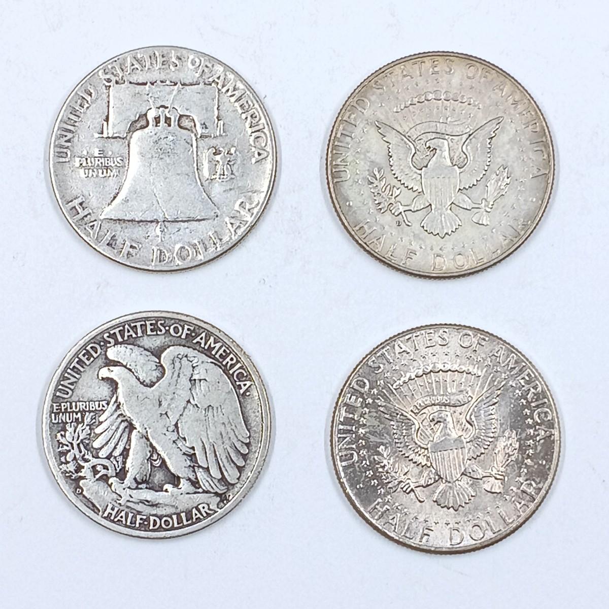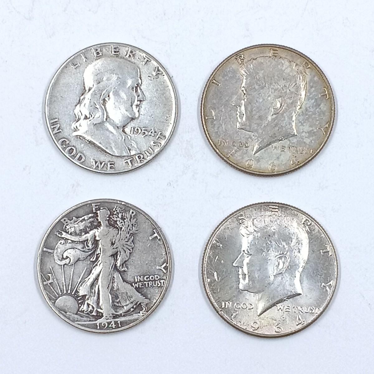 LOT 5: Silve Coin Collection: Set of 2 1964 Kennedy Half Dollars w/ 1941 Liberty Walker Half Dollar and 1954 Benjamin Half Dollar