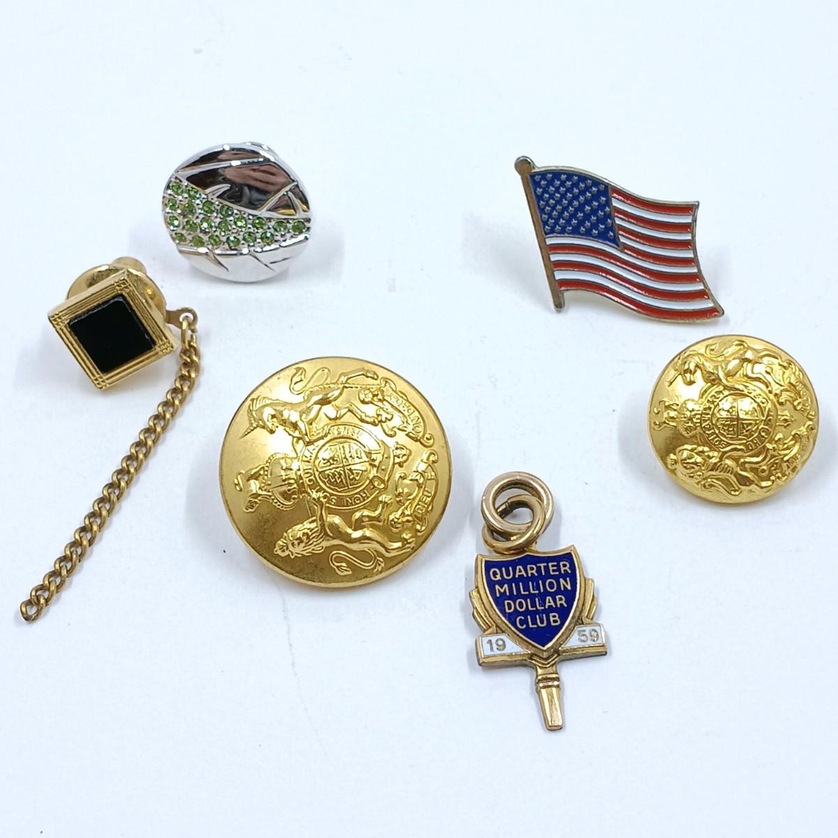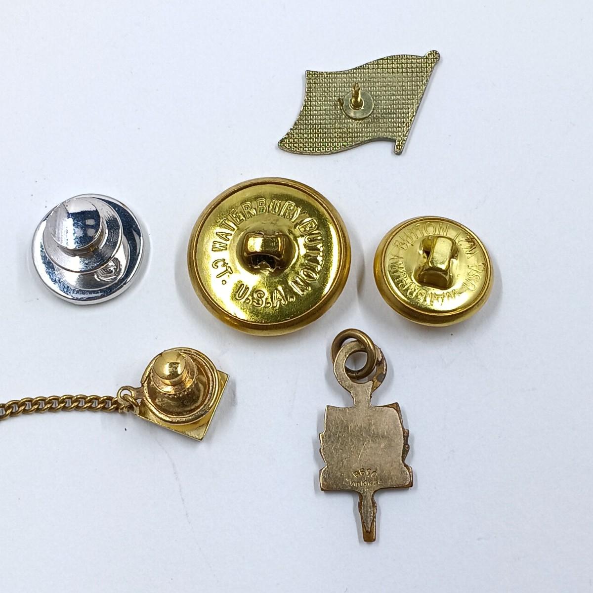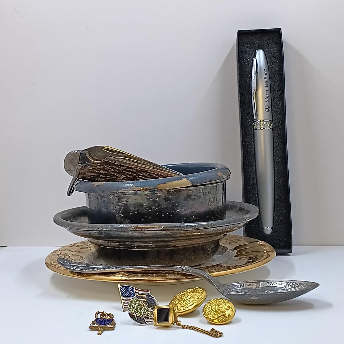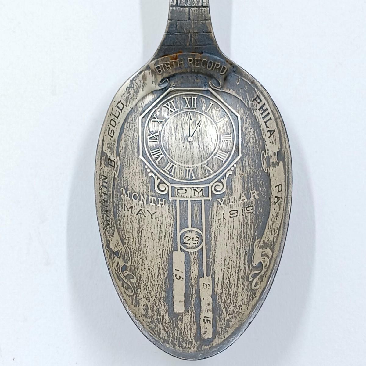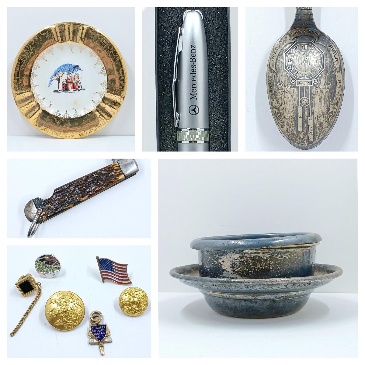 LOT 8: 1919 Stork Birth Record Sterling Spoon, Crest-O-Gold USA Plate, BBCO Pendant, Vintage Tie-Pins & More
