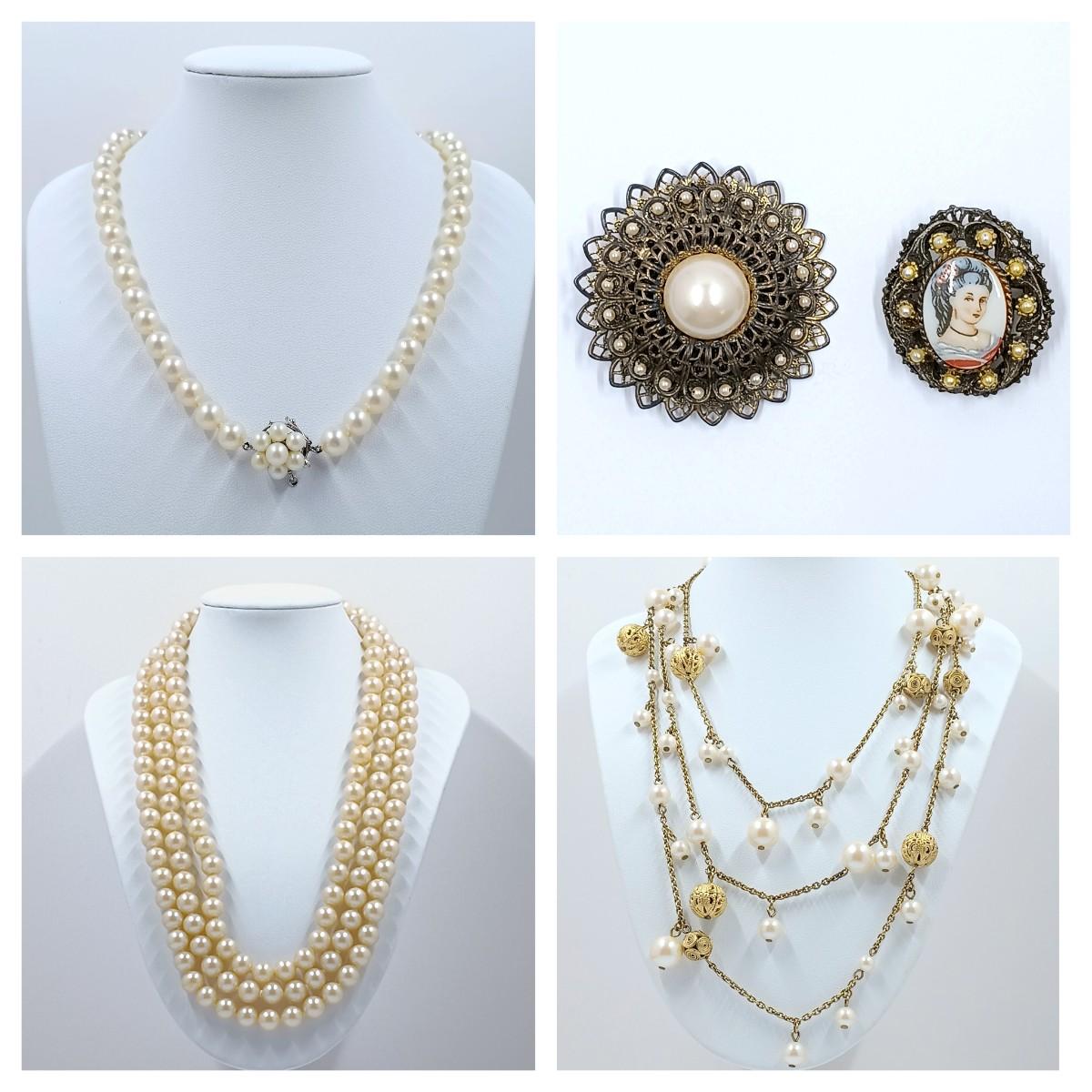 LOT 22: Faux Pearl Collection- Carolee 26" Opera-Length Necklace, Vintage Brooches & More