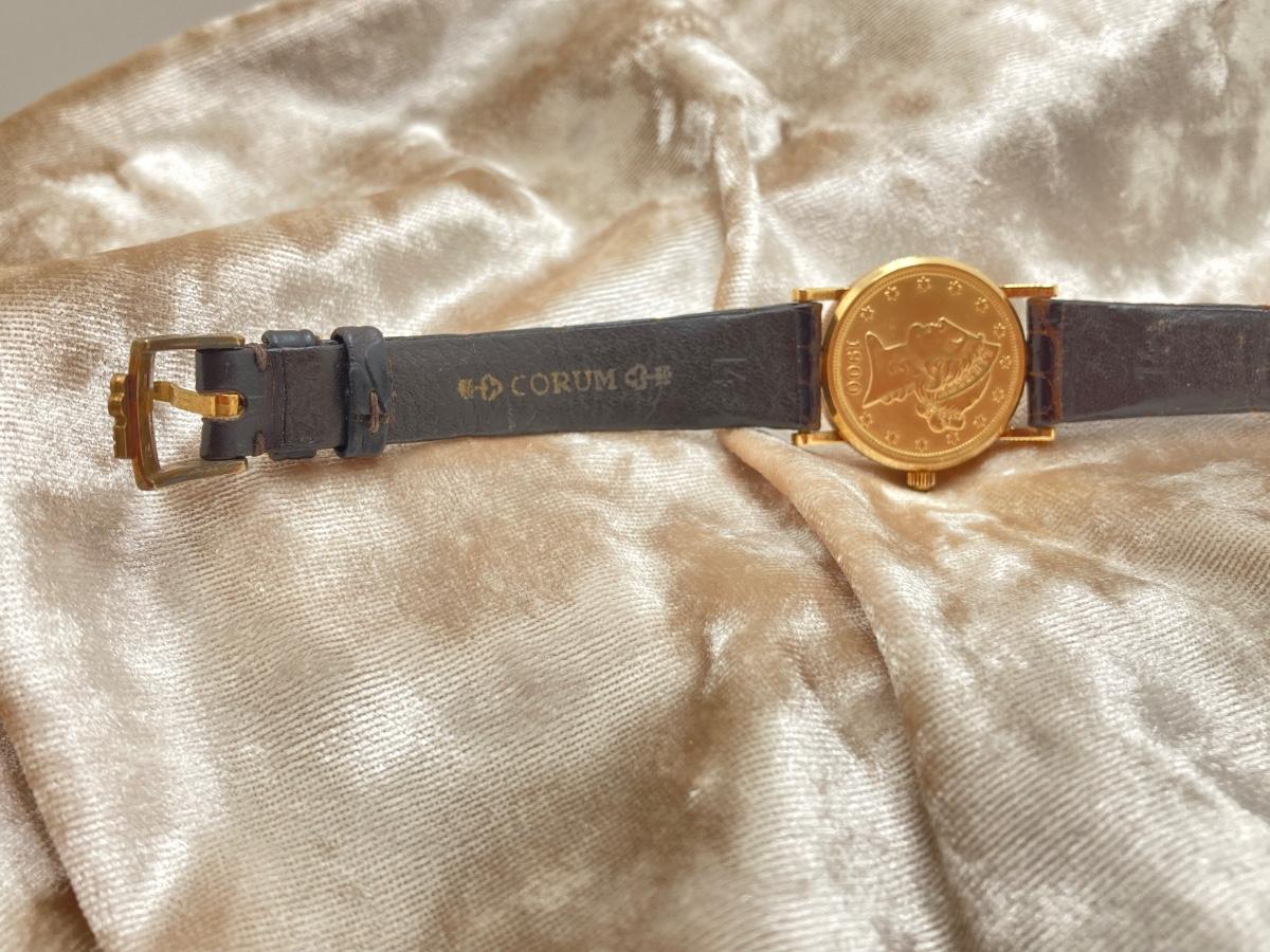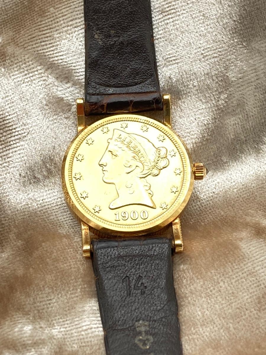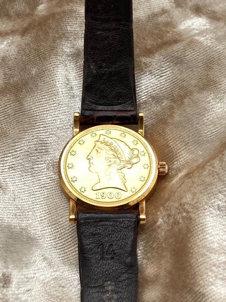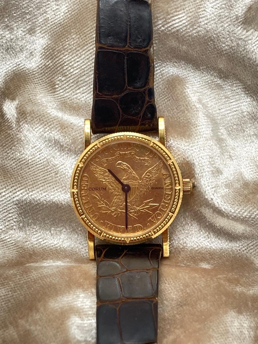 LOT 61J: Corum 18K Gold Five Dollar / 1900 Coin (2 Bodied) Swiss Watch with Diamond Crown and Leather Band