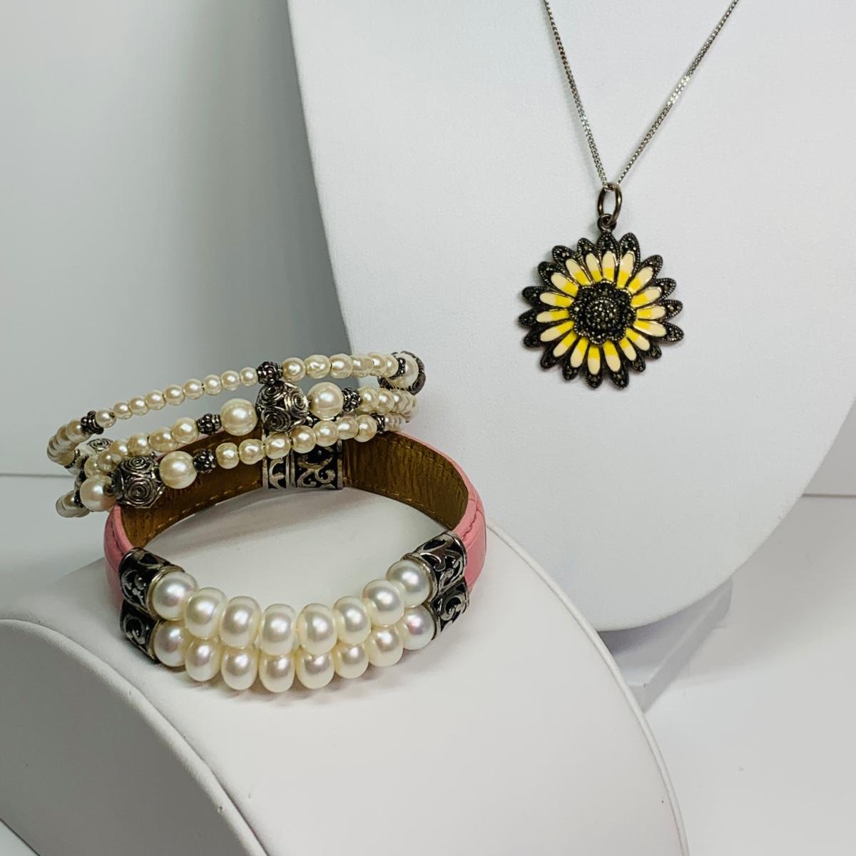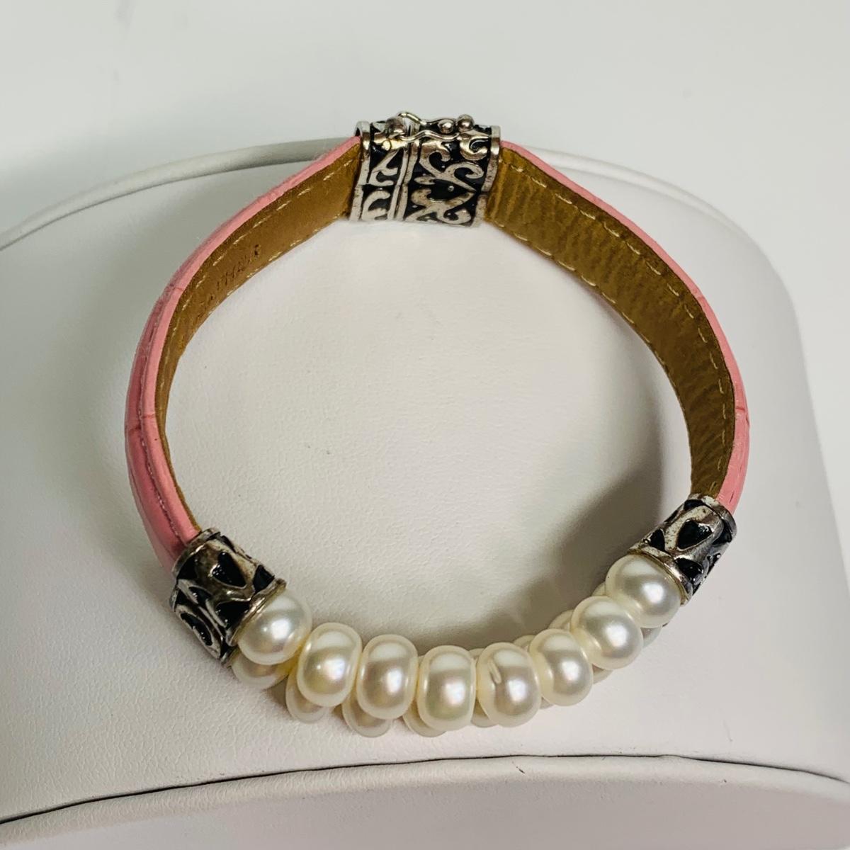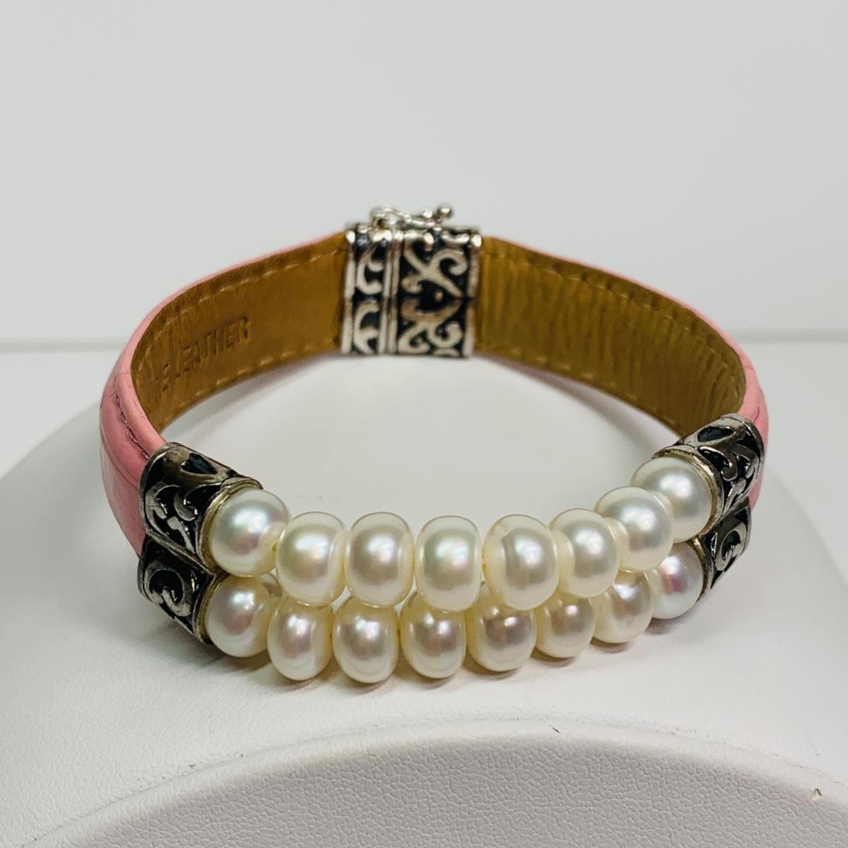 LOT 109: Sterling Silver 925 Marcasite Enamel Pendant on a 16" Chain, 925 Honora Pink Pearl & Pink Leather Band Magnetic Bracelet & More