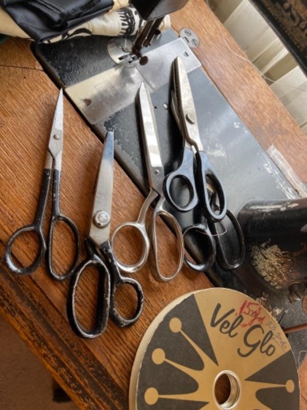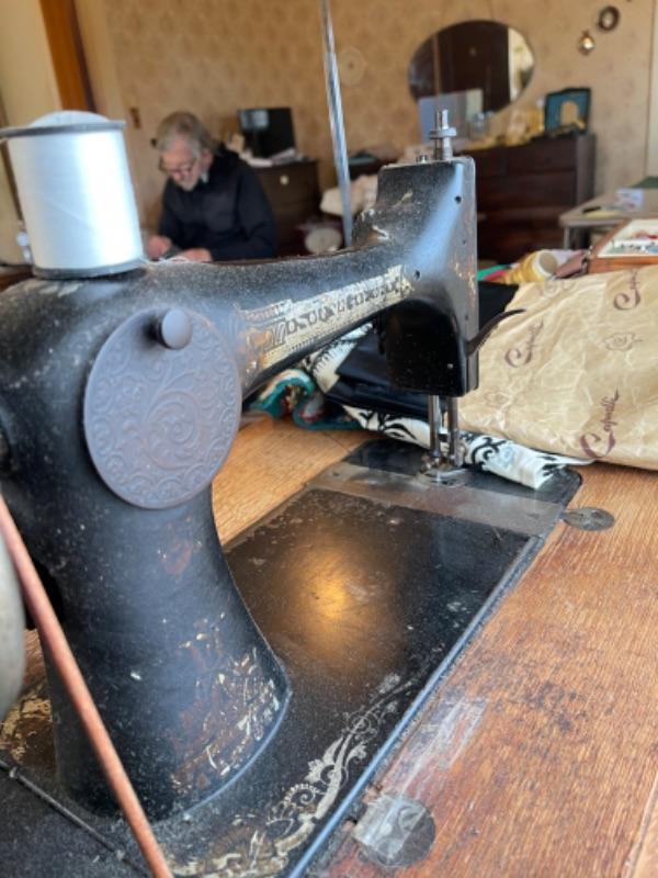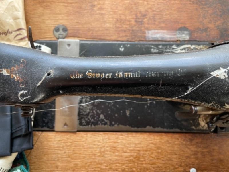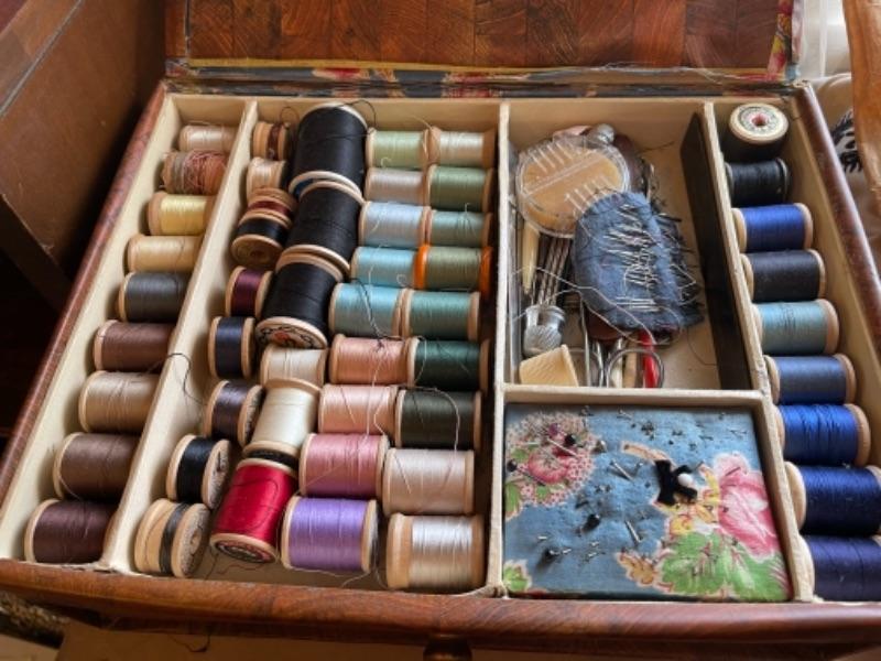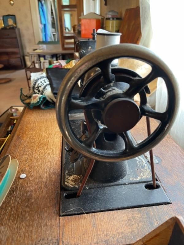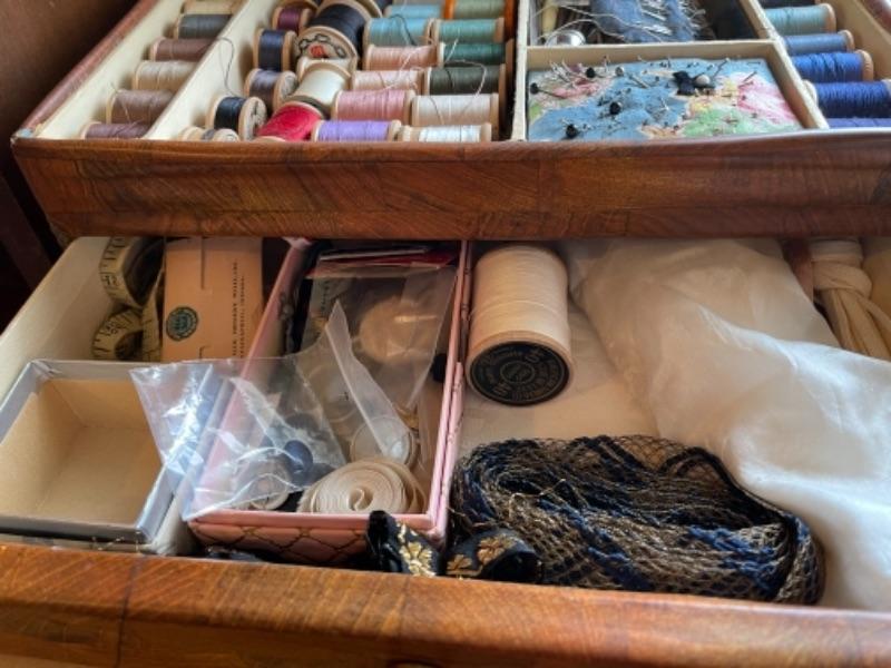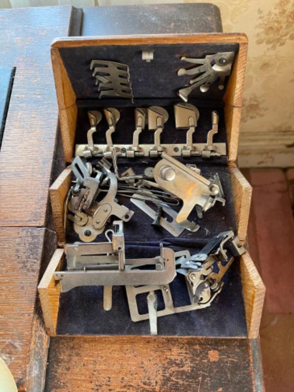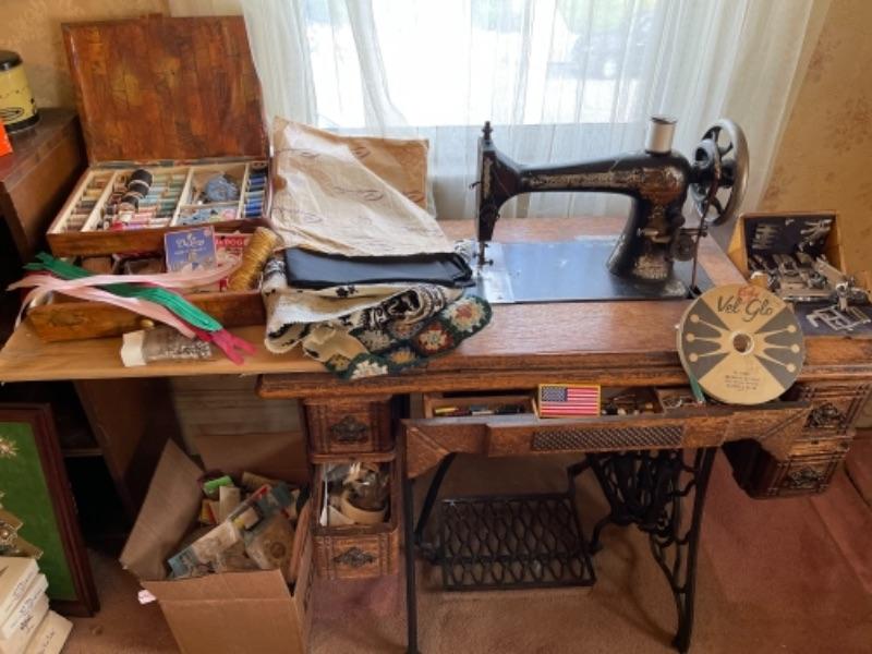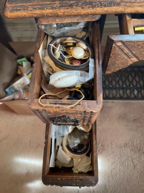 Lot 99B1. Sewing box with notions, zippers, ribbon, buttons, snaps, fasteners and antique Singer treadle sewing machine with attachments, parts and beautiful wood-carved drawers--$195