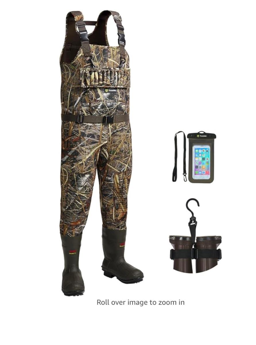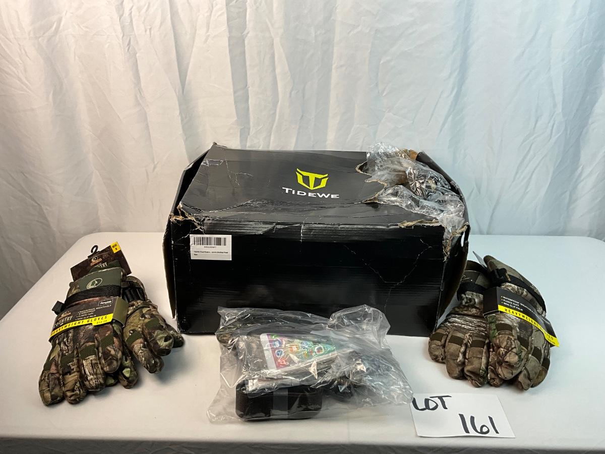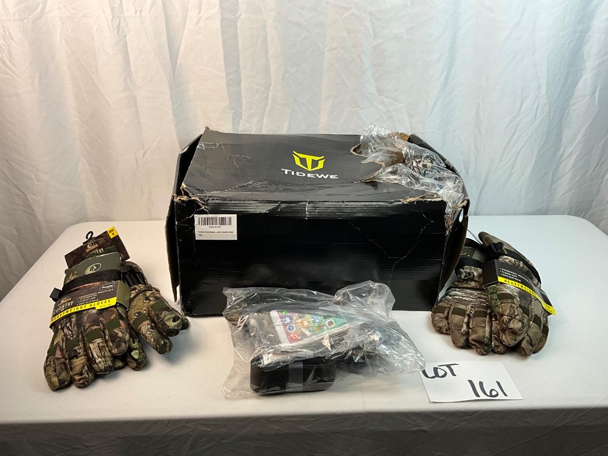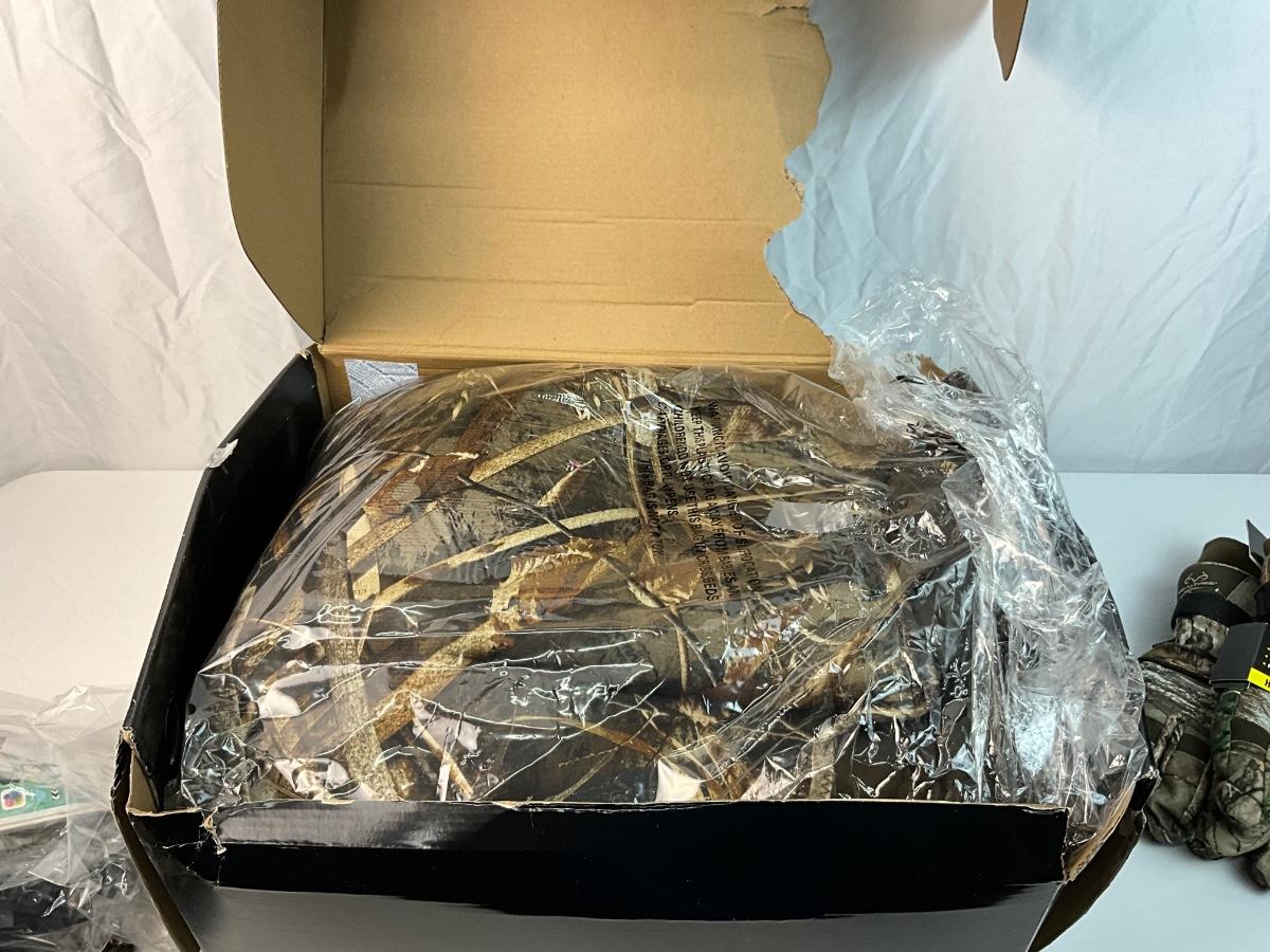 New in box Real Tree TideWe Chest Waders size 13, 90% neoprene 10% polyester. Box has some damage, waders are in perfect condition. Also included are 2 pairs of heavy weight waterproof glove's.