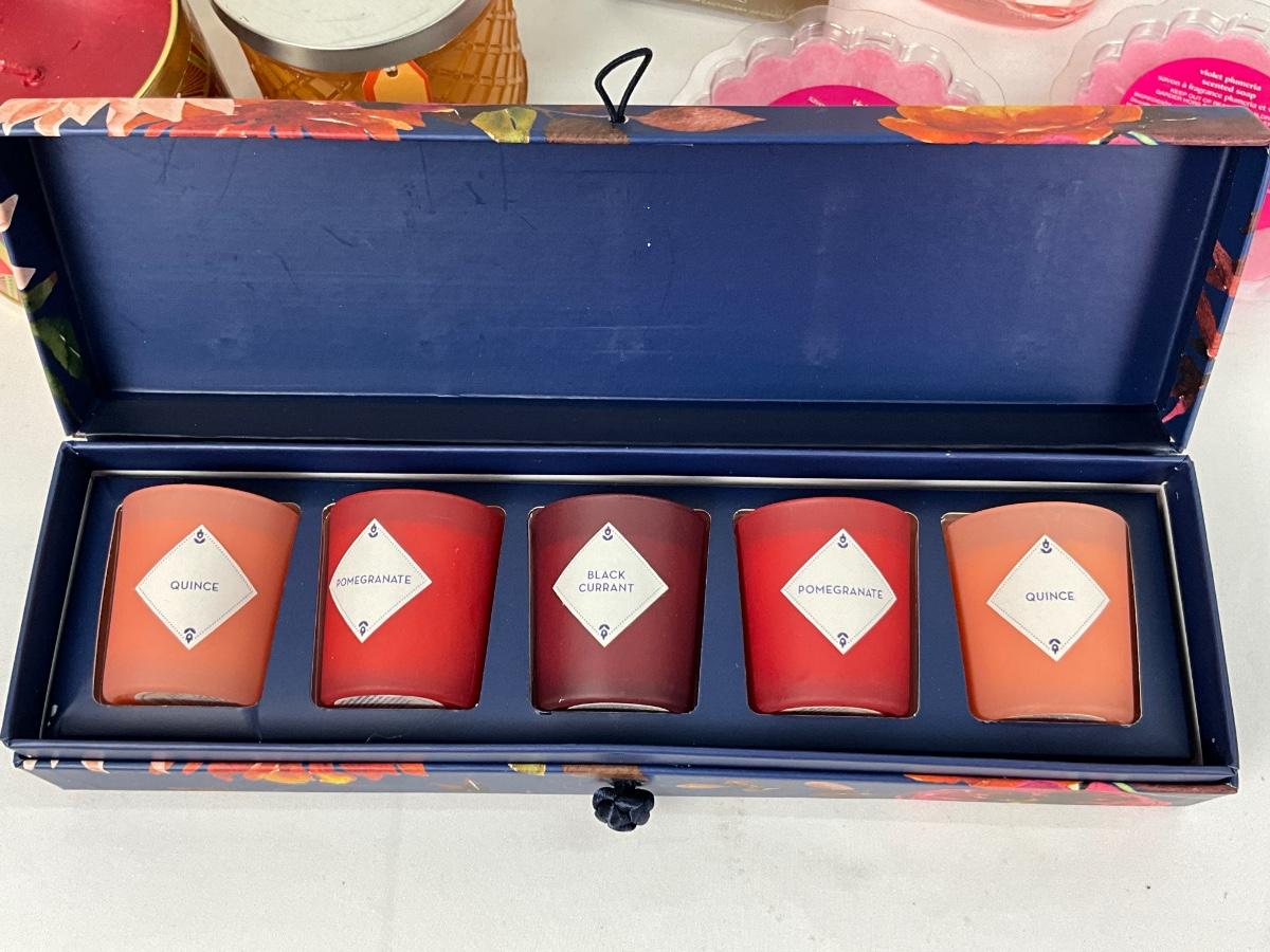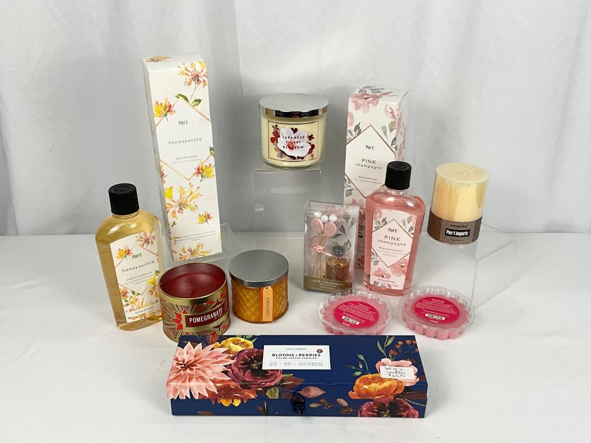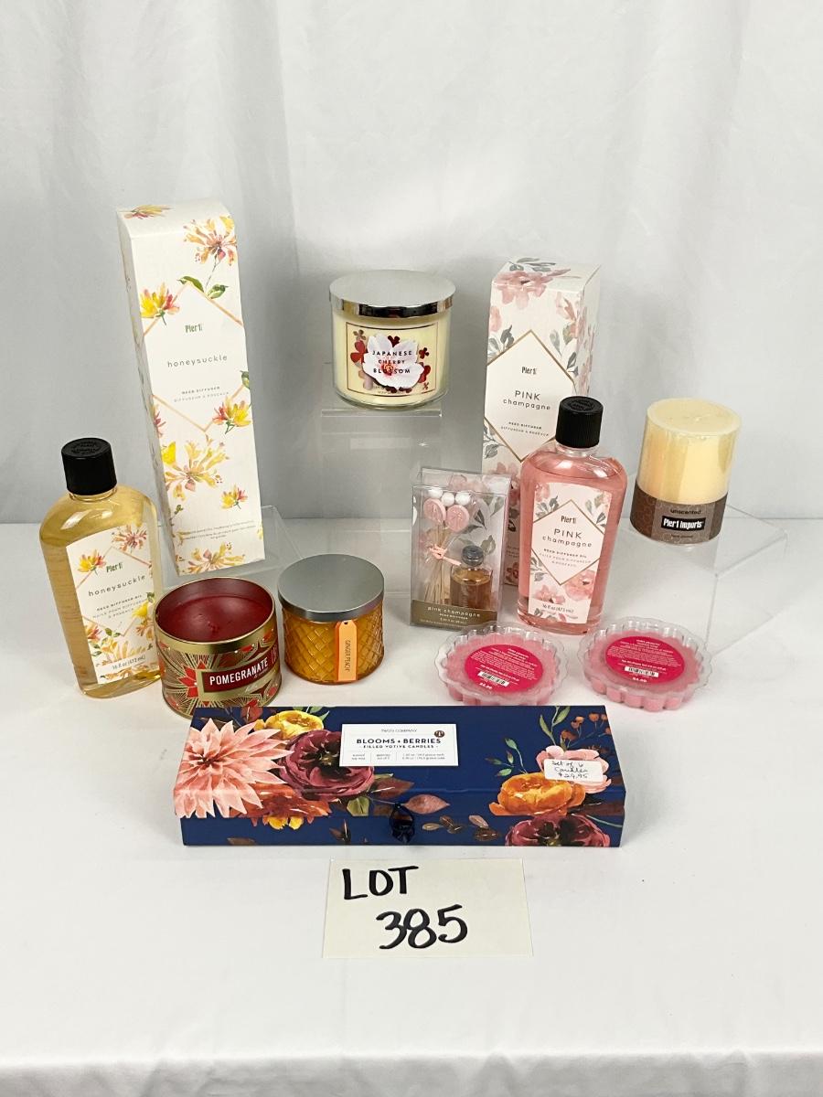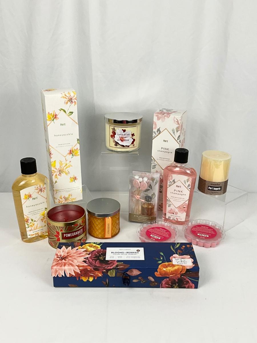 The lot contains several candles, reed diffusers with oils, Blooms & Berries votive candle set, all items are new.