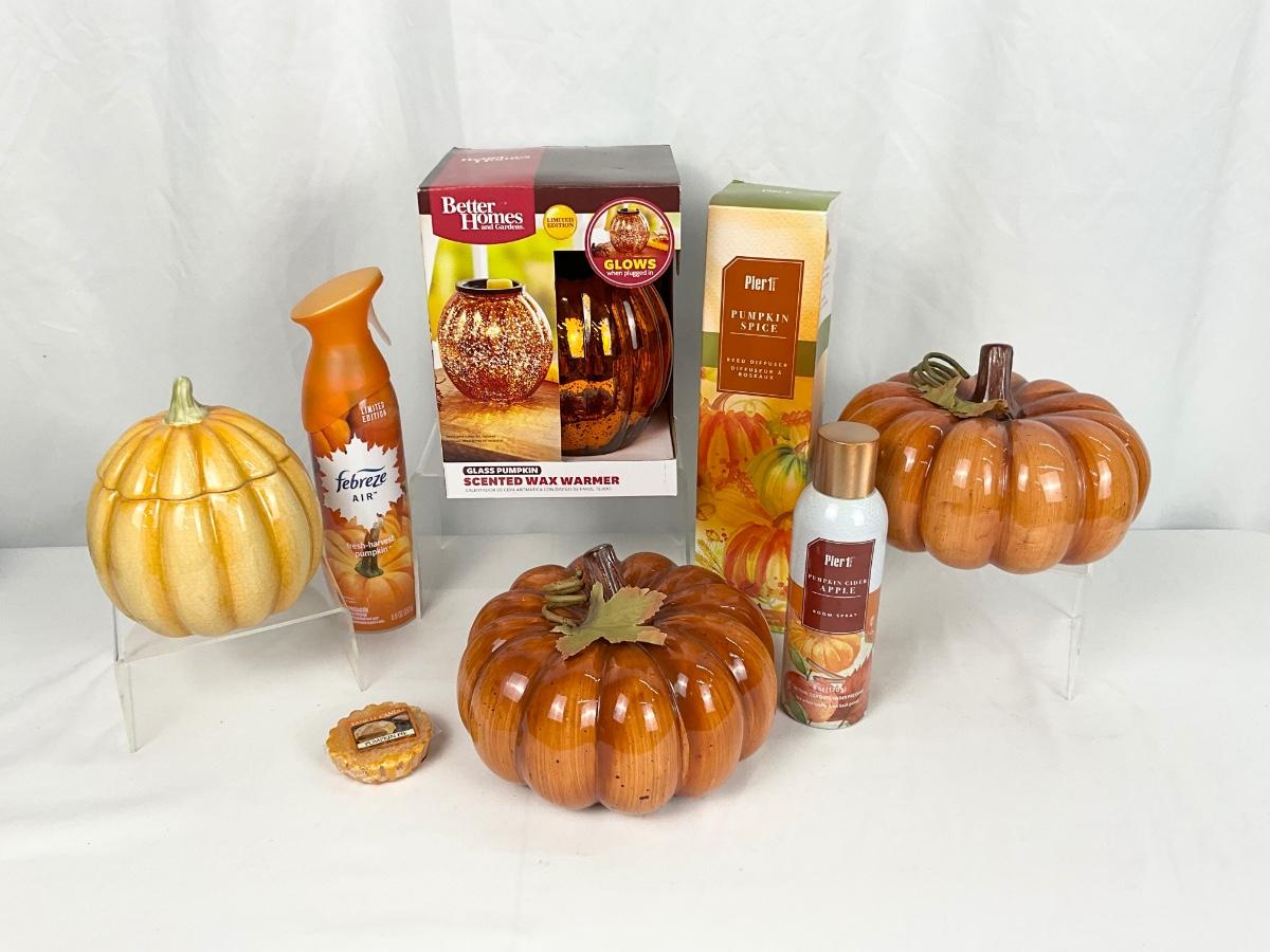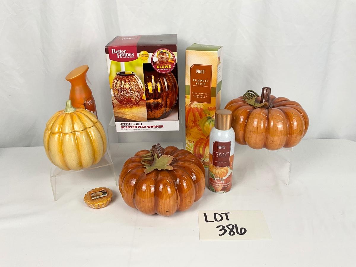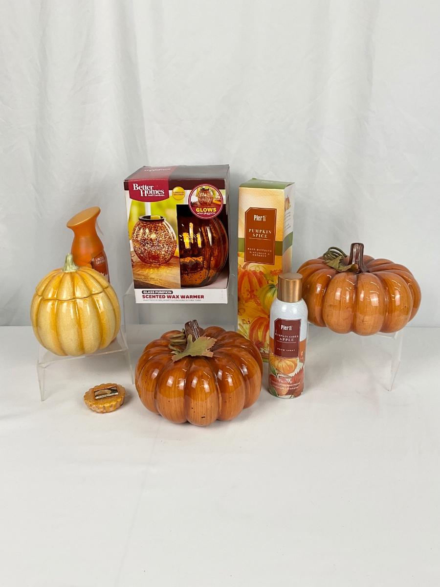 Lot contains, ceramic pumpkin decor, pumpkin spice sire fresheners, reed diffusers and more.