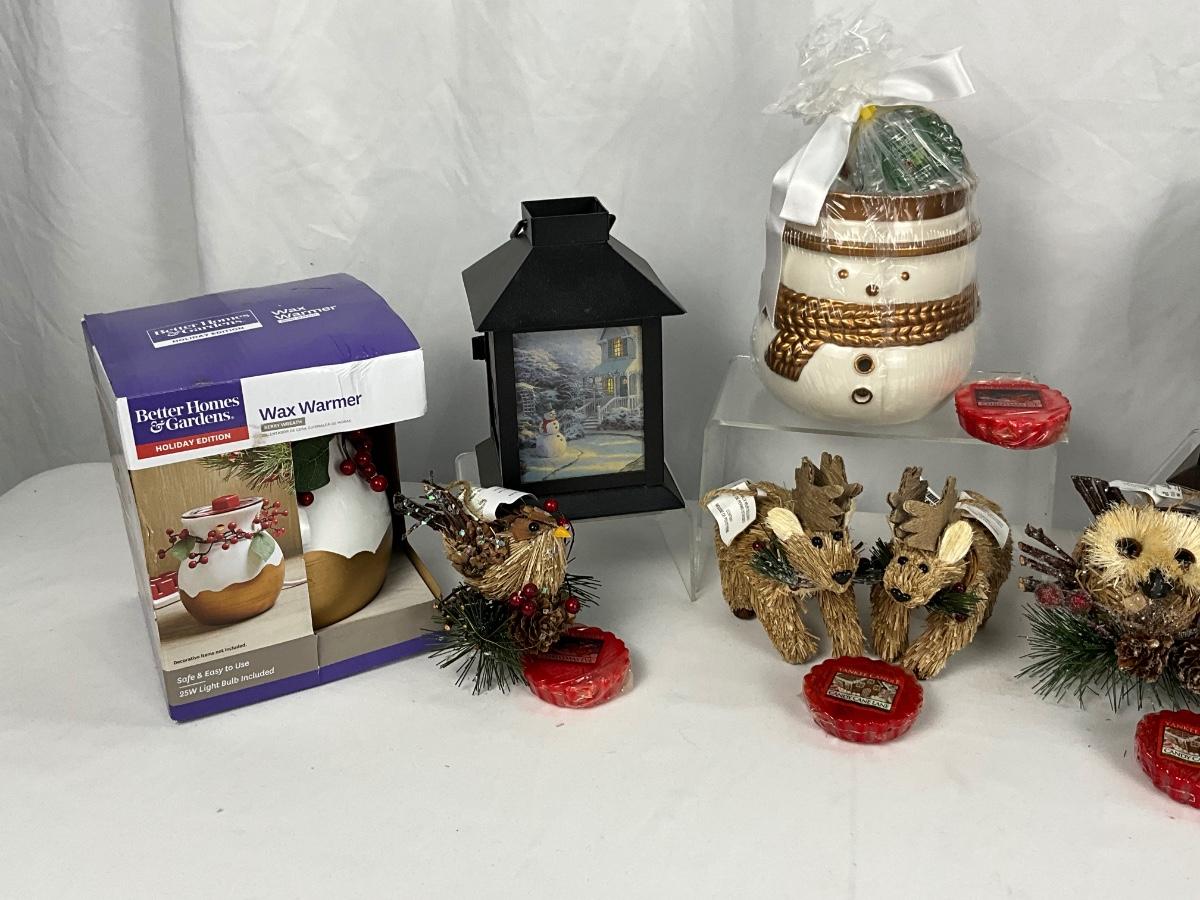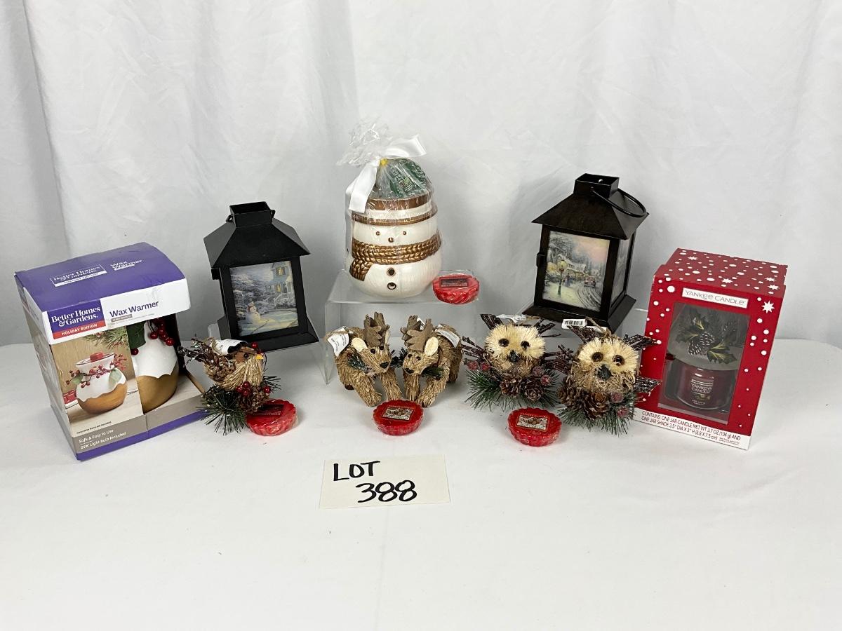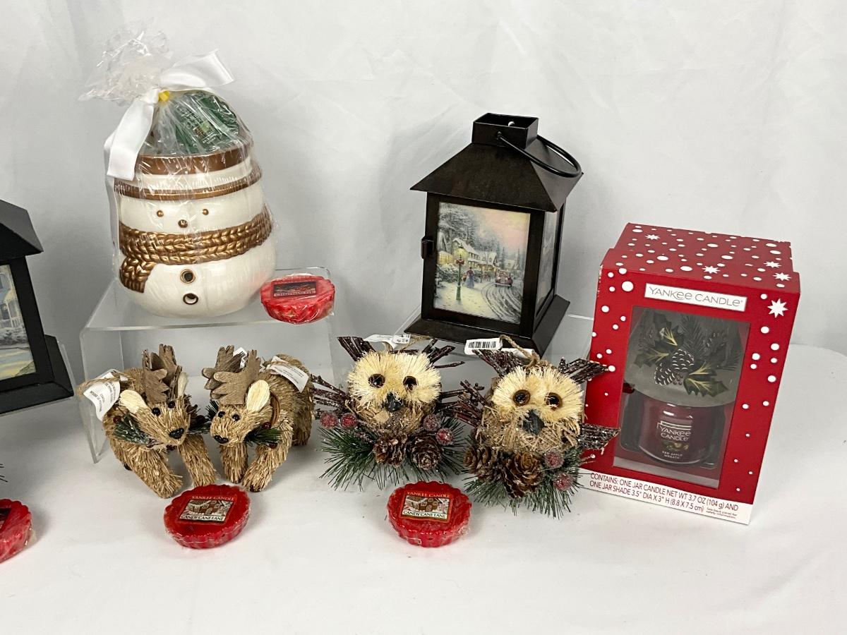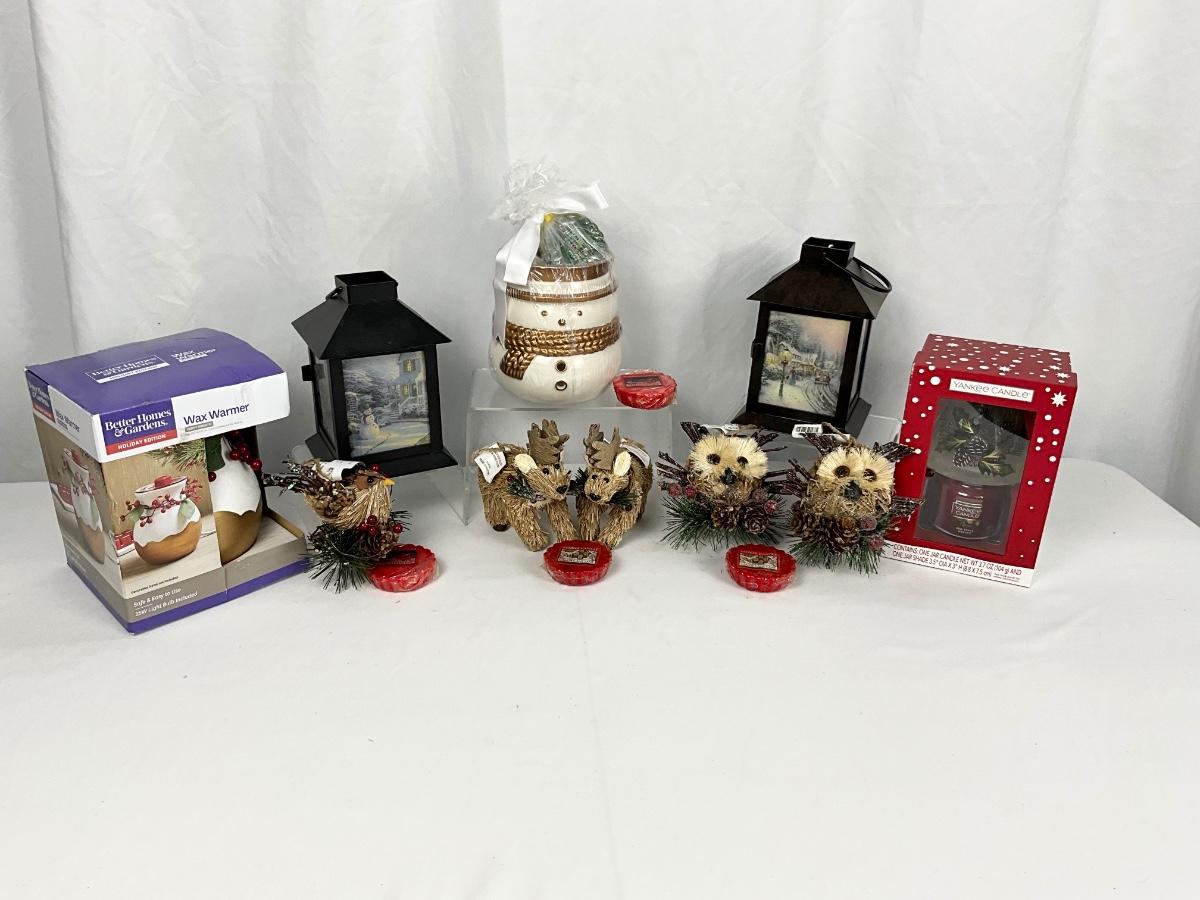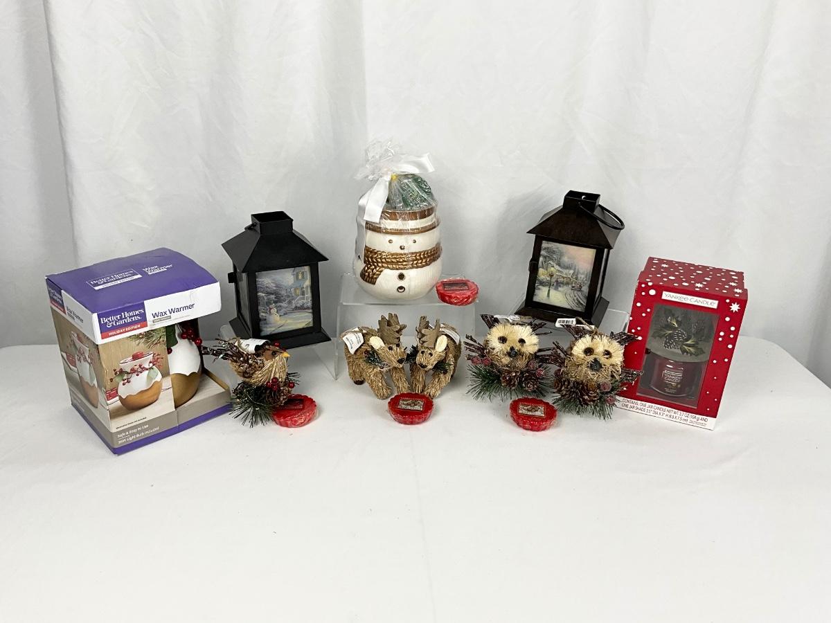 The lot contains 2 lanterns, wax warmer, wax melts, mini brand new Yankee Candle with holiday shade, 5 wooden Pier One ornaments and more.