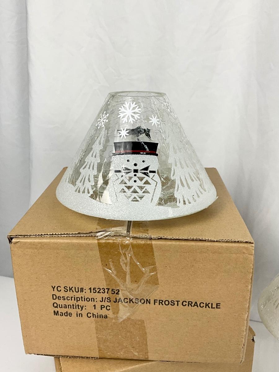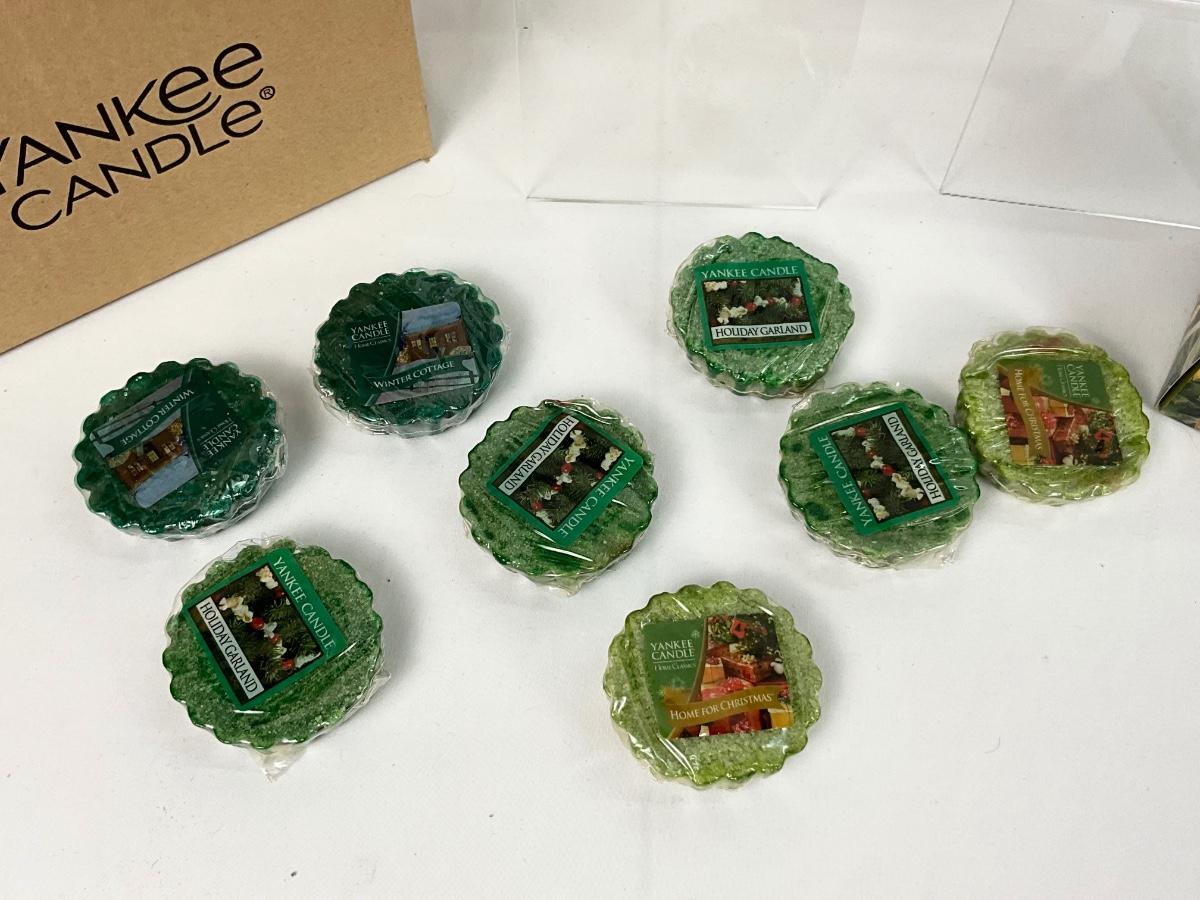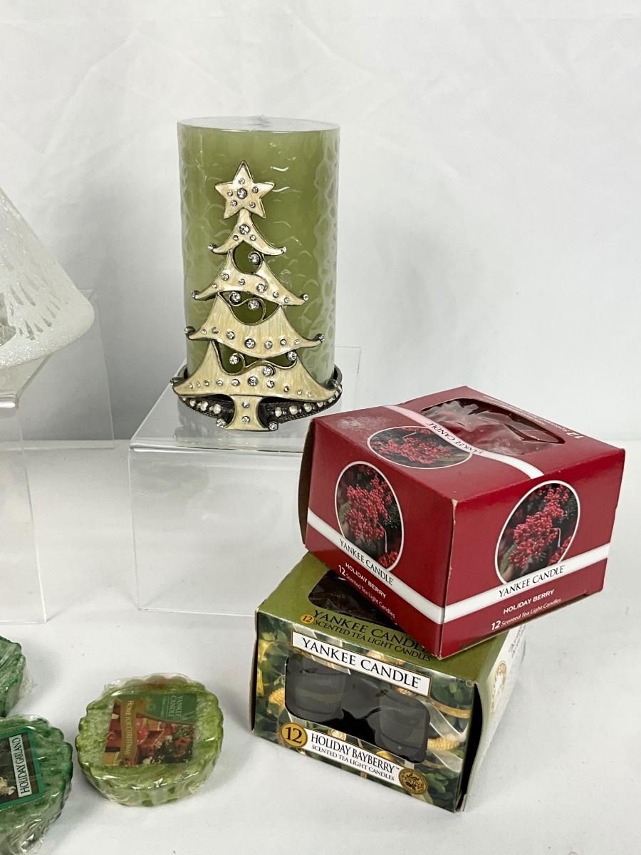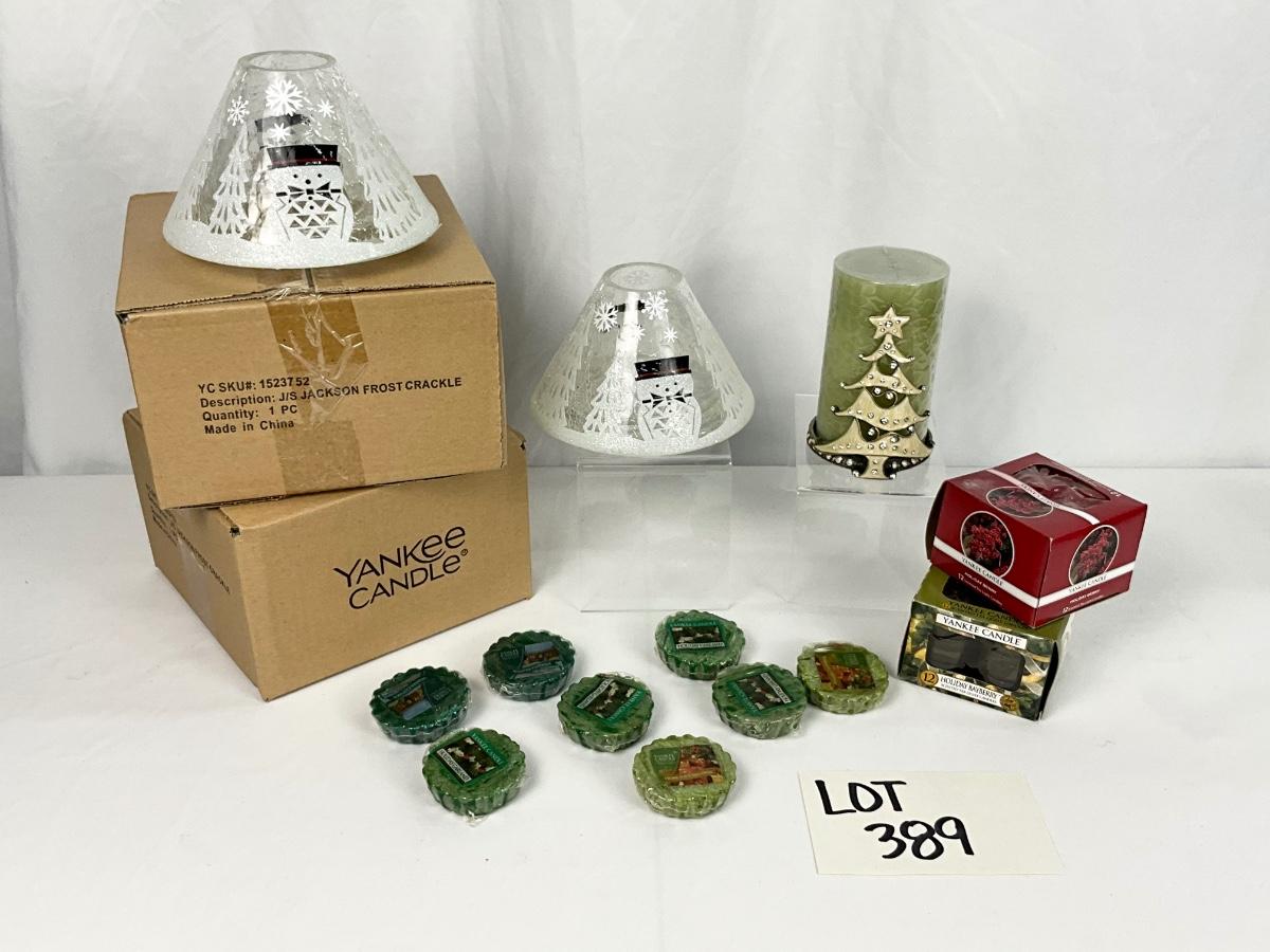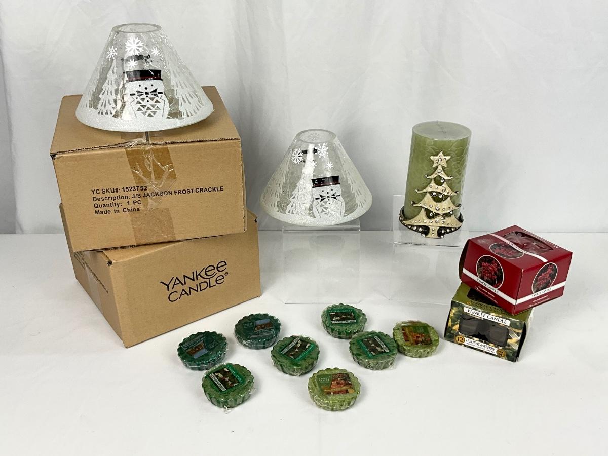 The lot contains 4 Snowman candle shades ( 3 are New In Box), wax melts, Yankee Candle LED candle with Christmas tree holder.