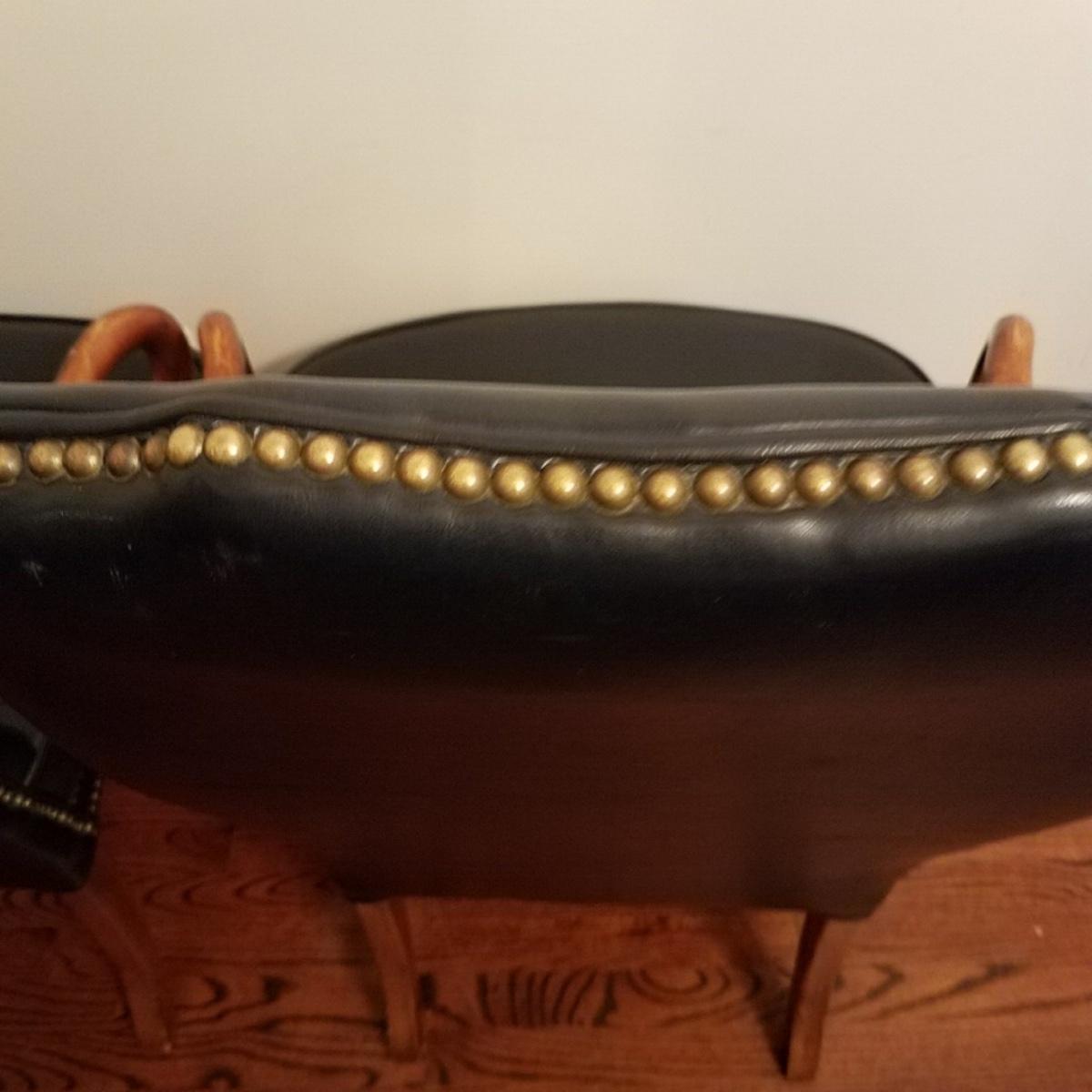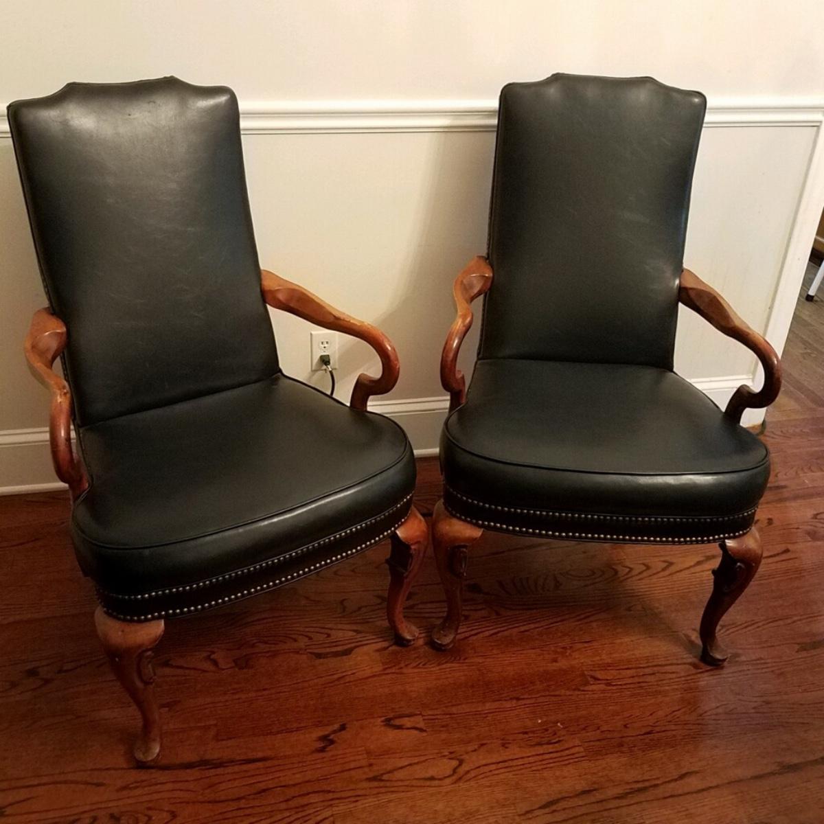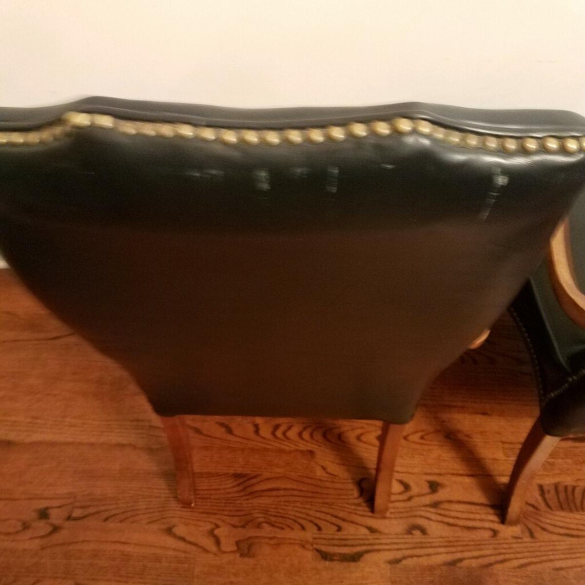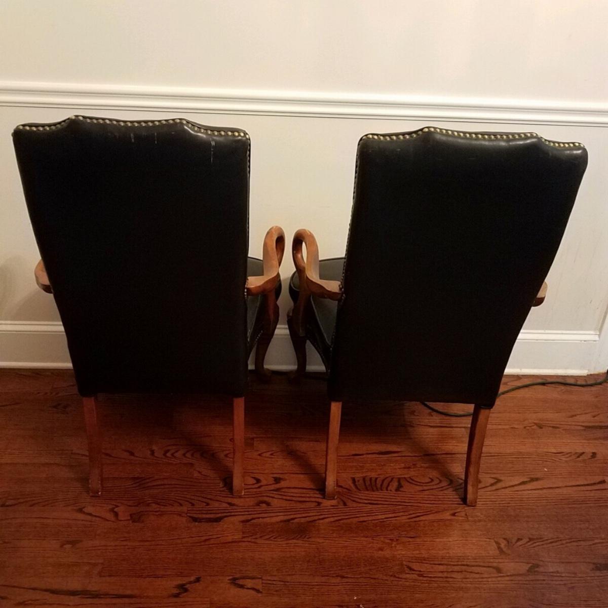 Lot A of 2 midnight navy arm chairs with Mahogany finish, brass nailhead trim. Approx 43" h x 25" w. Very good condition with a few scuffs.