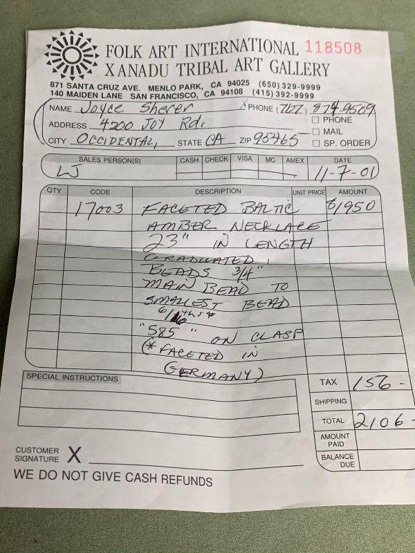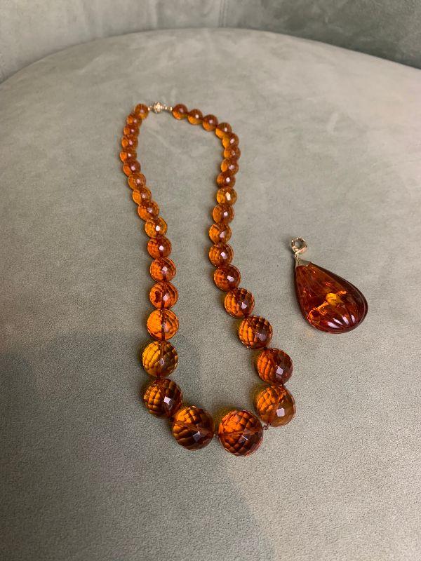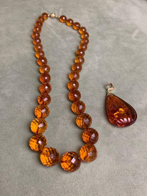 Faceted in Germany Baltic Amber Necklace 23" graduated beads starting at 3/4" main bead to smallest paid $2,106 and Amber pendant 14kt tested and stamped 585 on clasp paid $773 in 98'