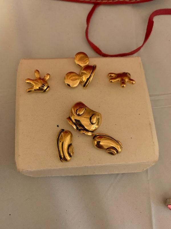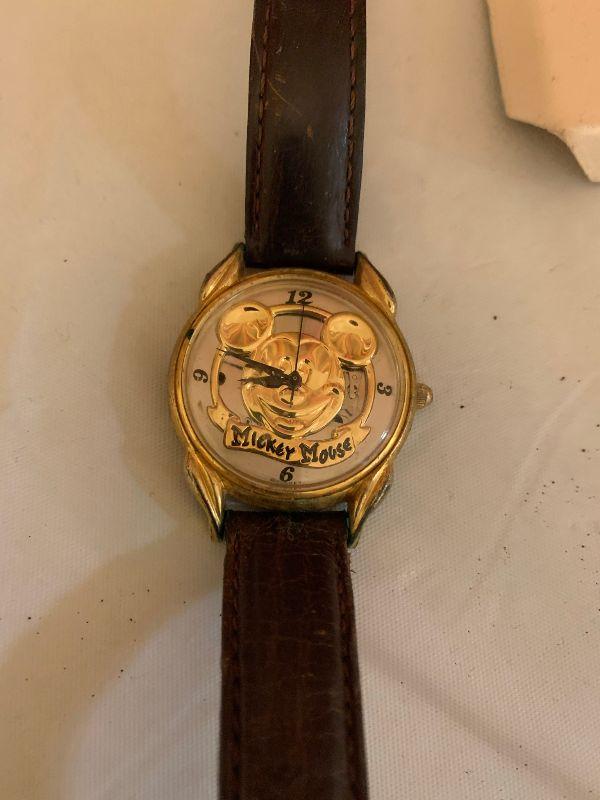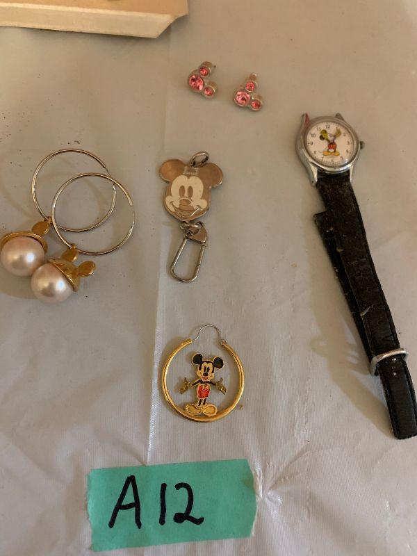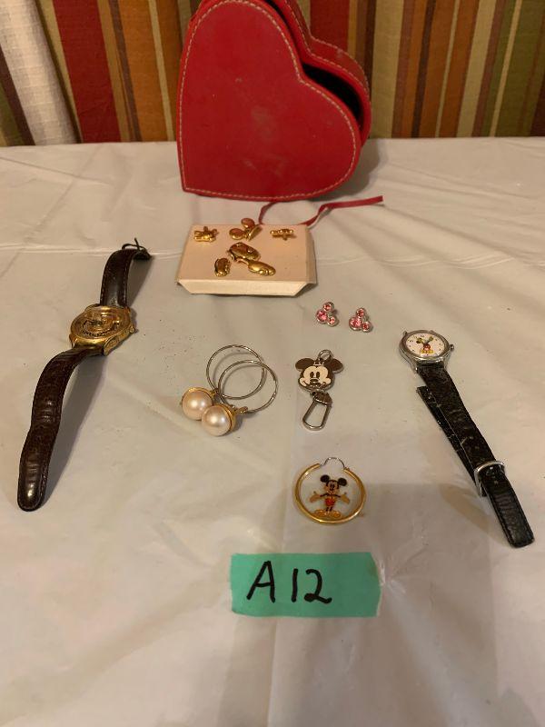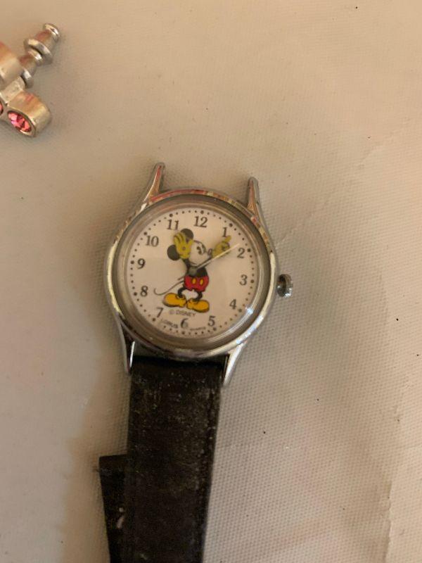 Mickey Mouse jewelry lot: as is Lorus Quartz Mickey Disney watch broken band, as is Mickey Mouse watch broken band, and 6 pin set, and 2 sets of 2 matching earrings and more