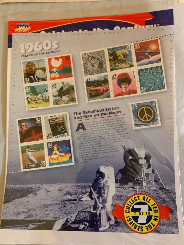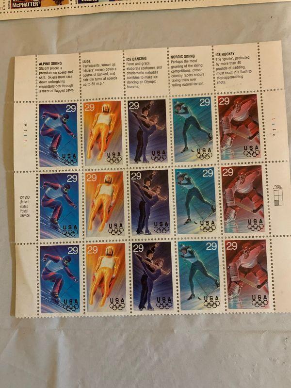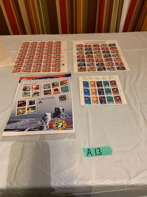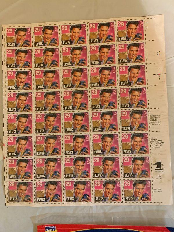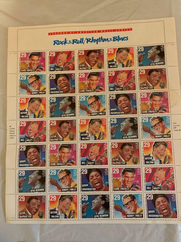 Full Sheet of Elvis $0.29 Stamps from 1992 as is, Full Sheet of Rock and Roll/Rhythm and Blues $0.29 Stamps from 1992, and 1960's celebrate the century new in package 7/10 collector series stamps, and partial sheet of 1993 Olympic Games Stamps.