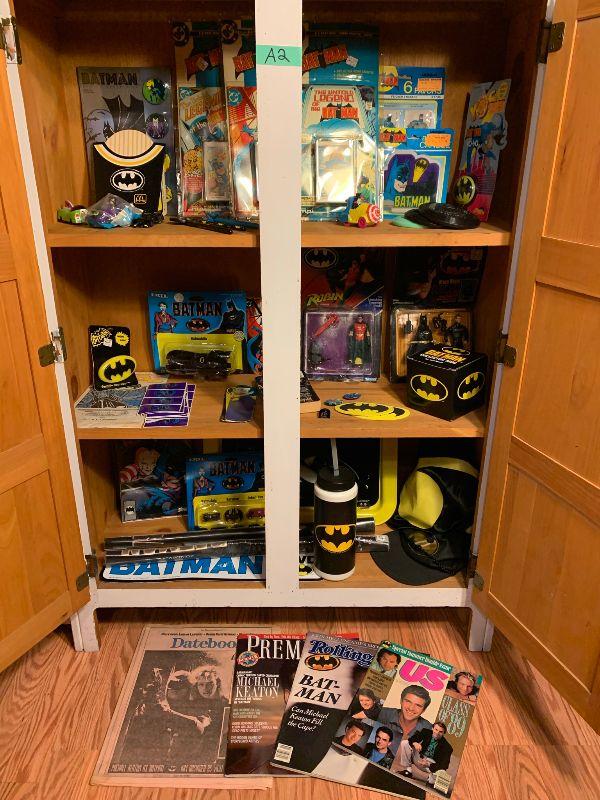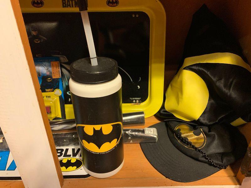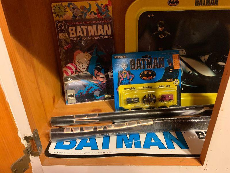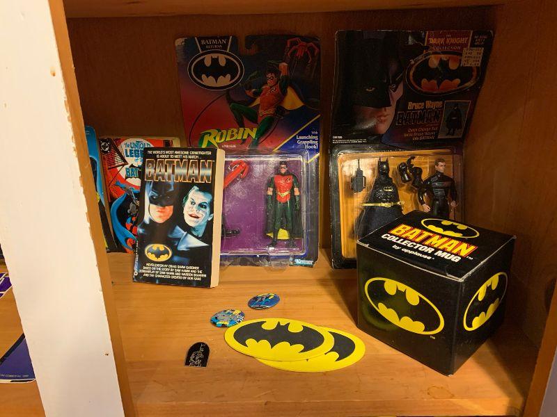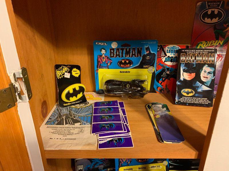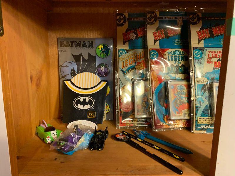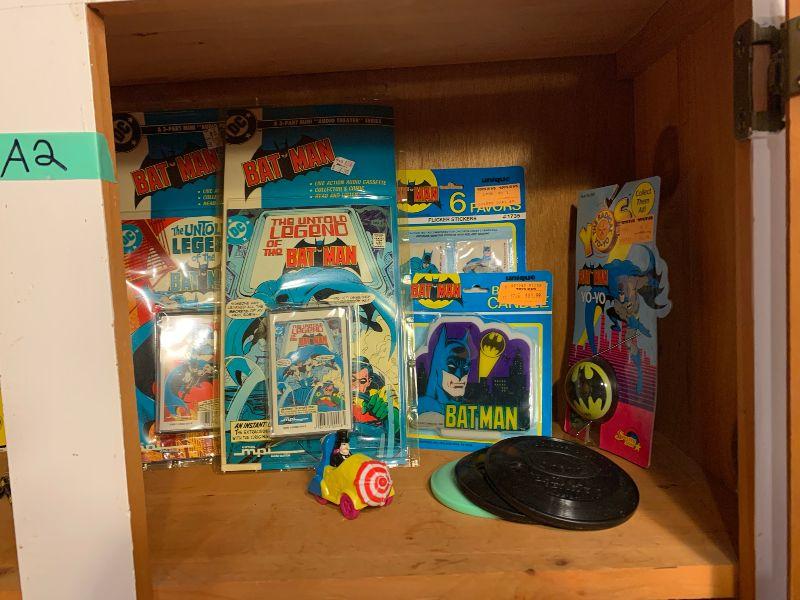 Batman: new in package: yoyo, candle, flicker stickers, legend of Batman live audio cassette with collector comic x 3, button set, bat mobile toy, robin, batman dark knight Bruce Wayne, mug, ERTL Batman, miniatures. Other Batman: TV Tray, Adv. Batman #412 new in package and more...