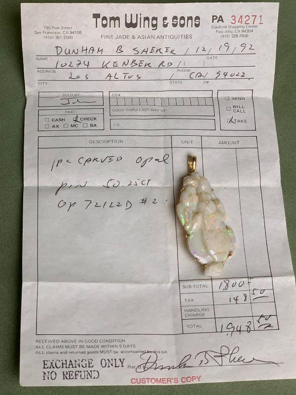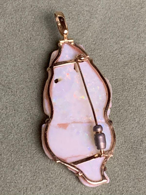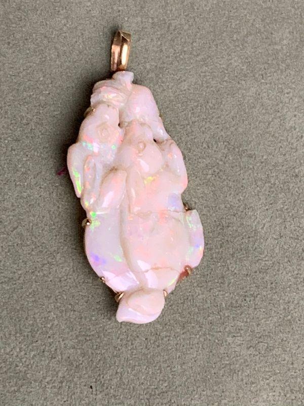 1 piece carved opal rabbit pin with gold, small cracks 50.25 carats opal and 14kt clasp tested they purchased it in 92' for 1,948