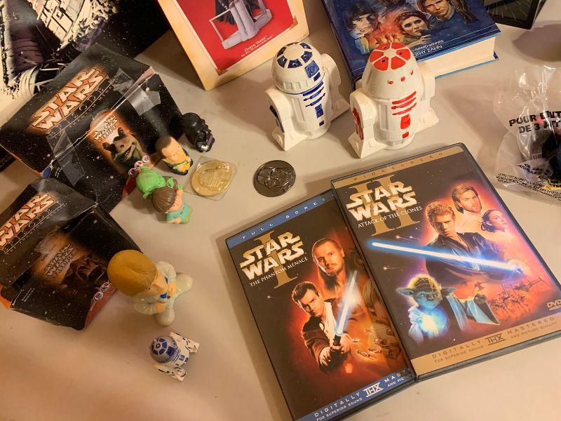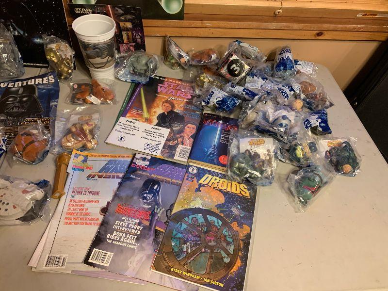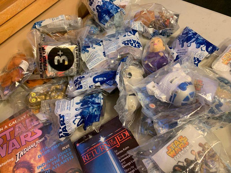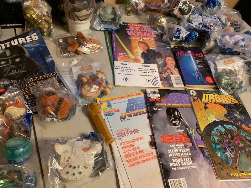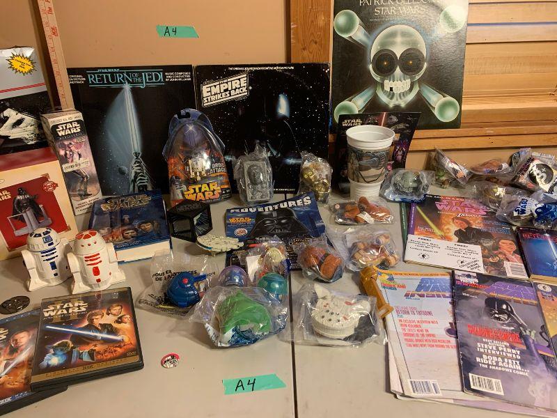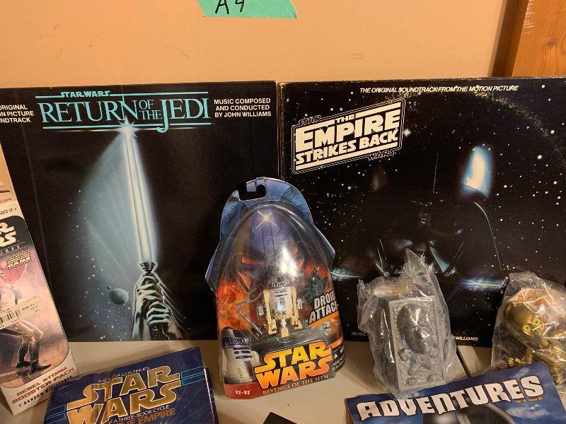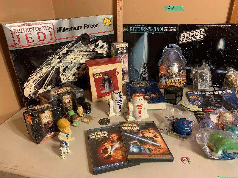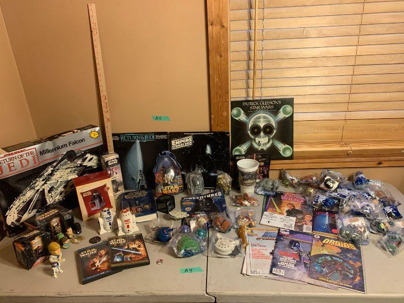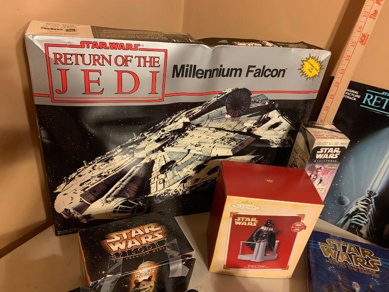 New in box - Star Wars Return of the Jedi Millennium Falcon, The Empire Strikes Back original sound track LP, Return of the Jedi original Sound Track LP, Burger King Star Wars Toys new in package over 30 items, New rebel storm booster pack, Hallmark new Darth Vader and Star Wars 1 + 2 DVDs and more!!