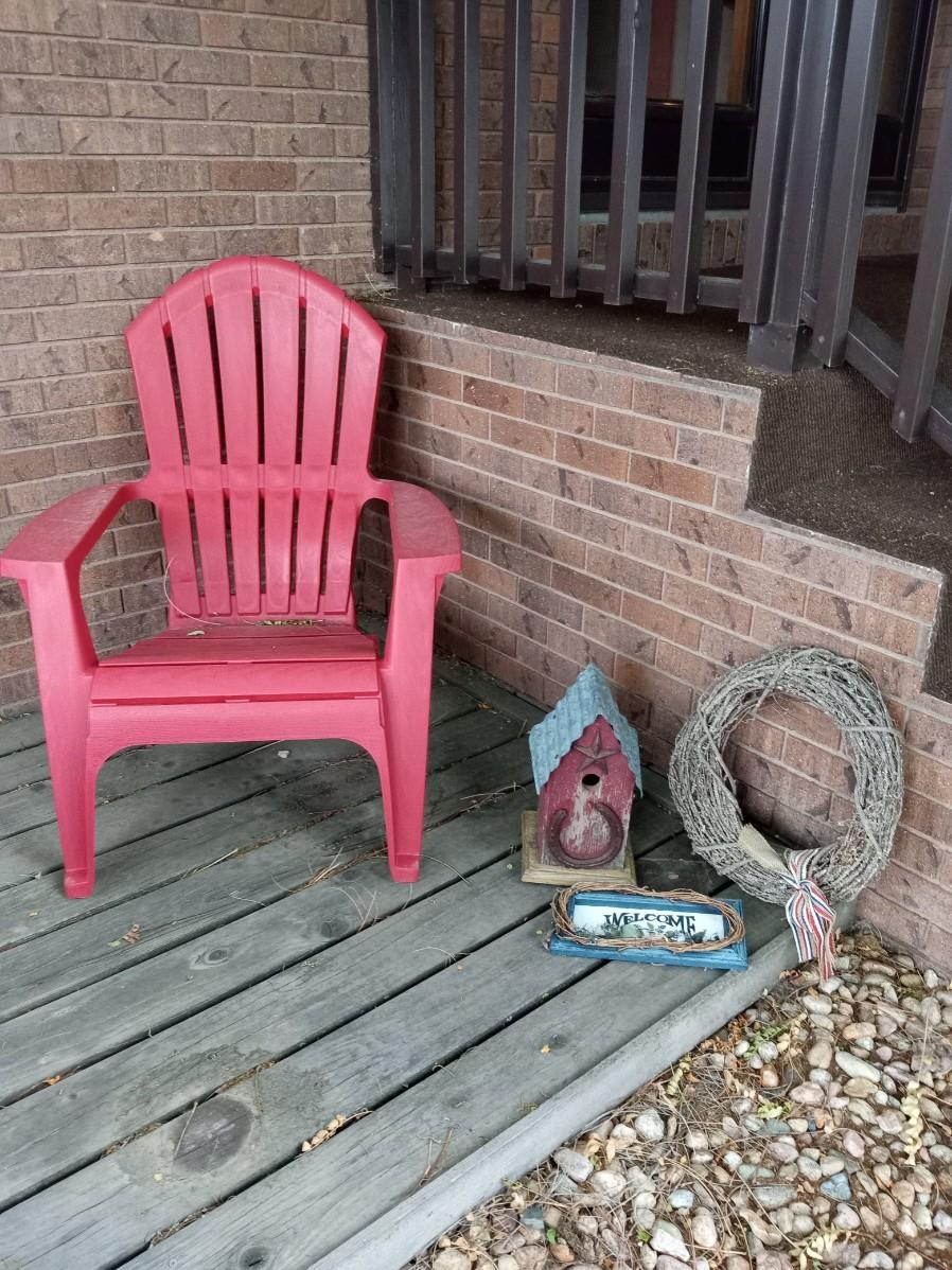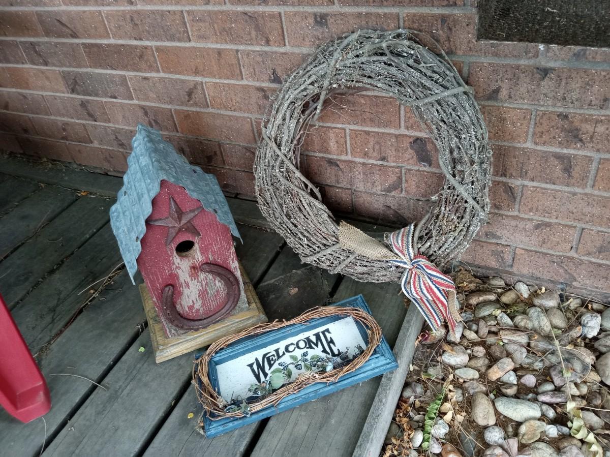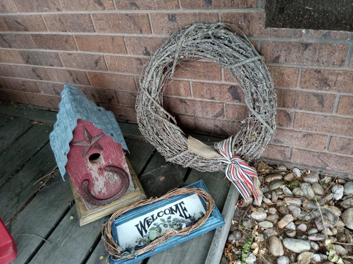 LOT 454 ADIRONDACK CHAIR, BIRDHOUSE, WREATH AND A WELCOME SIGN