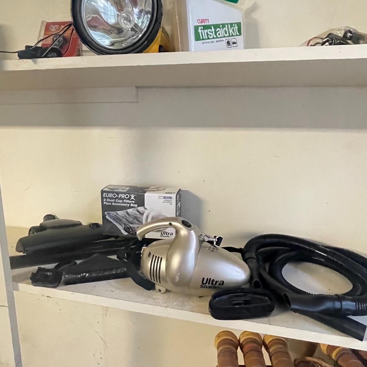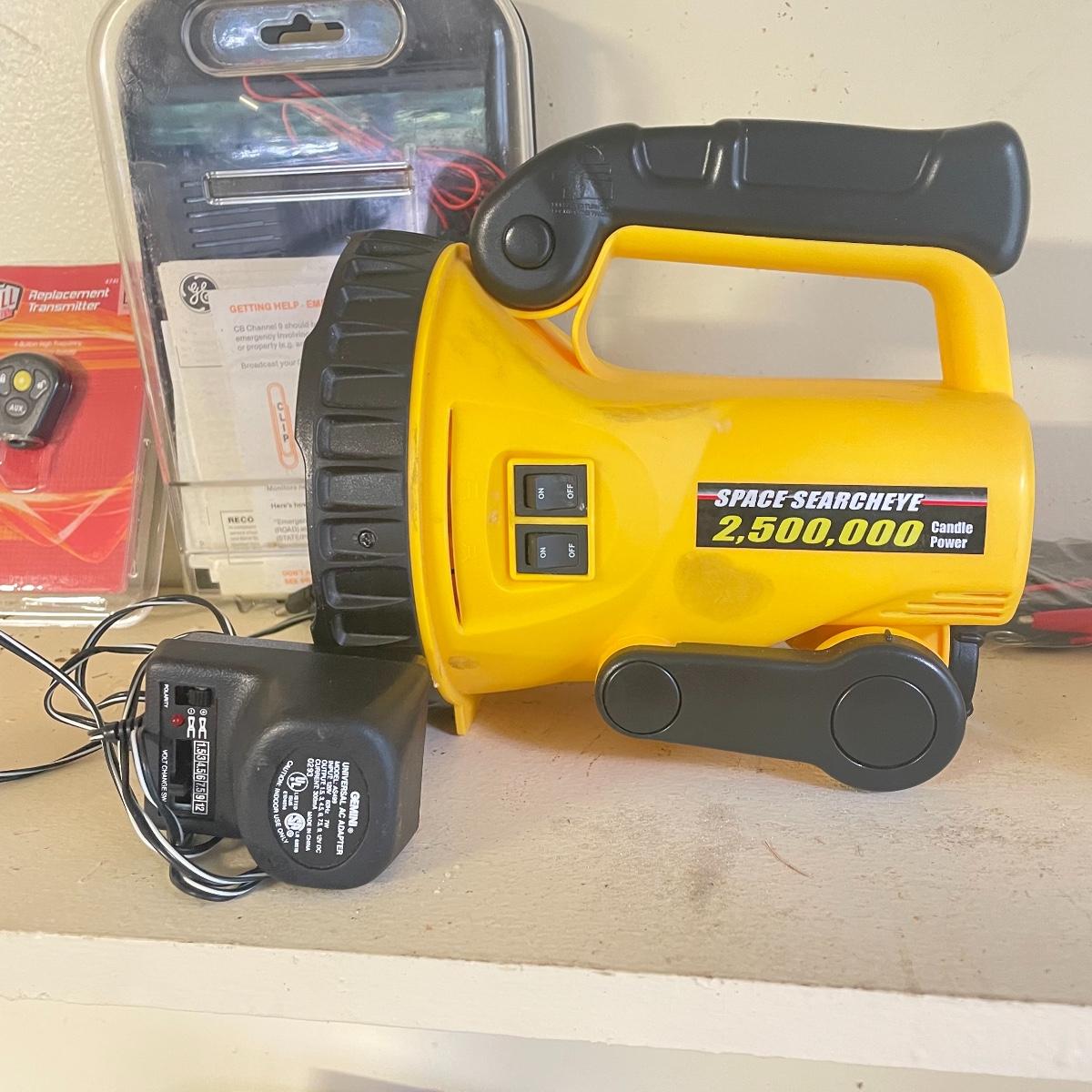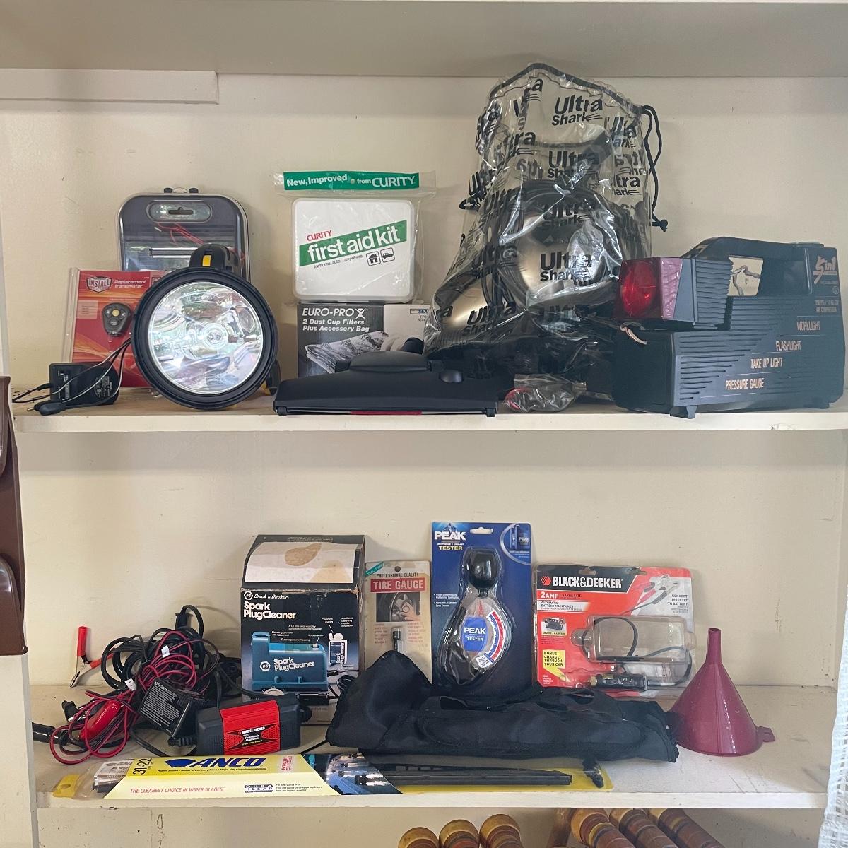 With all the cellular dead zones in WNC, be prepared with these safety items. Safety items include a GE HELP! 40 channel 2-way emergency CB radio, an unopened first aid kit (age unknown), a massive flashlight with adapter and battery capabilities from Space Searcheye. This flashlight shows when it connects to power, but the light doesn’t turn on and probably either needs to charge or needs a new battery. Lot also features a Shark Ultra hand vacuum with plenty of accessories. Hand vac needs to be connected to power outlet and turned on when tested. Other must haves are a Black+Decker 12V battery charger, windshield wipers (model# in photos), an over the seat organizer with three pockets and more! See photos for more information. Local pick up only.