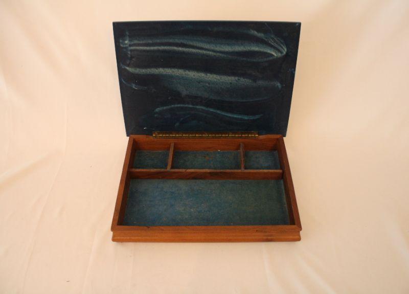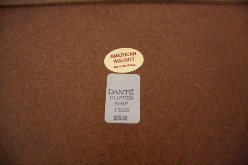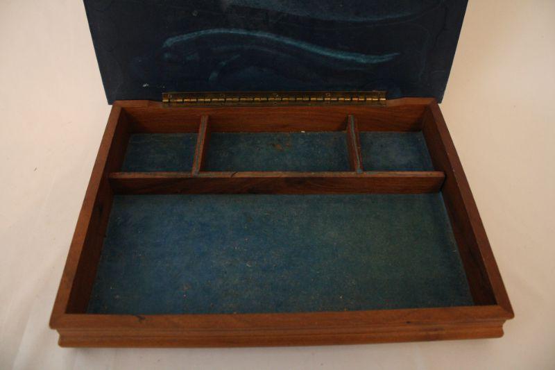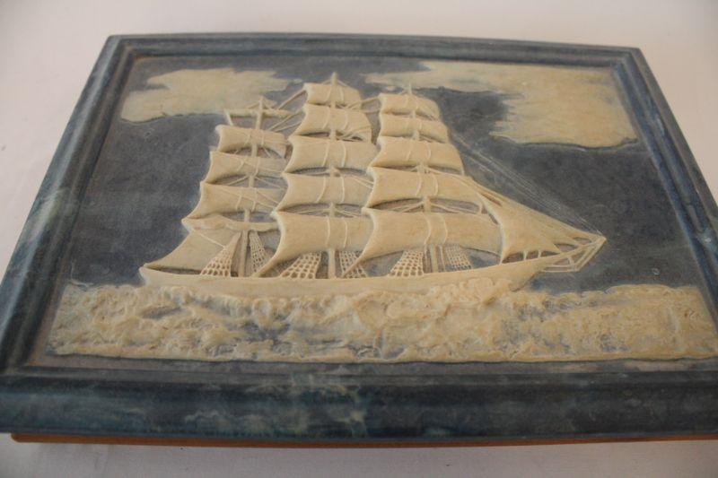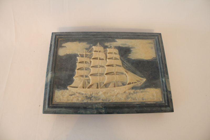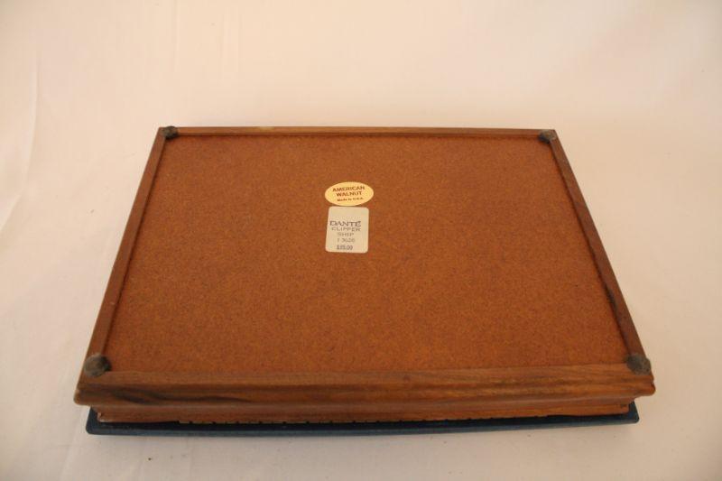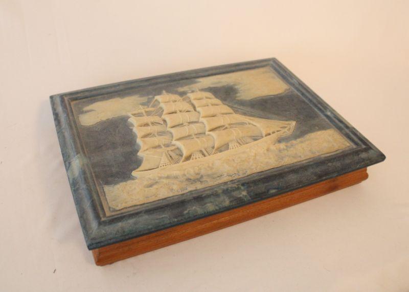 American Walnut and Blue Incolay Dante Clipper Ship Dresser Box - Vintage hinged box featuring a clipper ship. The lid is made of carved stone material and the box is made of walnut. Measures 12" inches by 8 3/4" inches.