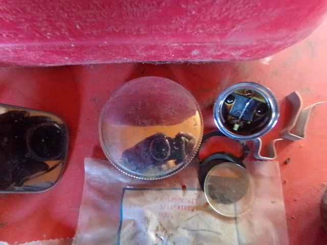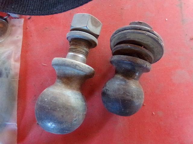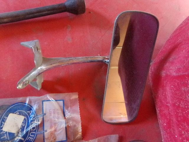 ANTIQUE FORD PART AND OTHER CAR PARTS ALONG WITH A GAS CAN AND 2 HITCH BALLS.