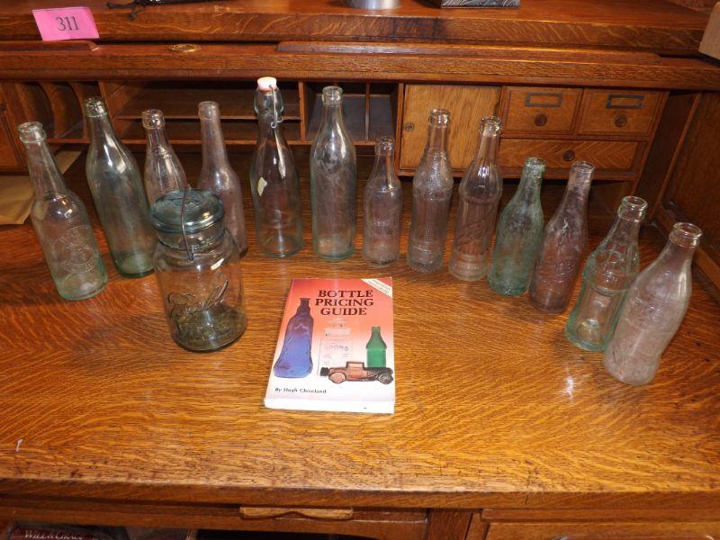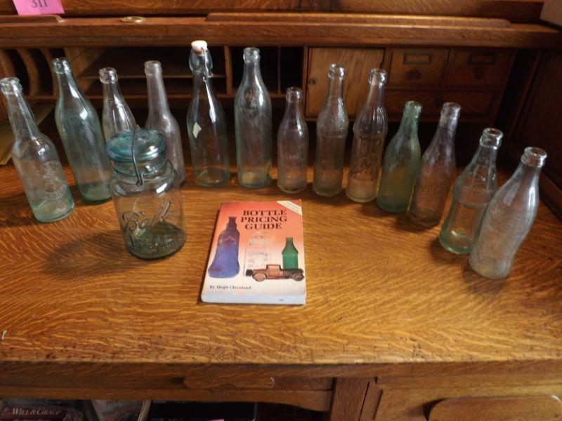 ANTIQUE BEER, AND SODA BOTTLES, INCLUDING COORS, DR PEPPER, COKE, AND OTHERS. BLUE BALL JAR, AND BOTTLE PRICING GUIDE BOOK.