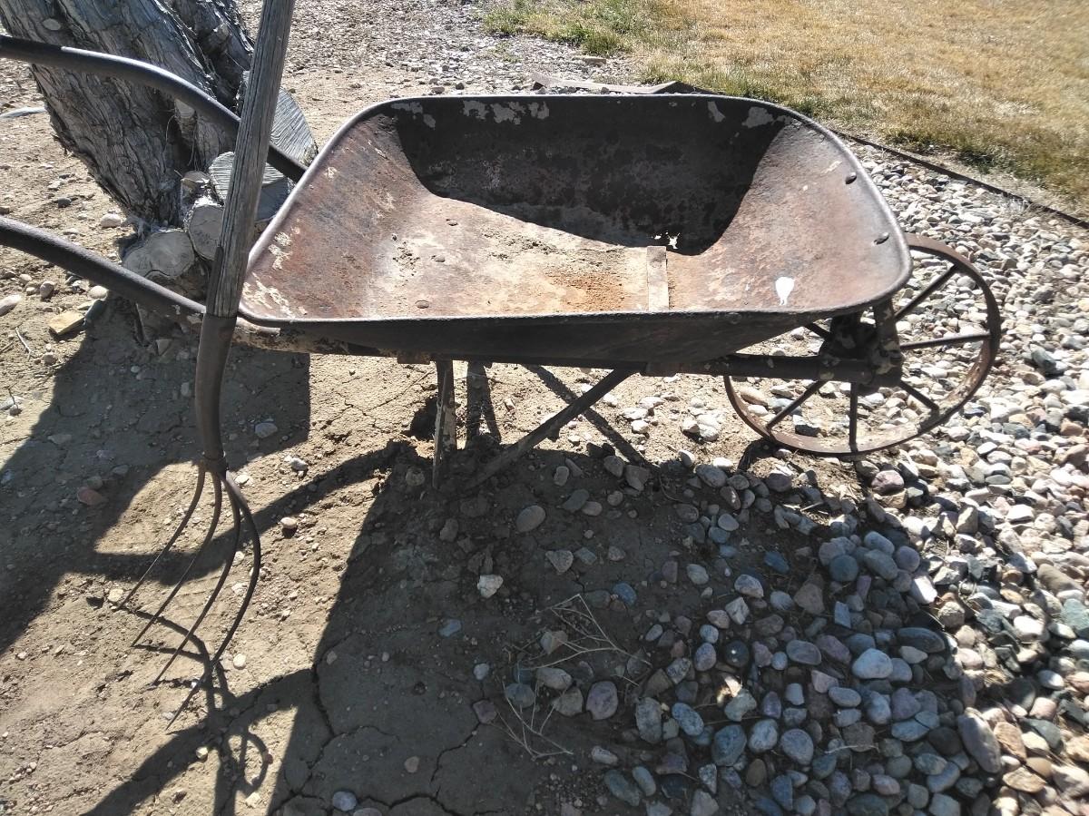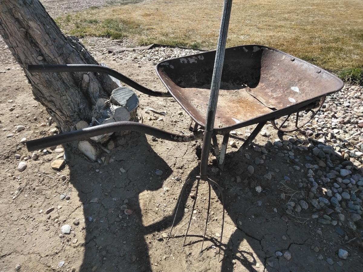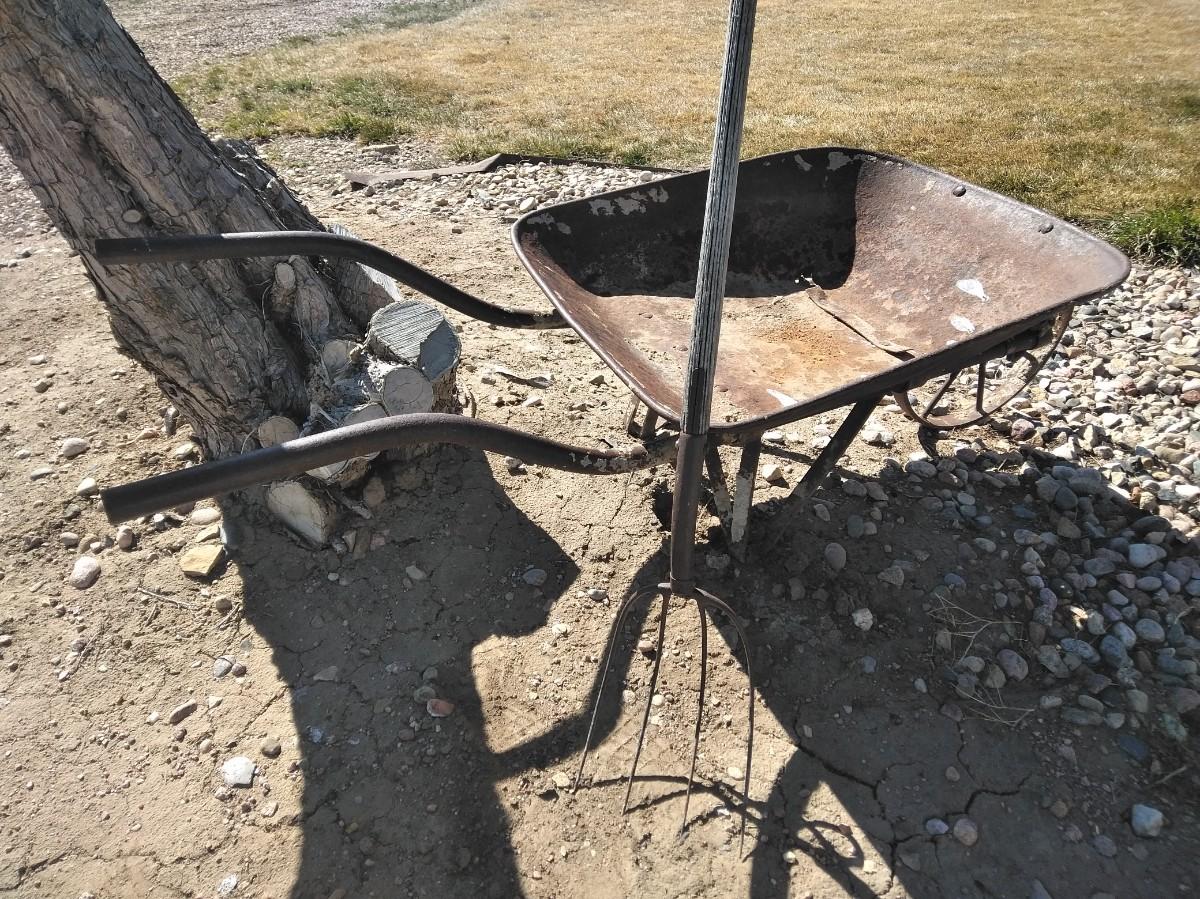 ANTIQUE METAL WHEELBARROW AND PITCHFORK