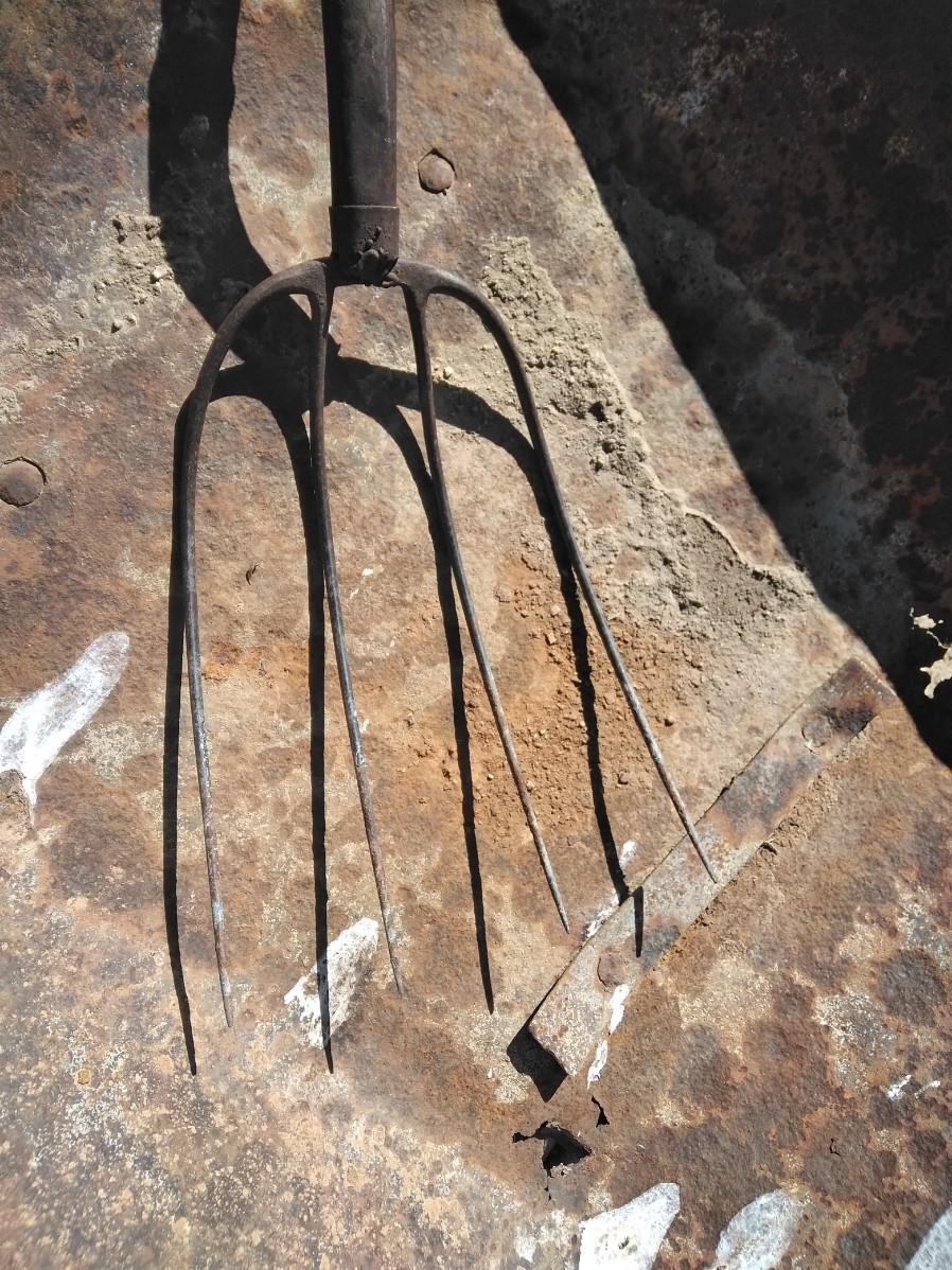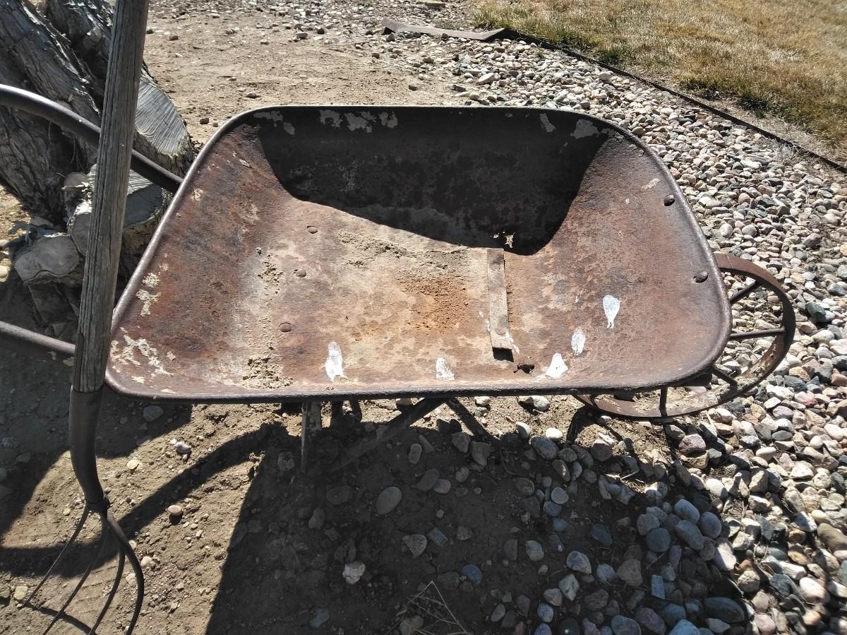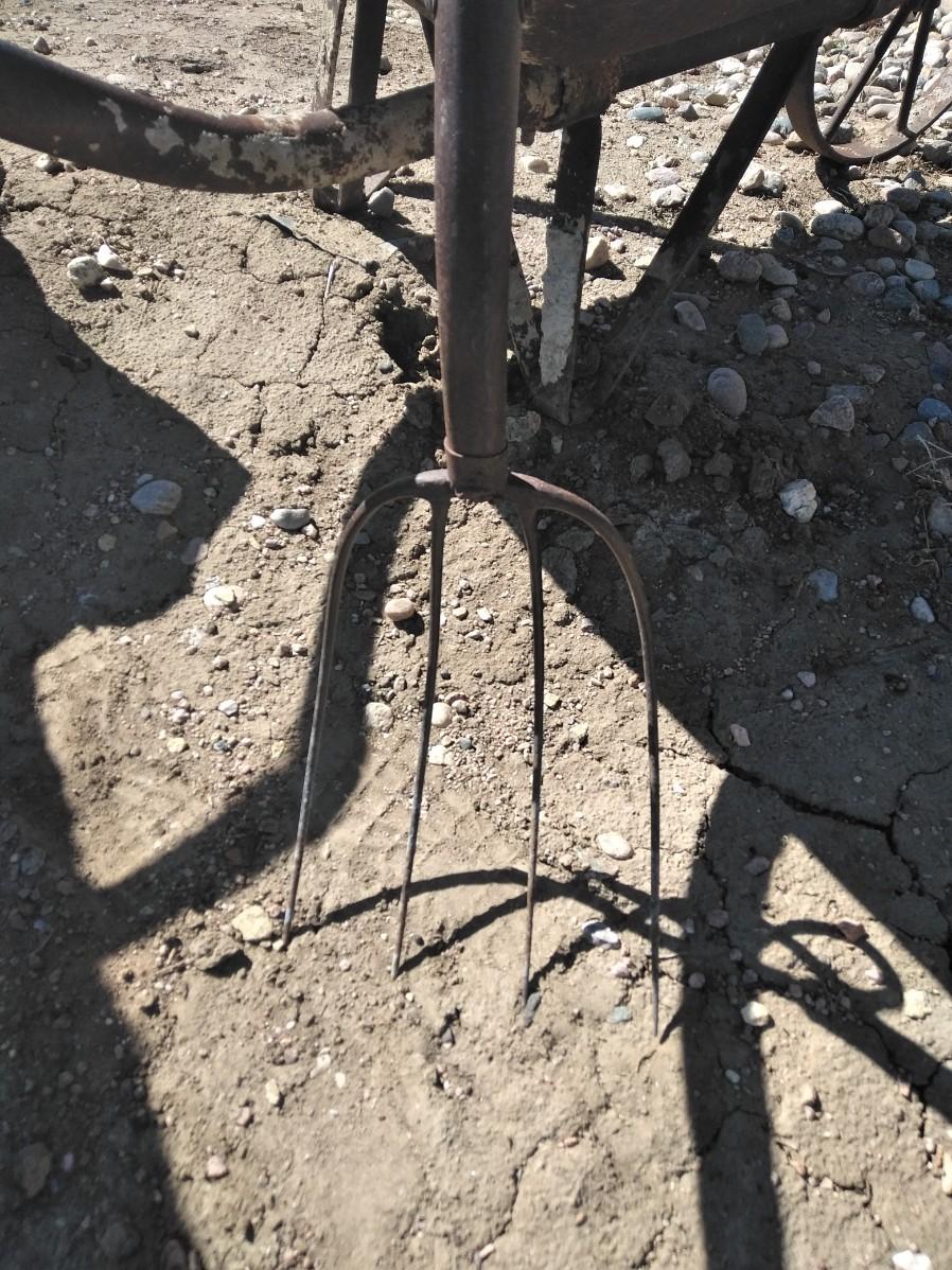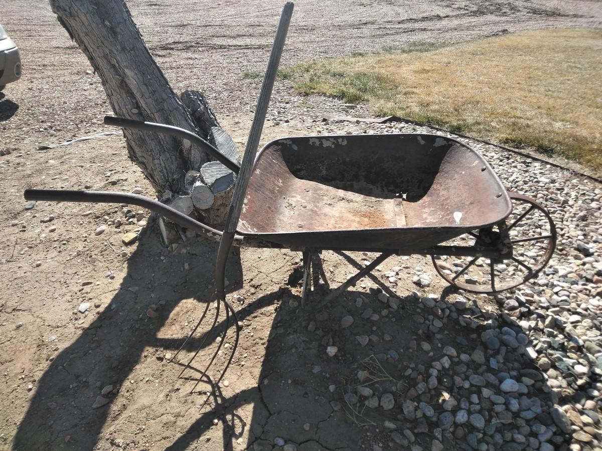 ANTIQUE METAL WHEELBARROW AND PITCHFORK