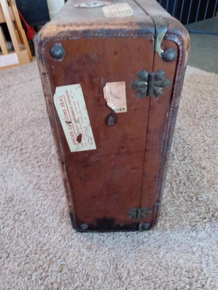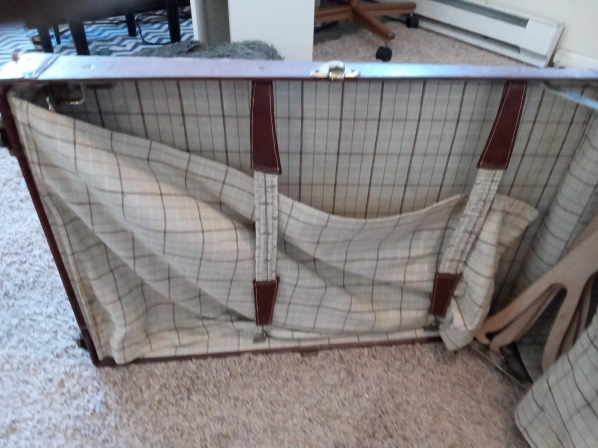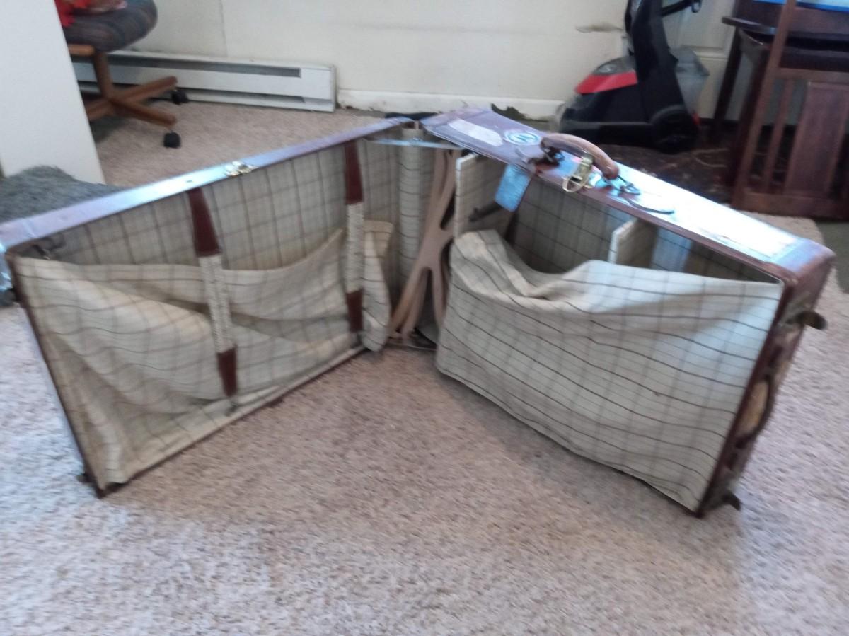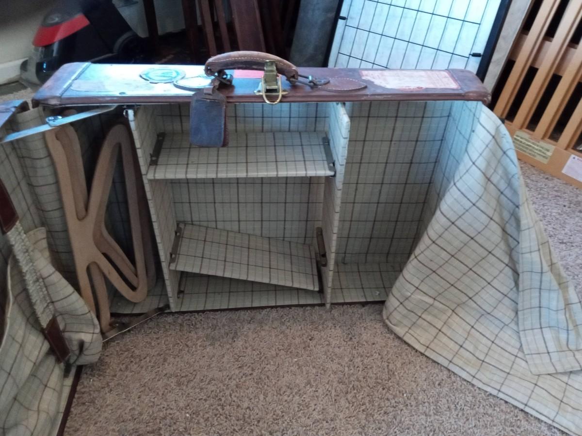 THE SUITCASE OPENS LIKE A STEAMER TRUNK AND IS IN GOOD SHAPE FOR ITS AGE. IT MEASURES 29" X 9" X 20"