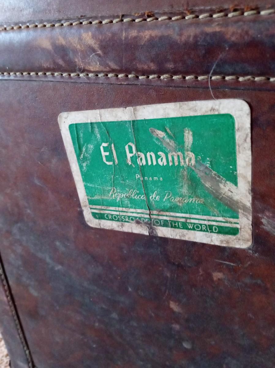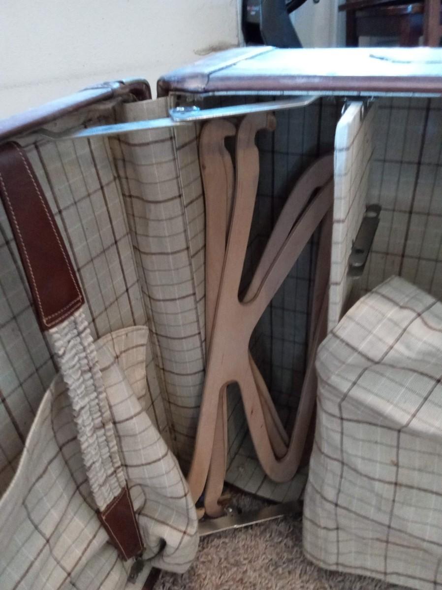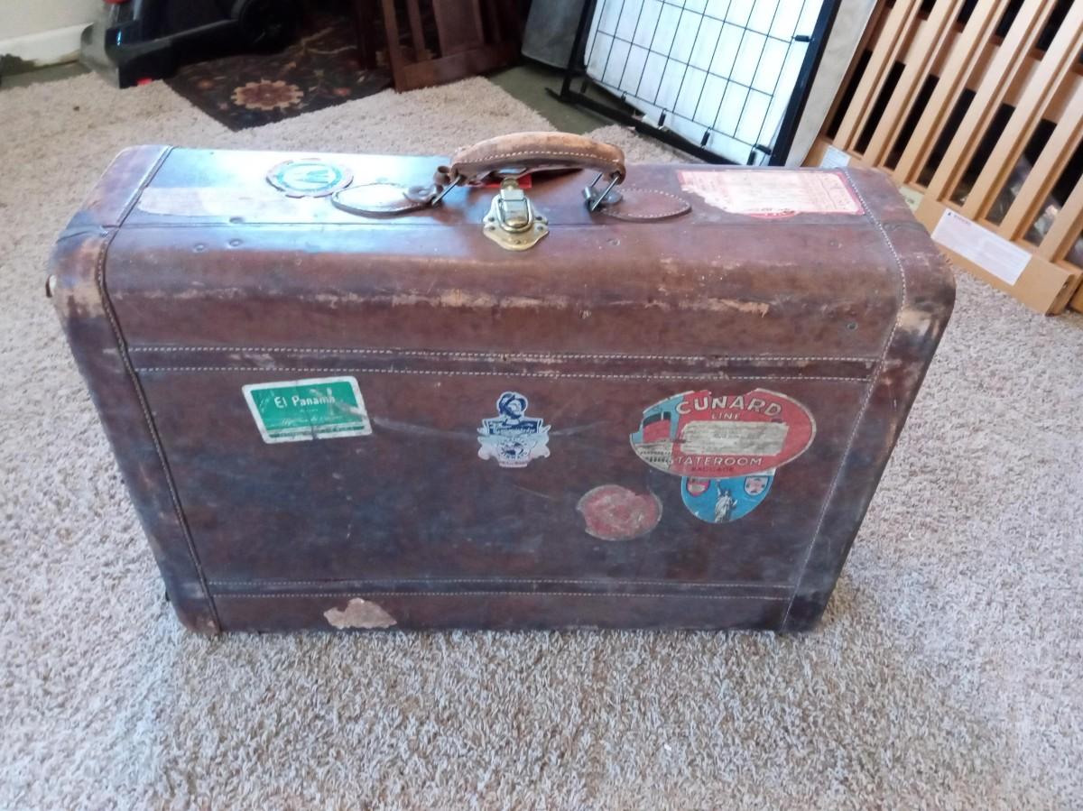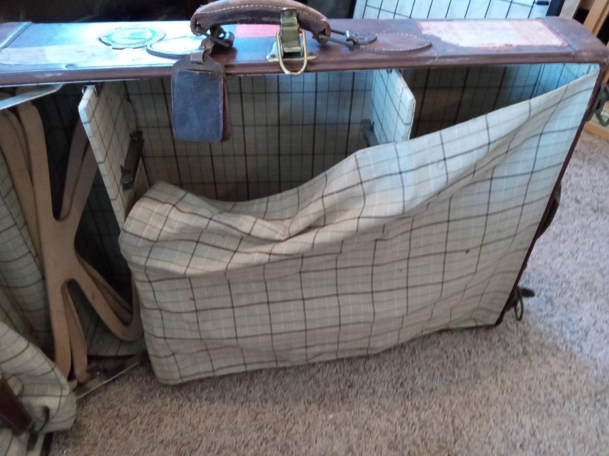 THE SUITCASE OPENS LIKE A STEAMER TRUNK AND IS IN GOOD SHAPE FOR ITS AGE. IT MEASURES 29" X 9" X 20"