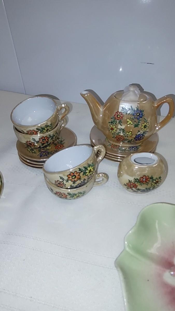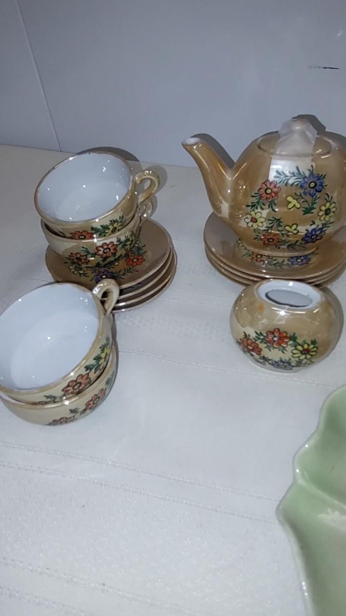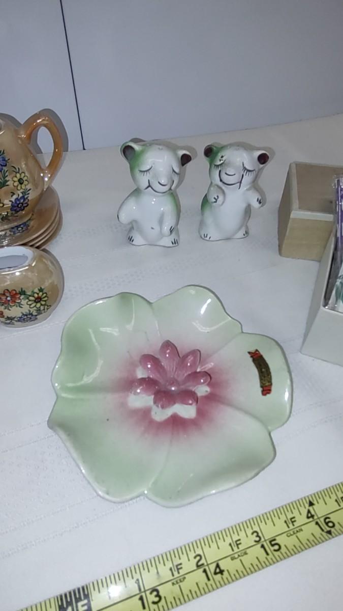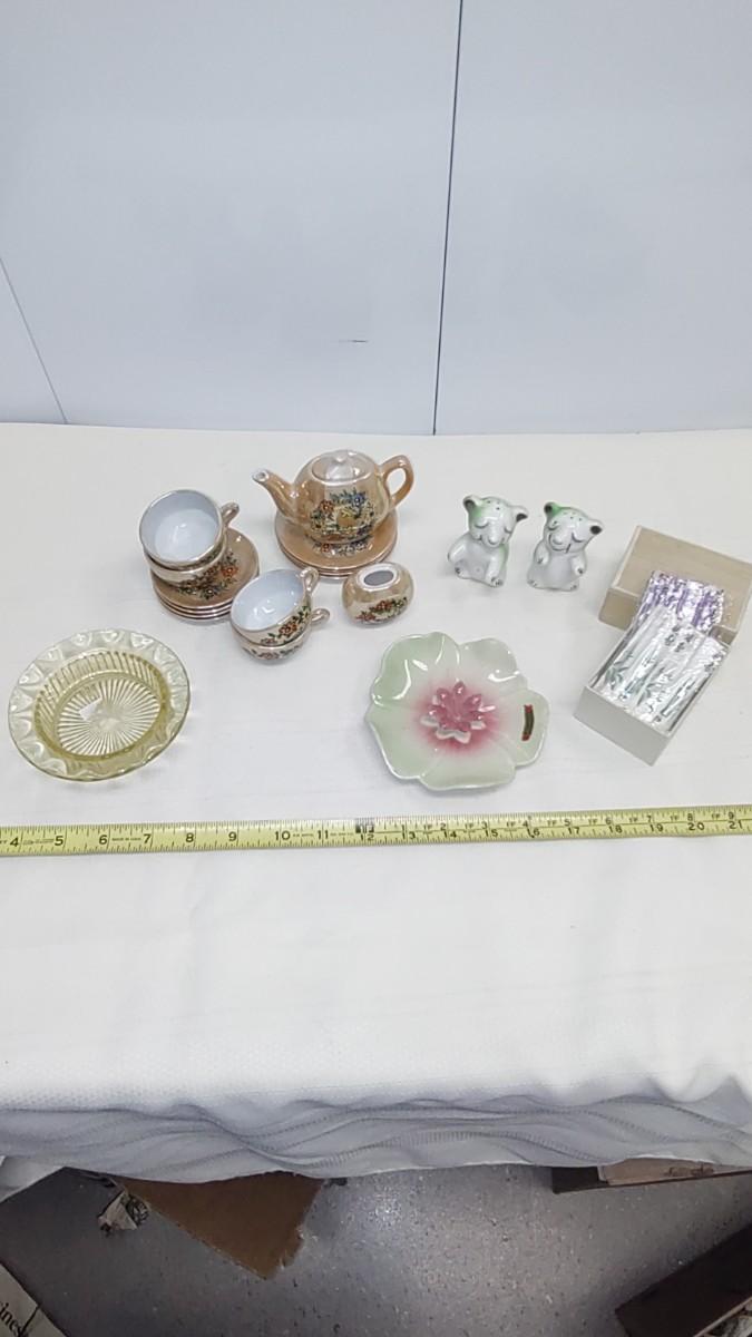 JAPANESE TEA SET 4 PLATES, 4 CUPS, 4 SAUCER, A TEAPOT, A BOX OF FORTUNE TELLING TOOTHPICKS, PANDA SALT AND PEPPER SHAKERS, A FLOWER DISH AND ASHTRAY