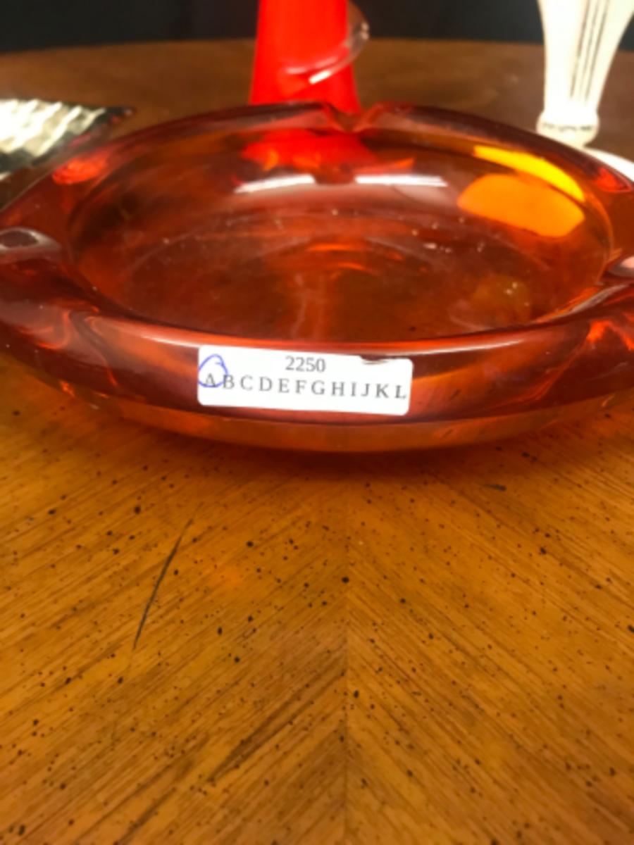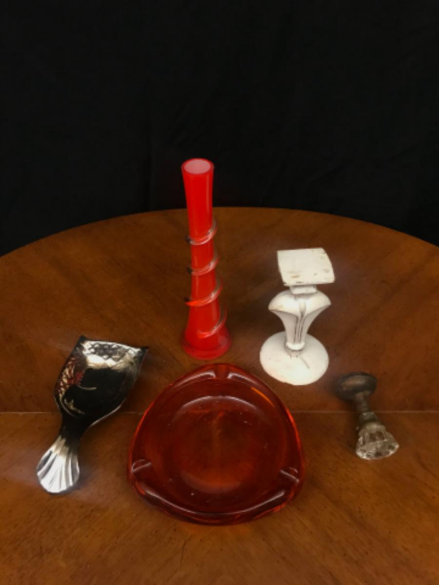 home decor:lot assortage vintage items, orange MCM ashtray, white cast iron candle holder (or door stop), owl spoon rest, vintage door knob, MCM red-orange vase ;