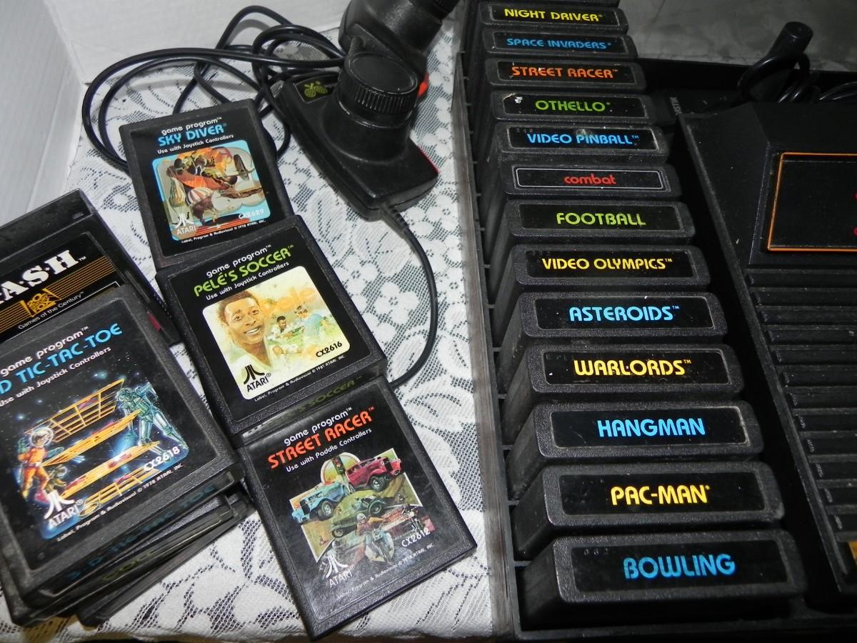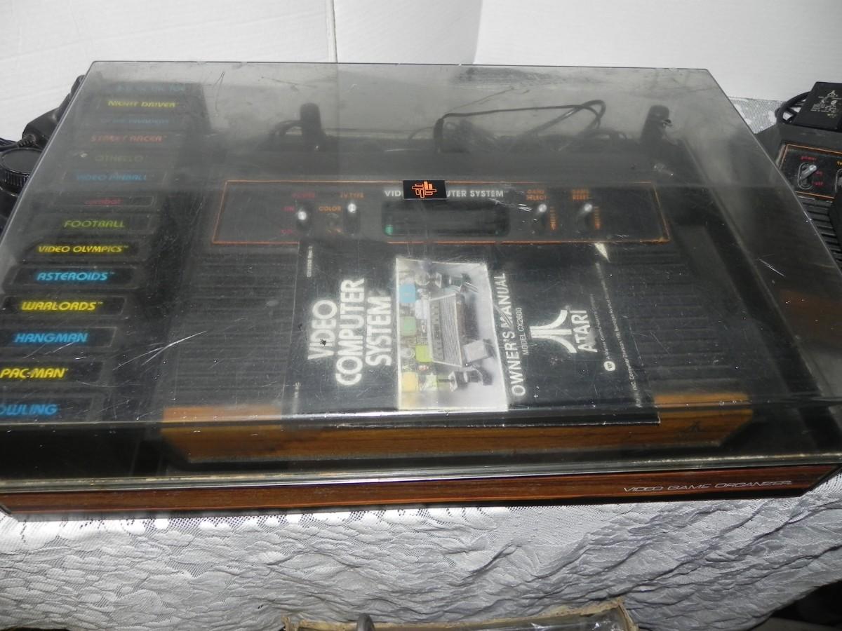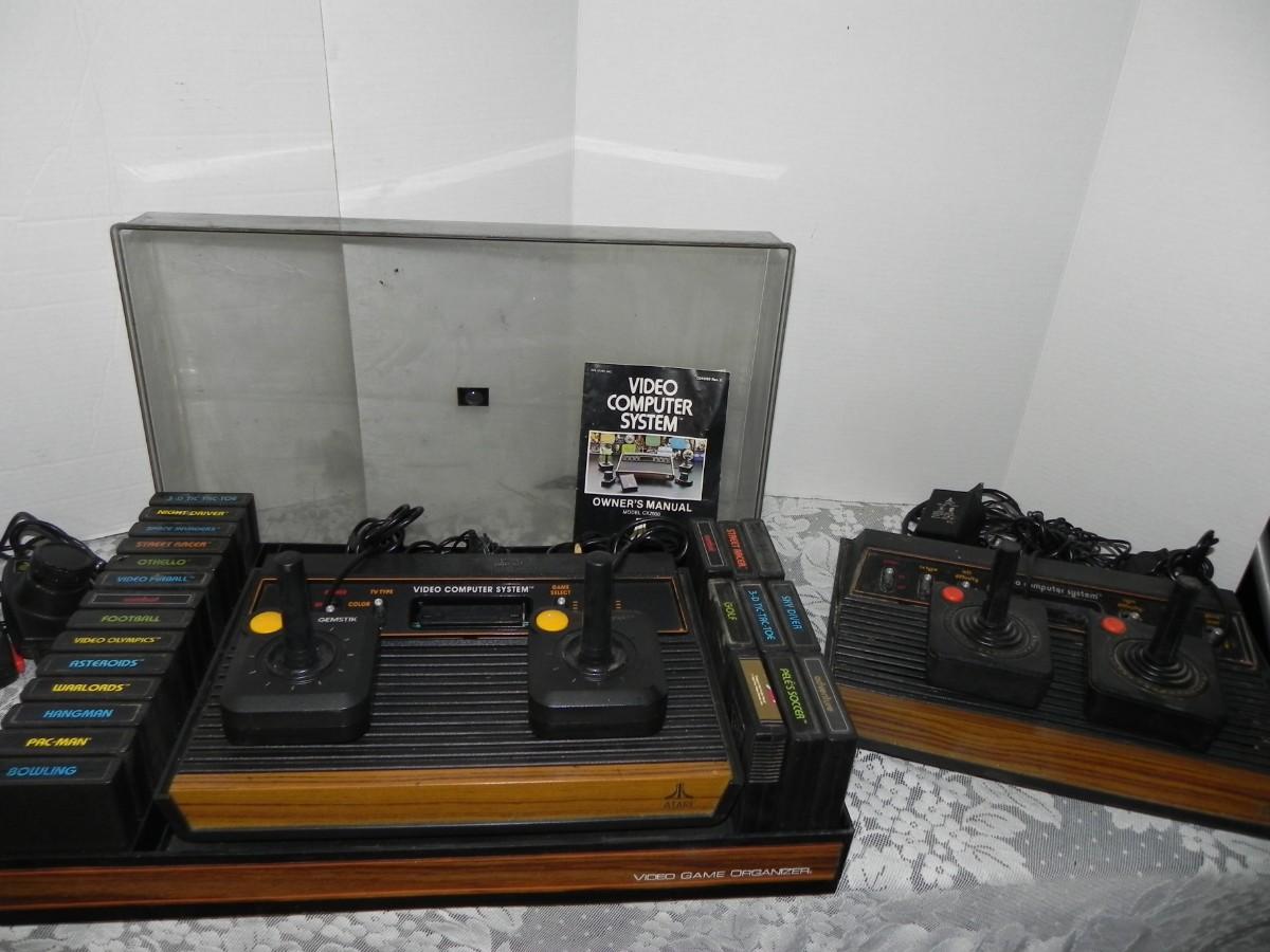 2 ATARI GAME CONSOLES MODEL CX2600 THE ONE COMES IN ITS ORIGINAL VIDEO GAME ORGANIZER WITH JOYSTICKS-PADDLES -GAMES AND WORKS PER SELLER. HAS ALL CORDS. THE SECOND ONE HAS JOYSTICKS AND WIRES BUT DID NOT GET IT WORKING SO (FOR PARTS?).