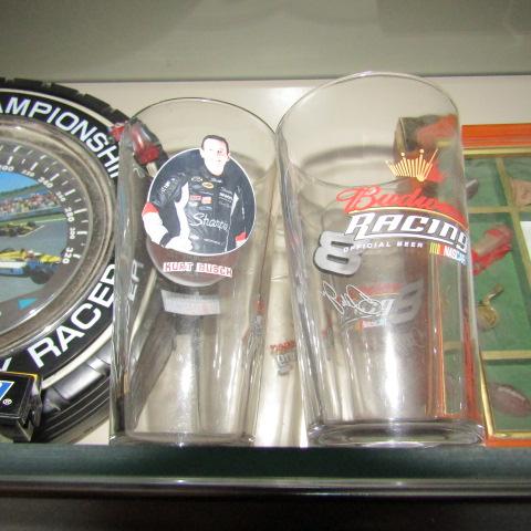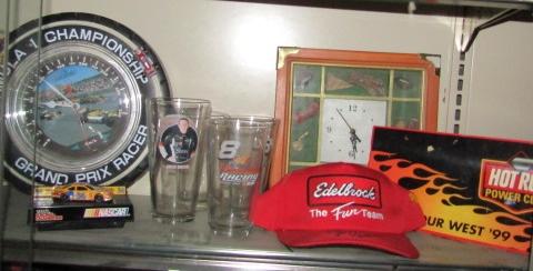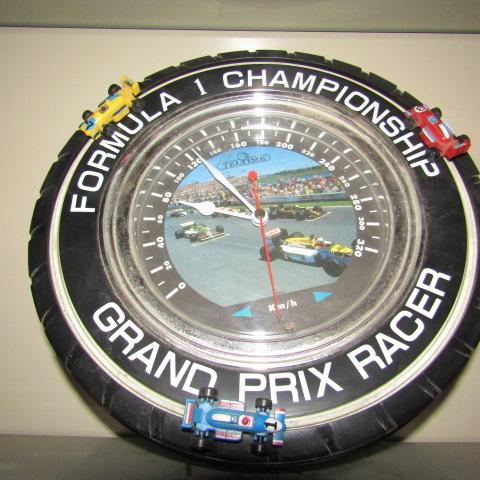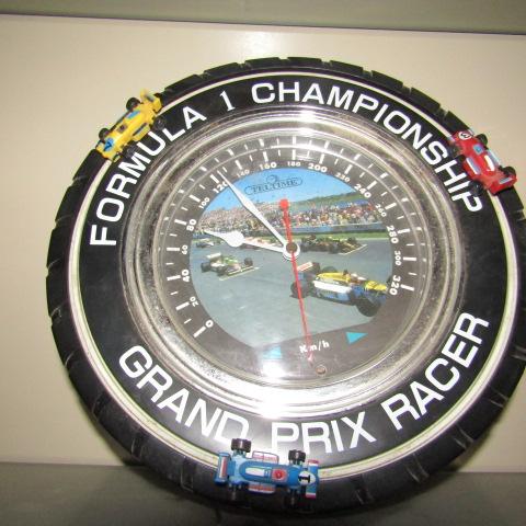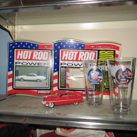 GRAND PRIX RACER WALL CLOCK, BALL CAPS, DRINKING GLASSES, SMALL HOT WHEEL LIKE CAR, 2 HOT ROD 2002 TOUR FRAMES & MULTISPORT WALL CLOCK
