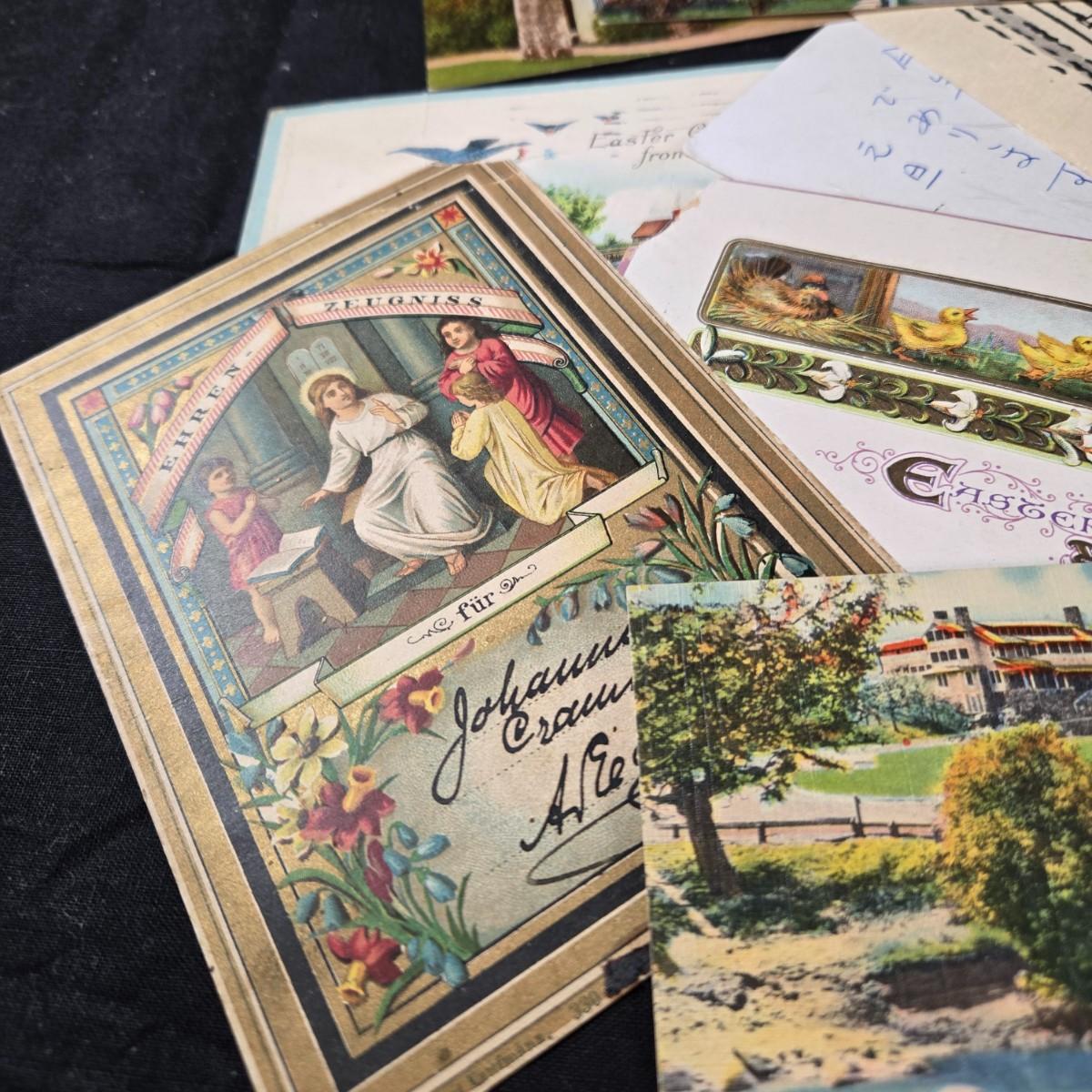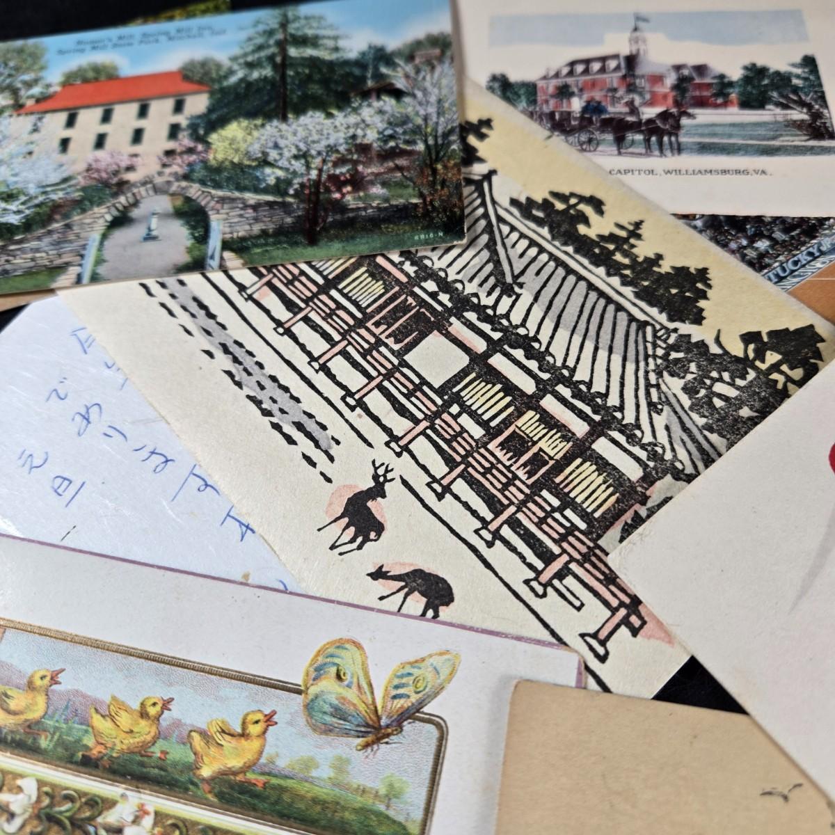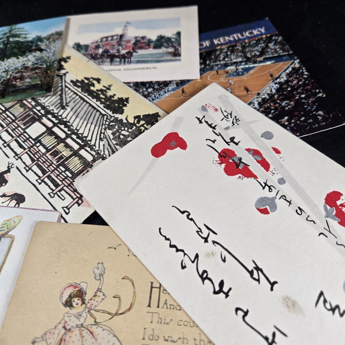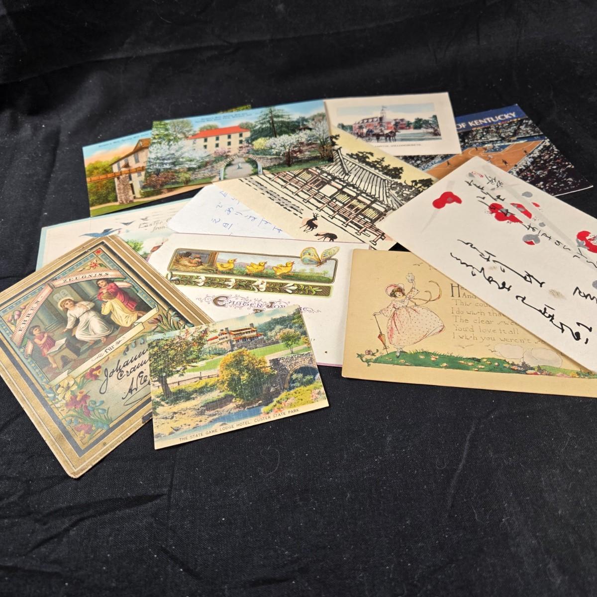 This auction is for Lot B - 12 Vintage Post Cards. This grouping has various vintage style cards, A few are Foreign, 2 have damaged corners and one is a more modern U of K unused post card.