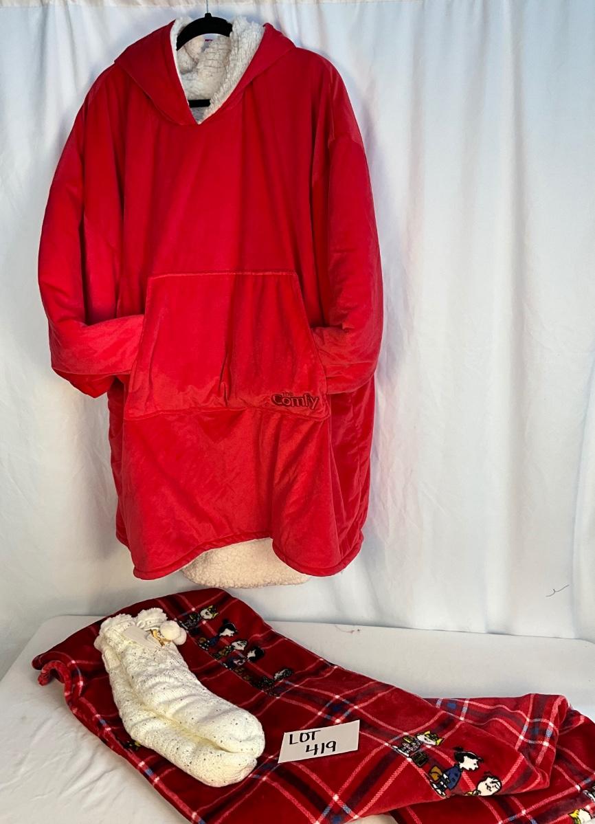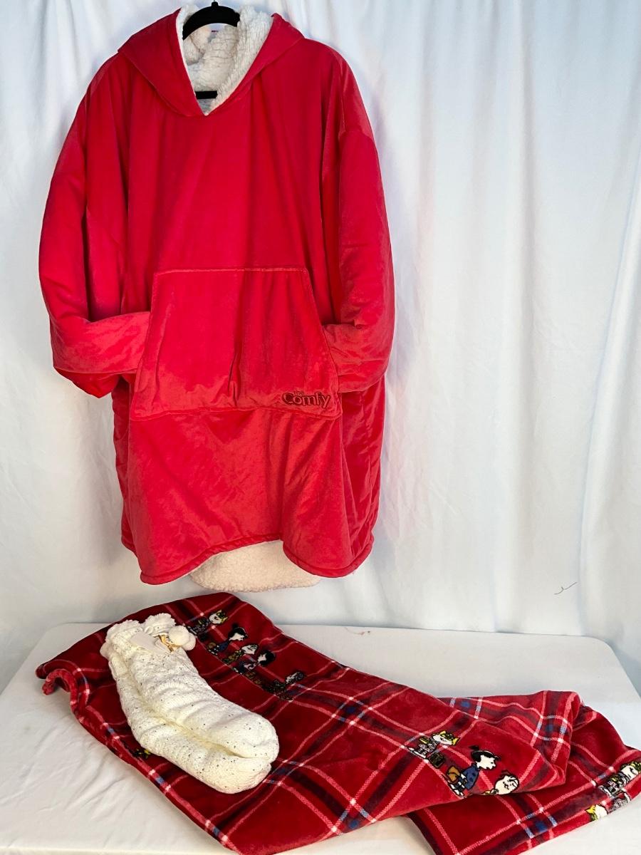 The red plush Sherpa comfy is one size, very soft and has slippers and a Peanuts throw blanket.