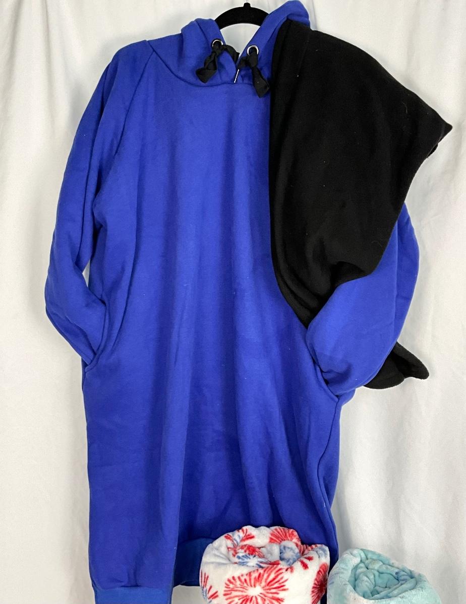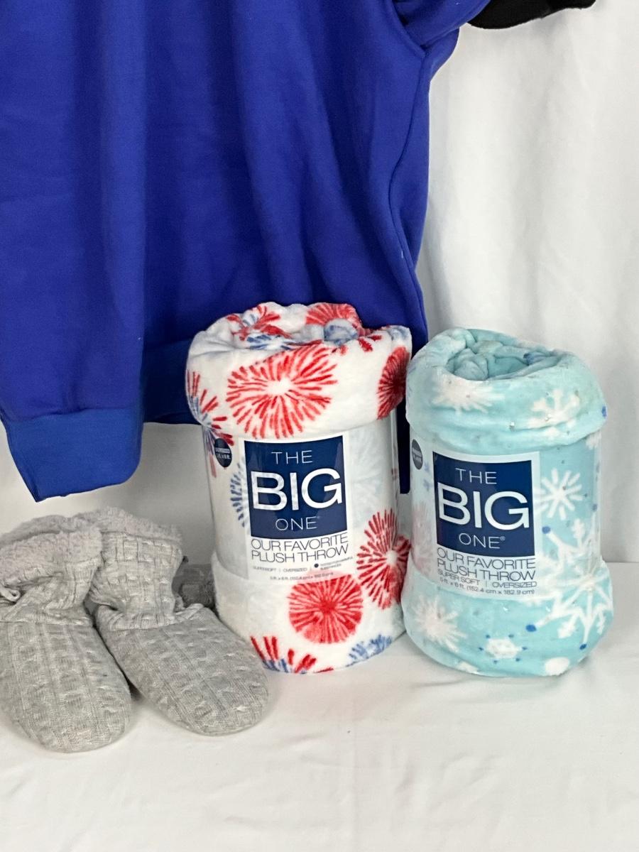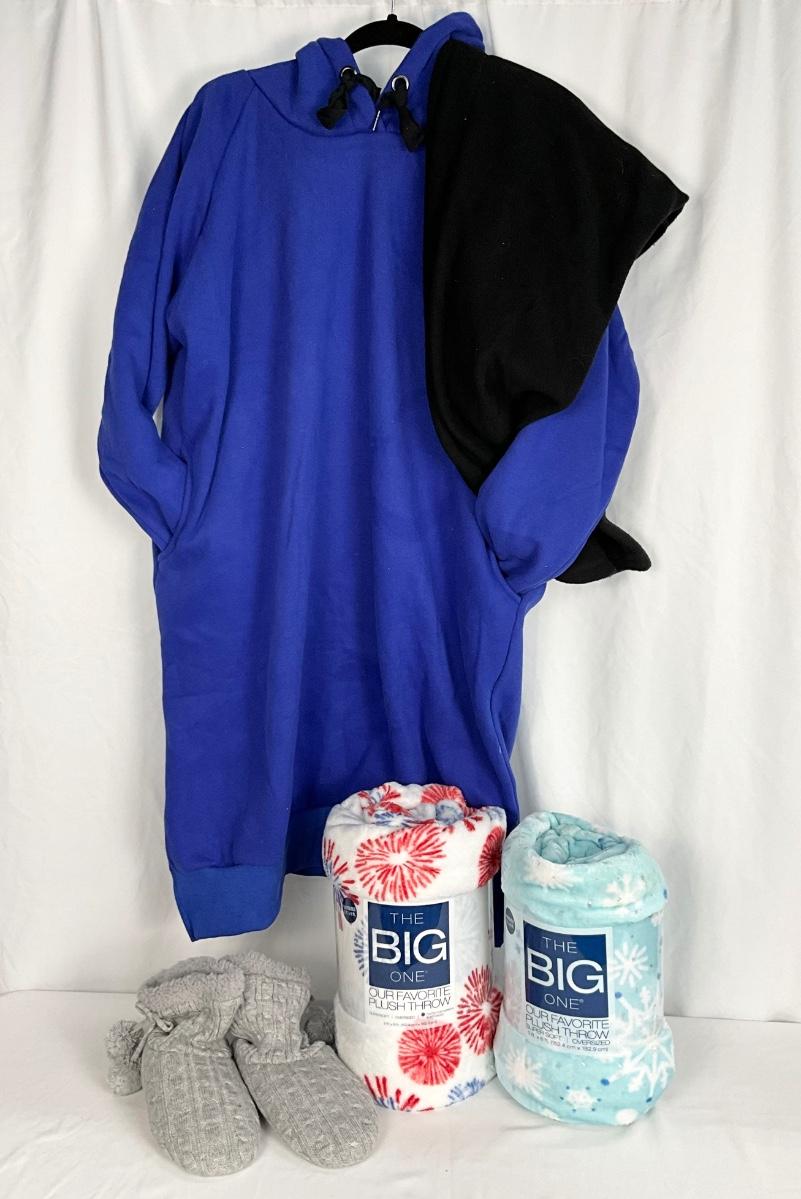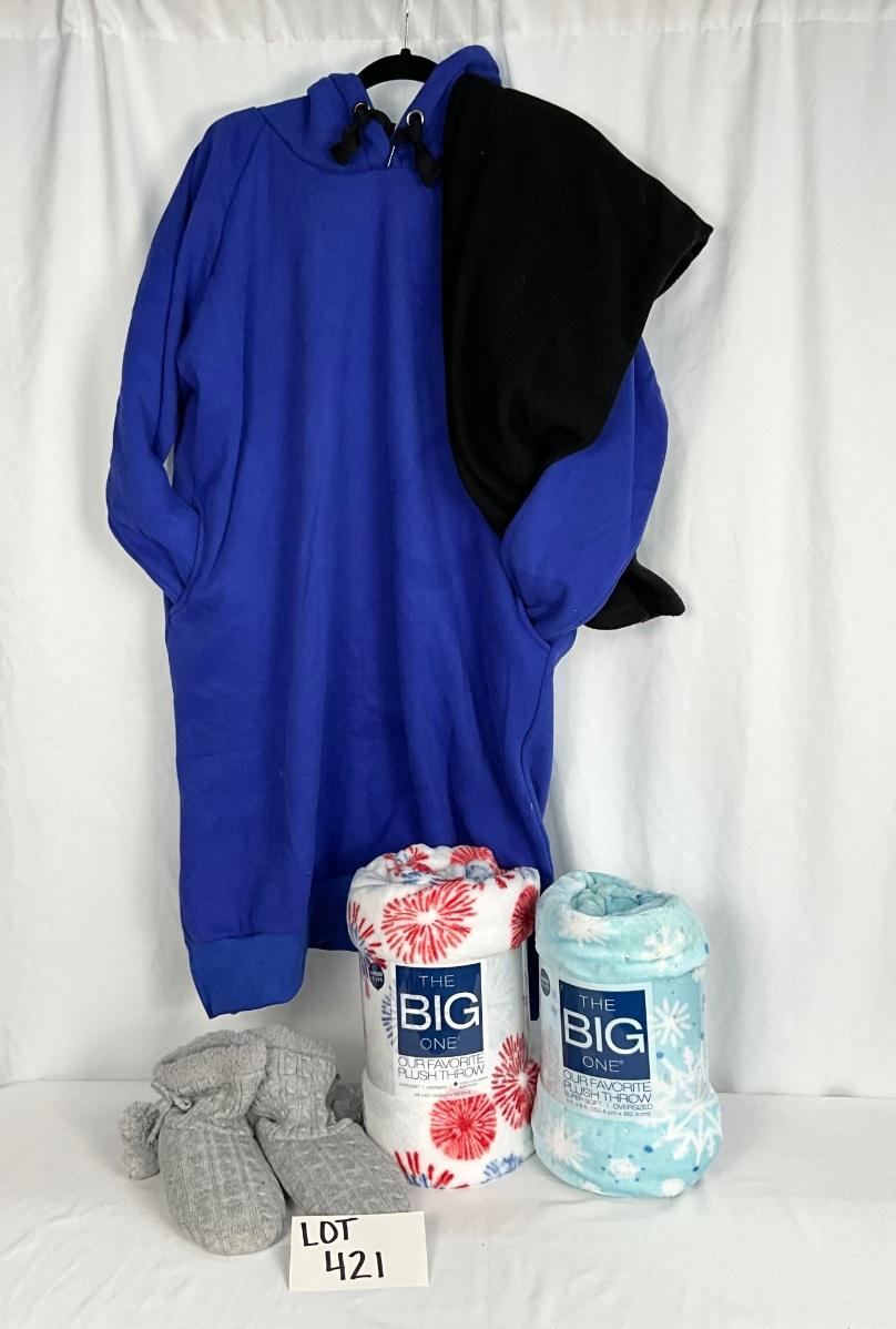 There are 2 new throw blankets from JC Penny, fleece pants (XL) oversized blue sweatshirt dress and slippers (7.5). Brands included are Tek Gear, Nutexrol and JC Penny.