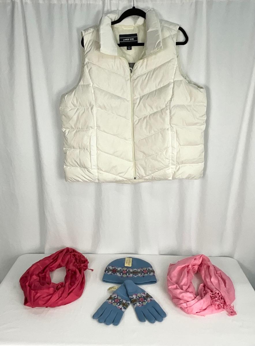 Lands’ End vest is like new, there are 2 pink scarves and a hat & glove set that are brand new with tags.