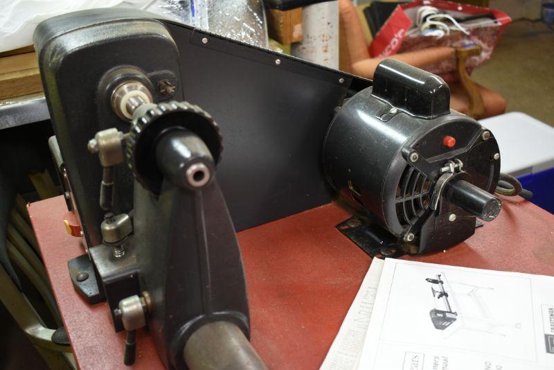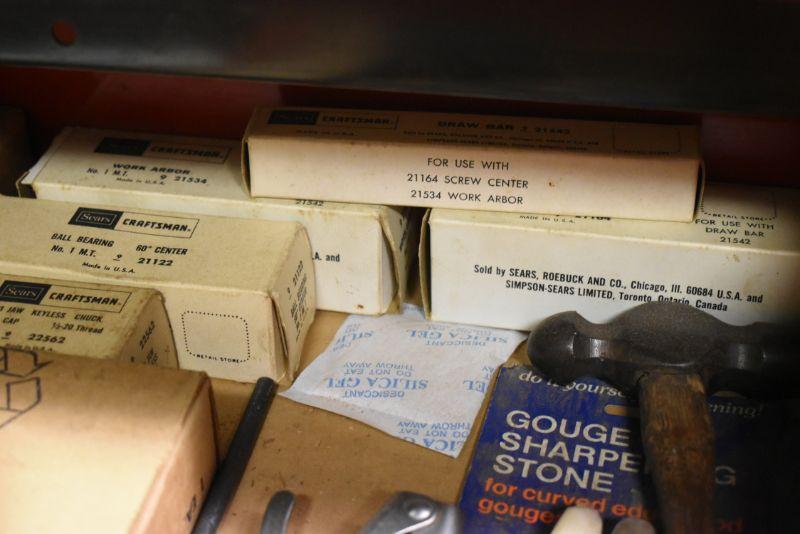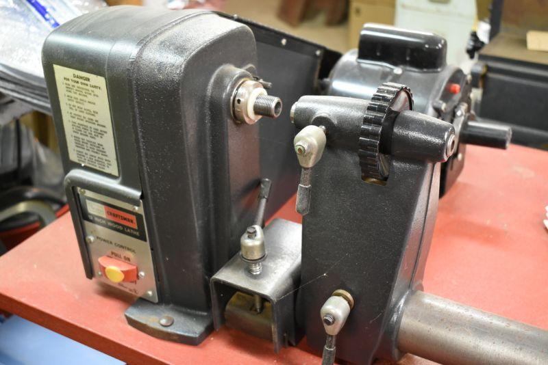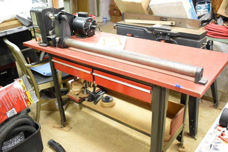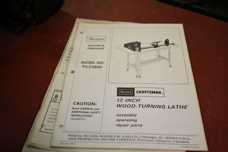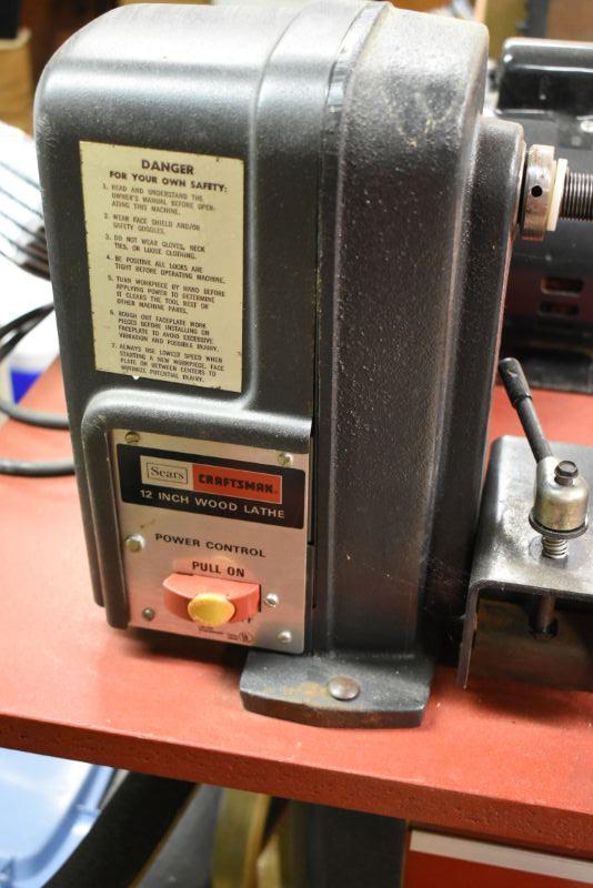 Craftsman 12 inch wood lathe, untested. Includes table. 60x25x35, tools on bottom shelf and some parts inside of drawer. Does not include sharpening stone shown in picture or chisel sets. Bring tools and help to move. Located in basement, with steep and narrow cement steps going down, with a sharp turn at bottom.