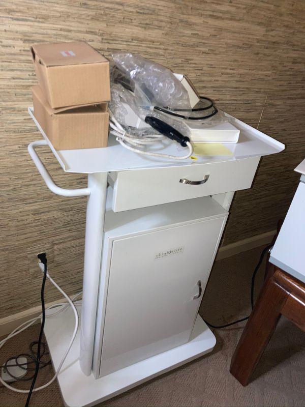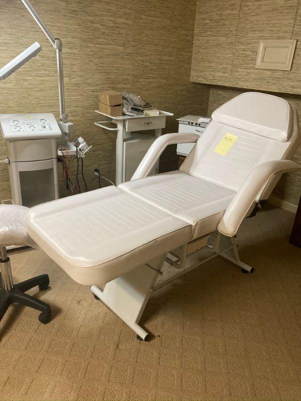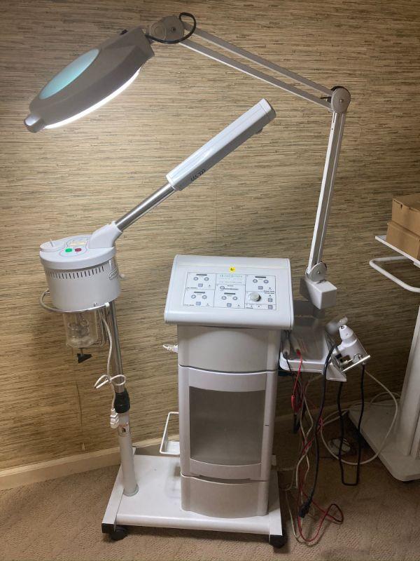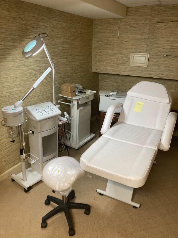 You are bidding on the skin care treatment set pictured. Included is the Pro 9 Function Care System with vacuum, spray, etc.. The chair/stool; the cabinet, and the sterlizer/towel warmer in the back corner. Various books/literature. Client bought it to start a small business in her basement but never got around to it. Everything was barely used! Total cost was over $5,000!
