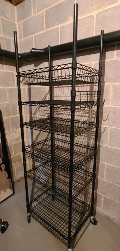 This is a great piece that can be used anywhere! Around 6 feet tall, this is on wheels so it can move around easily, has hanging rack on side, and plenty of shelves/bins for storage. Please see pics for condition and sizing