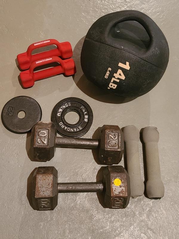 Lot of workout equipment. Pre-owned. Please see pics for condition and sizing.